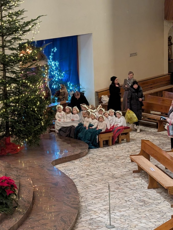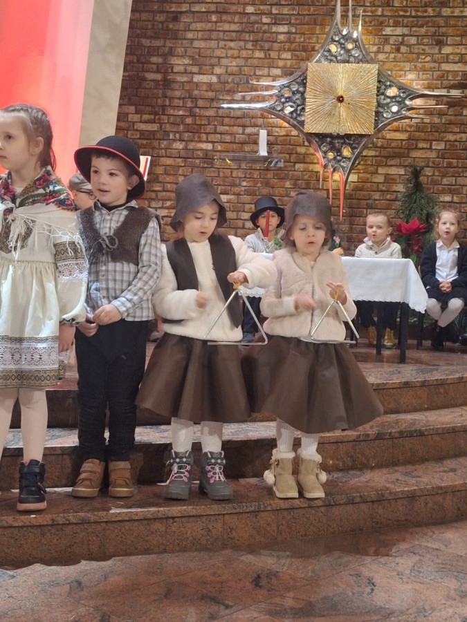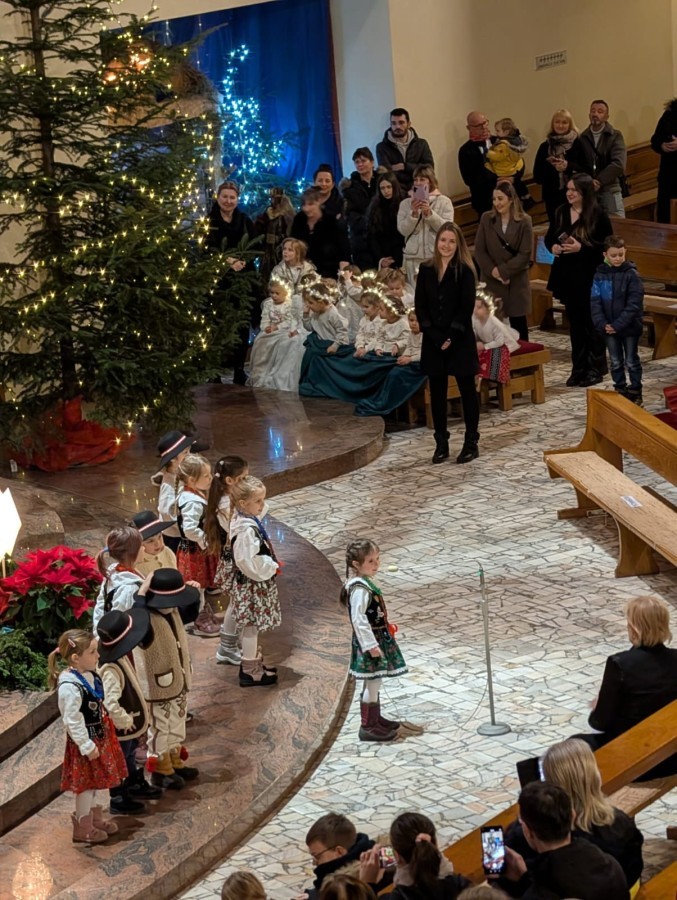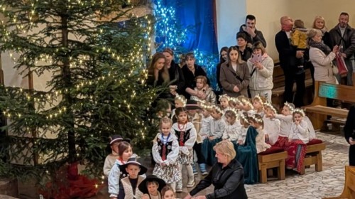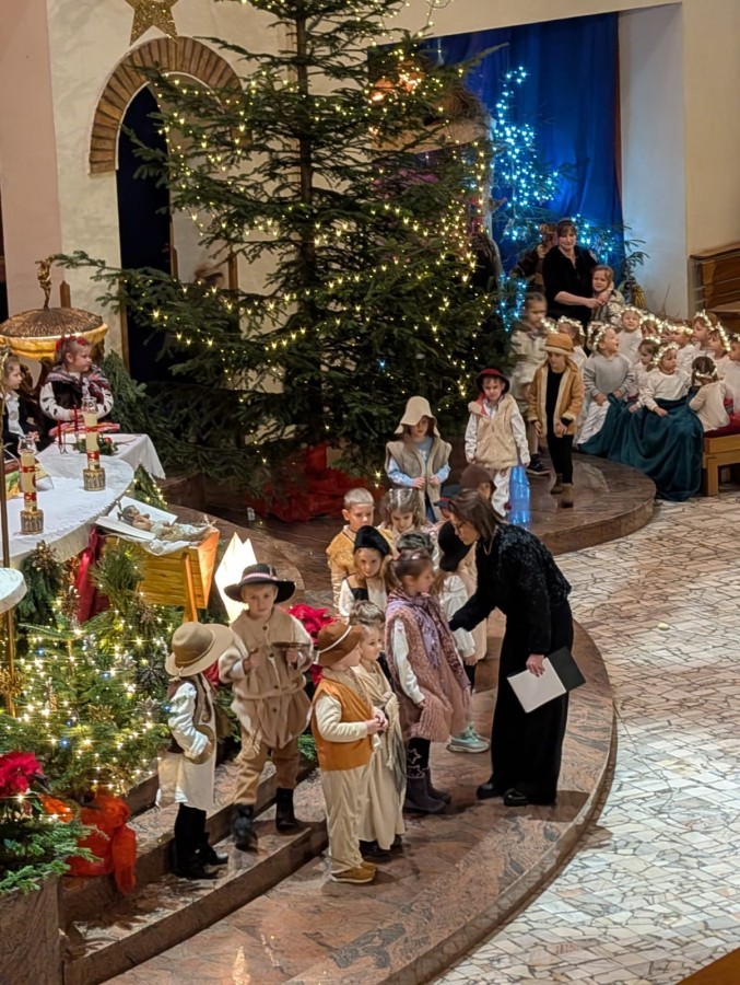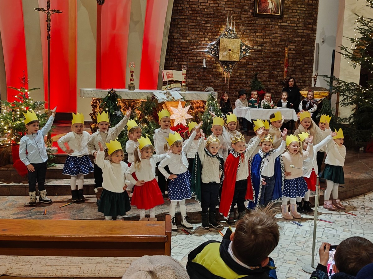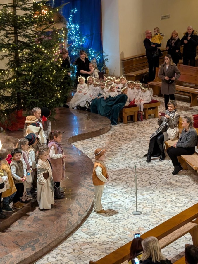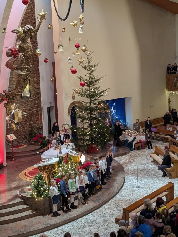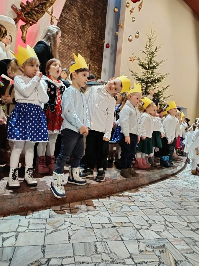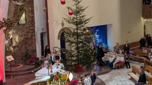 w uroczystym kolędowaniu w kościele. Mali artyści z radością zaprezentowali przygotowane kolędy i pastorałki, które śpiewali dla swoich kochanych babć i dziadków. Występ był pełen uśmiechu, zaangażowania i świątecznej atmosfery. Dzieci w ten sposób wyraziły swoją miłość, wdzięczność, szacunek oraz pamięć o babciach