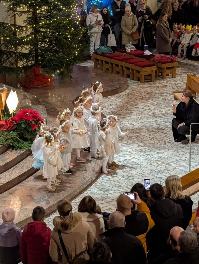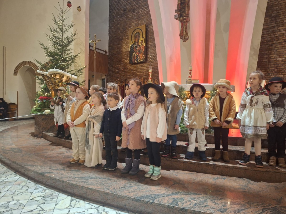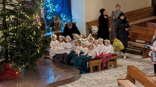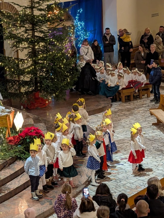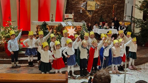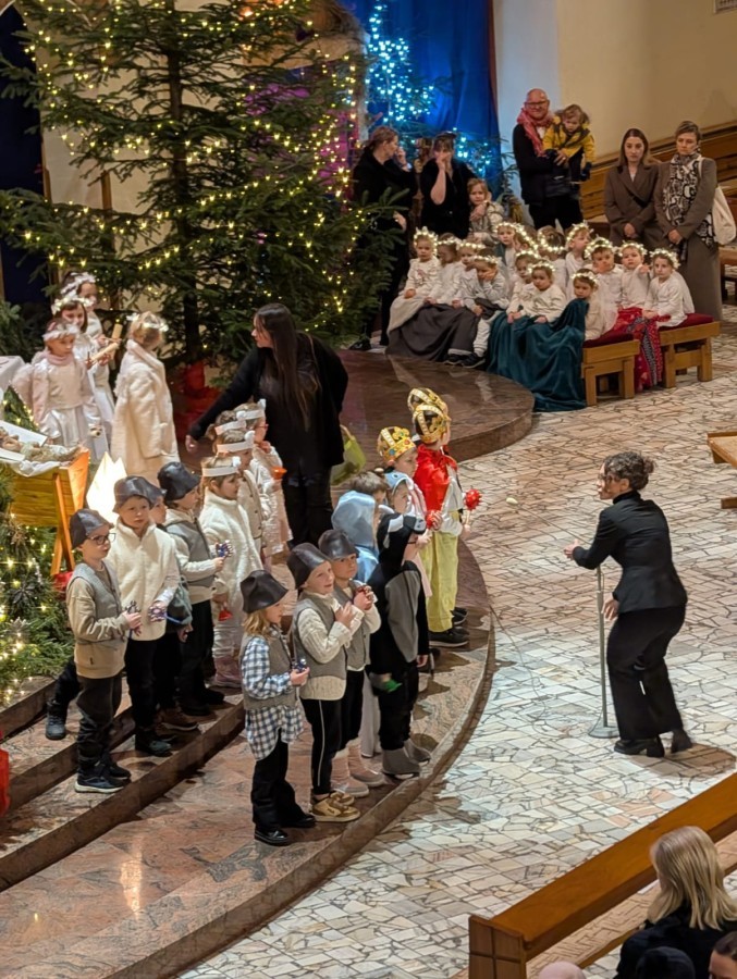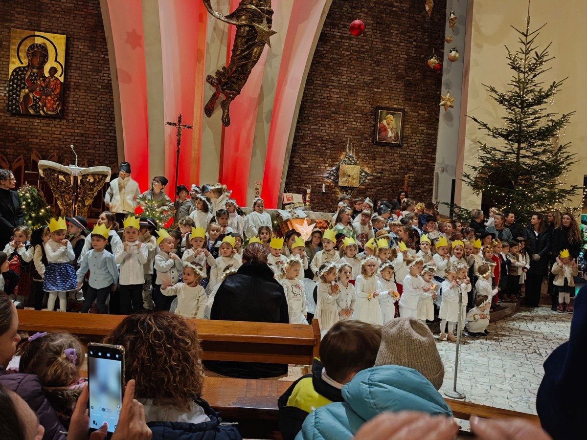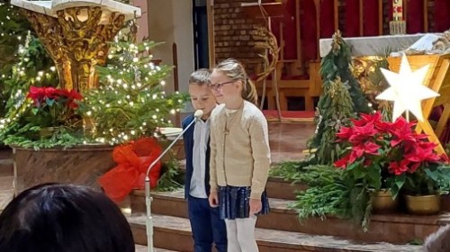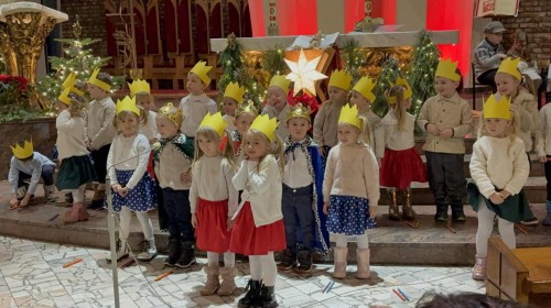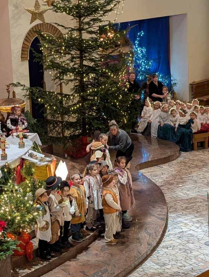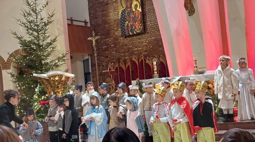 w uroczystym kolędowaniu w kościele. Mali artyści z radością zaprezentowali przygotowane kolędy i pastorałki, które śpiewali dla swoich kochanych babć i dziadków. Występ był pełen uśmiechu, zaangażowania i świątecznej atmosfery. Dzieci w ten sposób wyraziły swoją miłość, wdzięczność, szacunek oraz pamięć o babciach