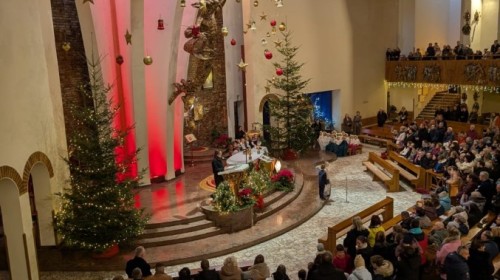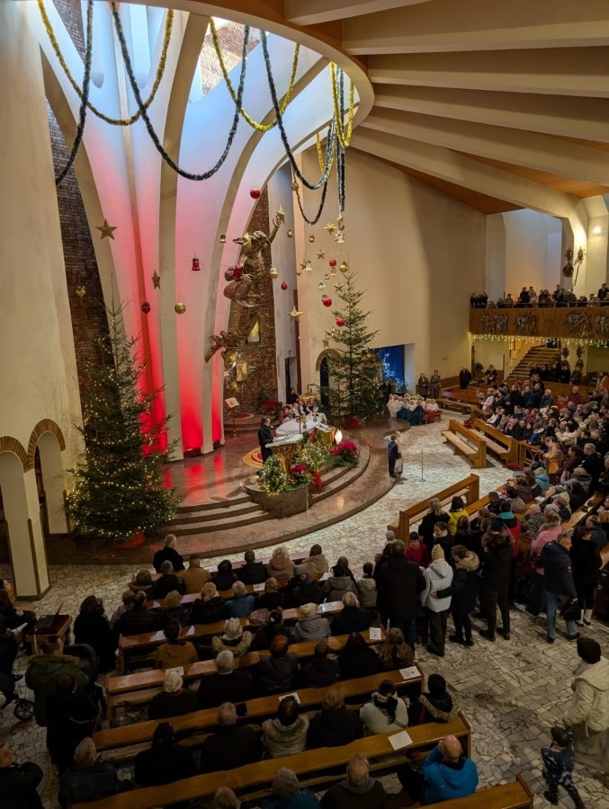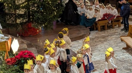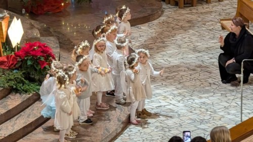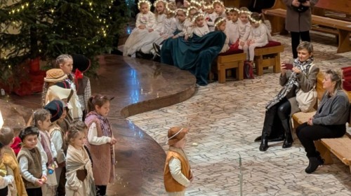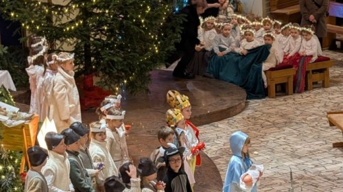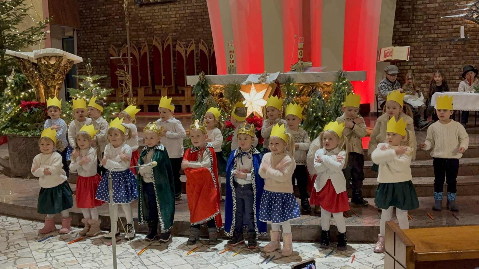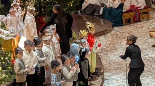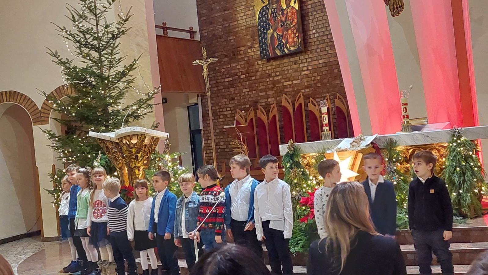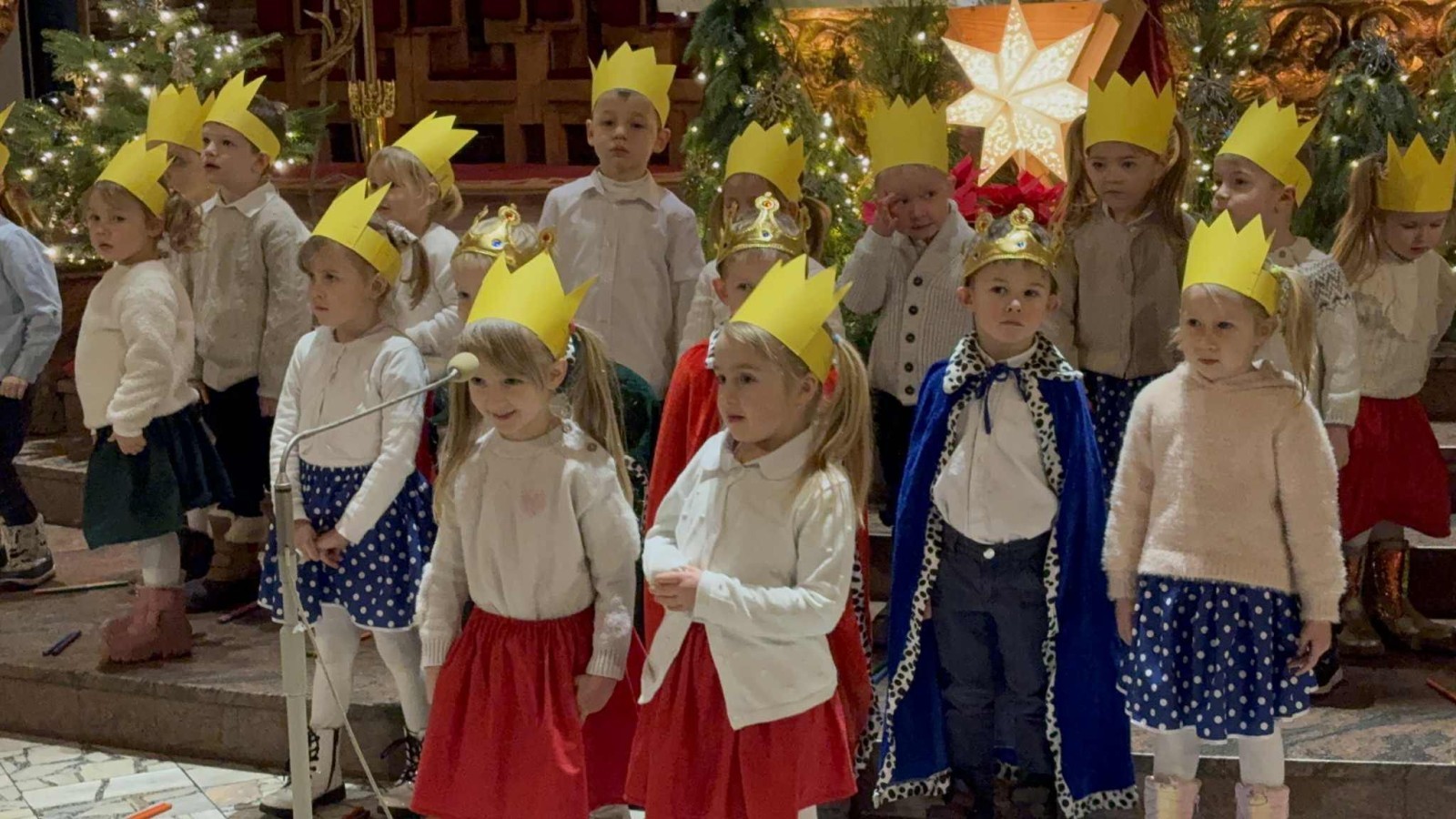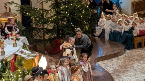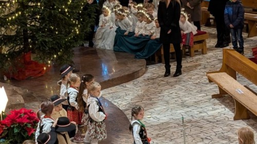 w uroczystym kolędowaniu w kościele. Mali artyści z radością zaprezentowali przygotowane kolędy i pastorałki, które śpiewali dla swoich kochanych babć i dziadków. Występ był pełen uśmiechu, zaangażowania i świątecznej atmosfery. Dzieci w ten sposób wyraziły swoją miłość, wdzięczność, szacunek oraz pamięć o babciach
