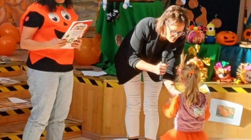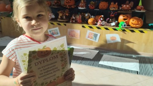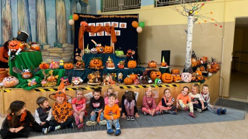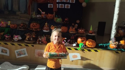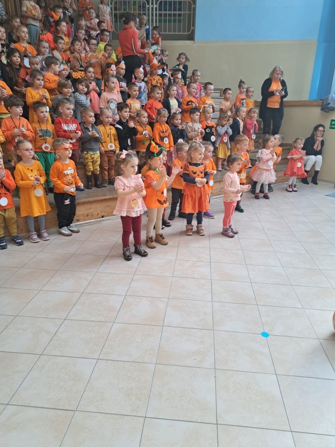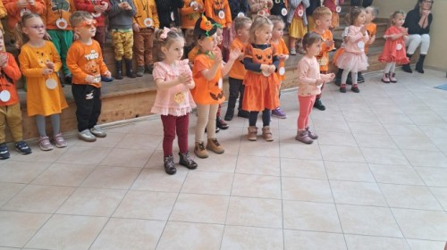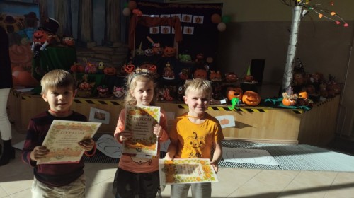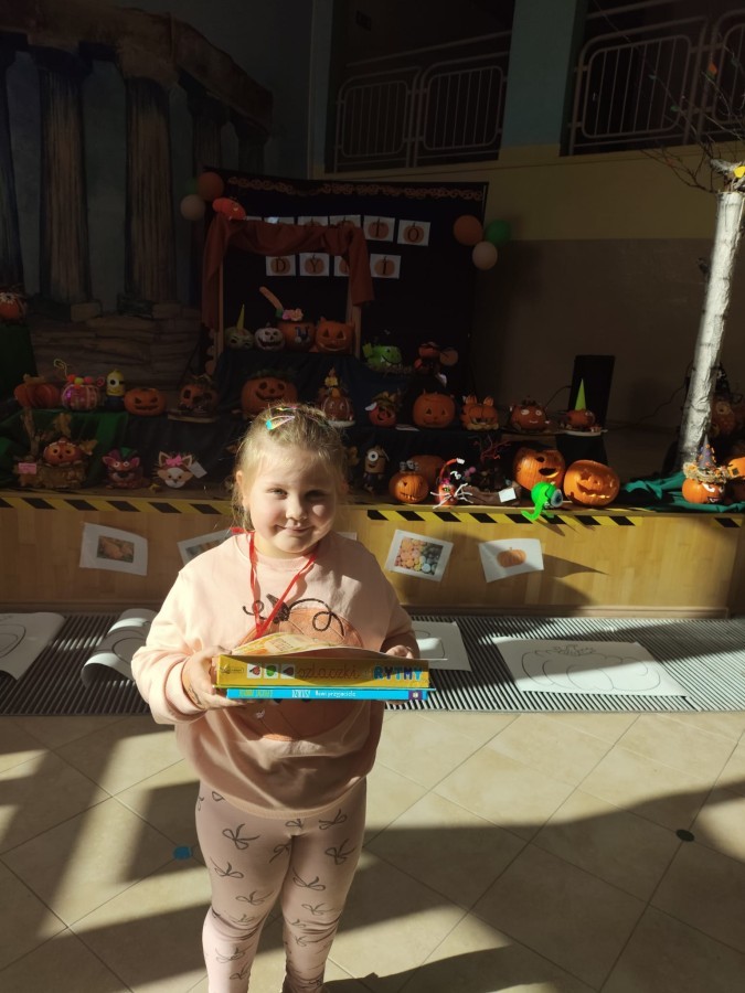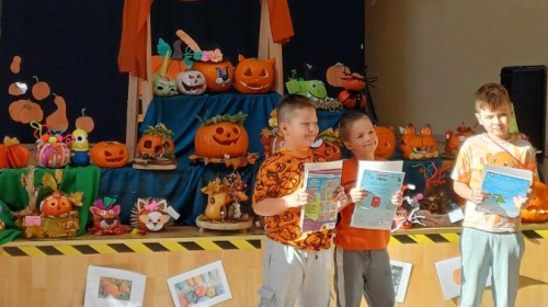 i piękne prace. Po rozdaniu nagród wszyscy wspólnie zaśpiewaliśmy piosenkę z pokazywaniem, wprowadzającą w radosny, jesienny nastrój. Następnie przyszedł czas na dyniowe konkurencje przygotowane dla każdej grupy: