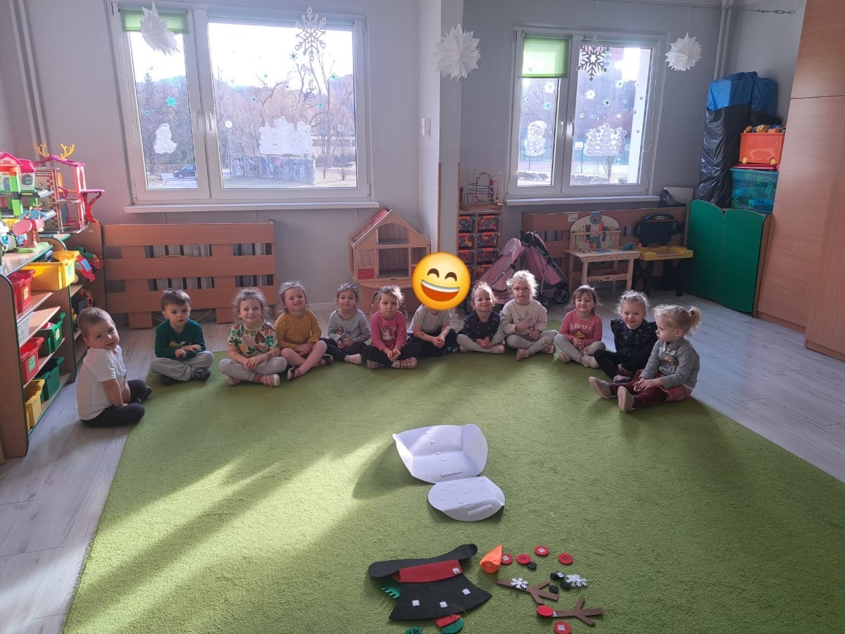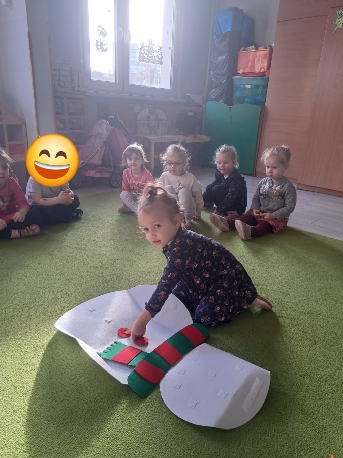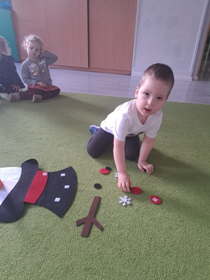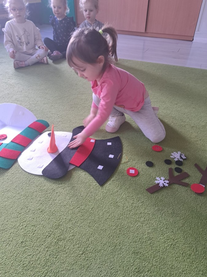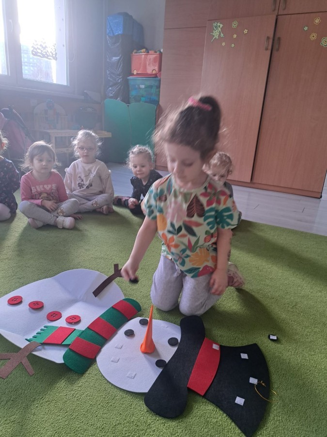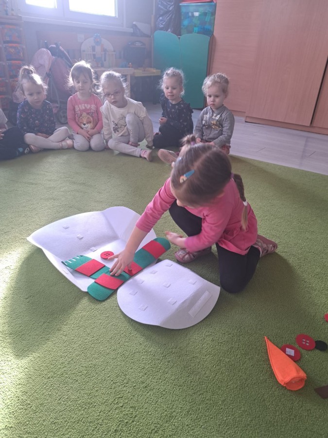 Podczas zajęć dzieci z grupy „Liski” uczestniczyły w zabawie-Ubieramy bałwanka, podczas której dobierały i układały elementy zimowego stroju. Dzieci rozwijały spostrzegawczość, umiejętność współpracy oraz utrwalały wiedzę o odpowiednim ubiorze zimą, była to nie tylko nauka, ale również i świetna zabawa.