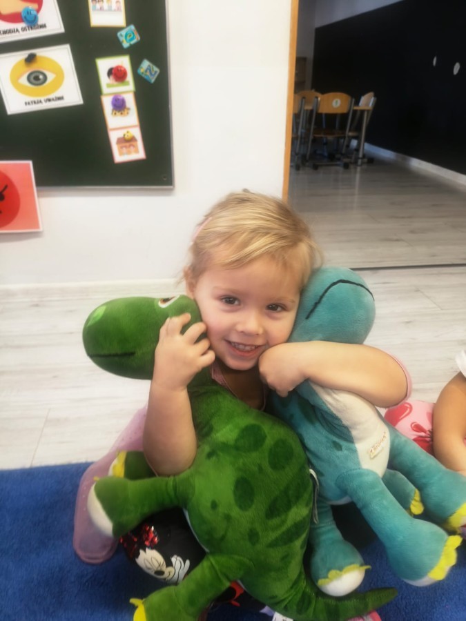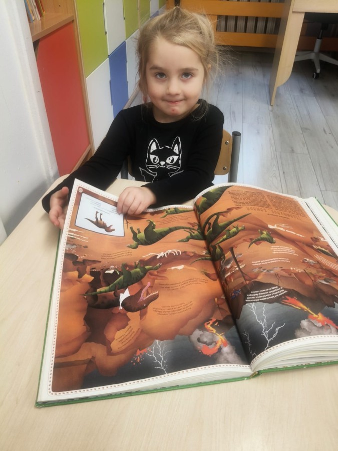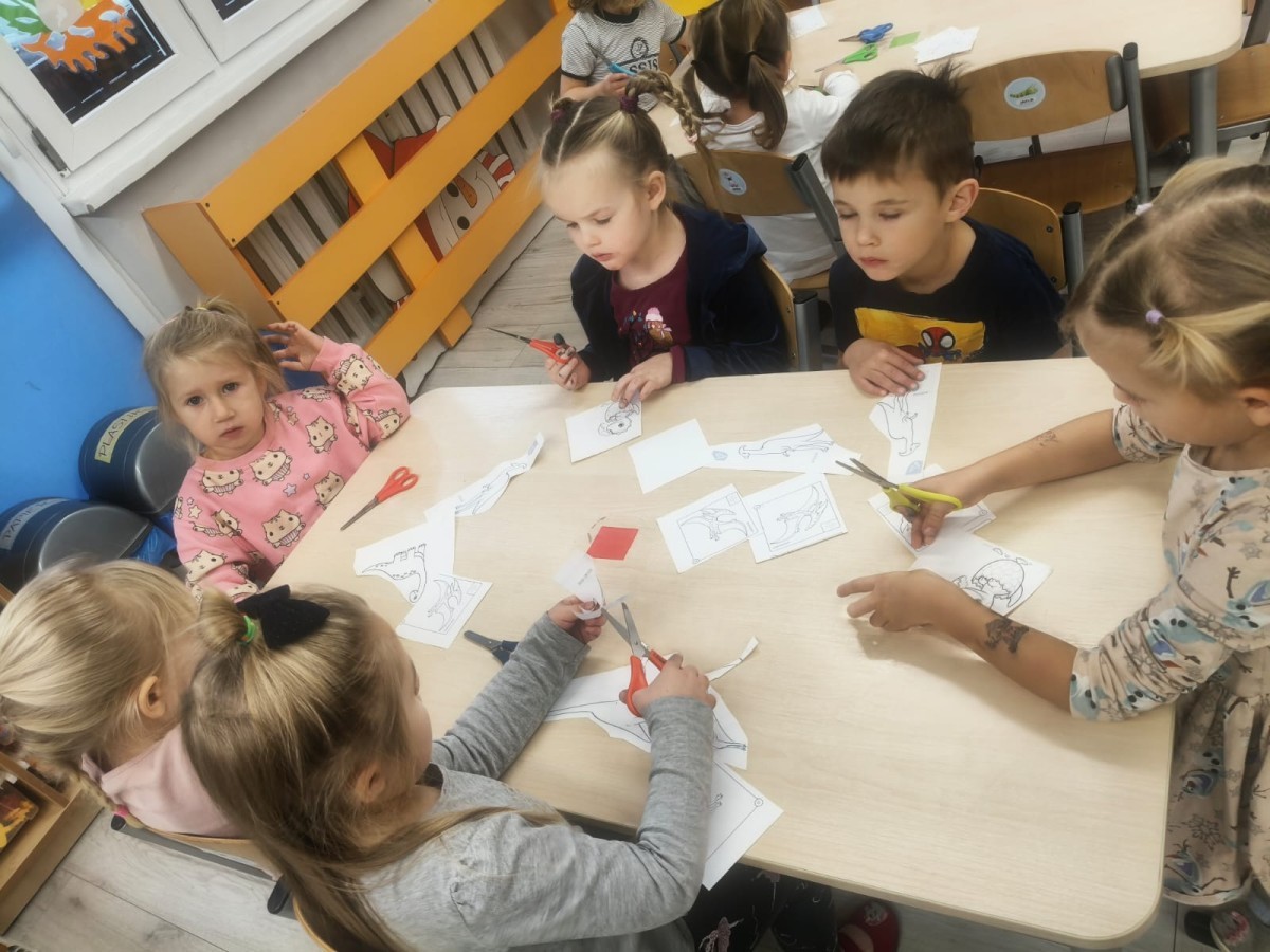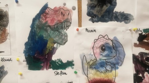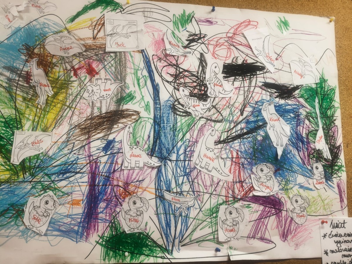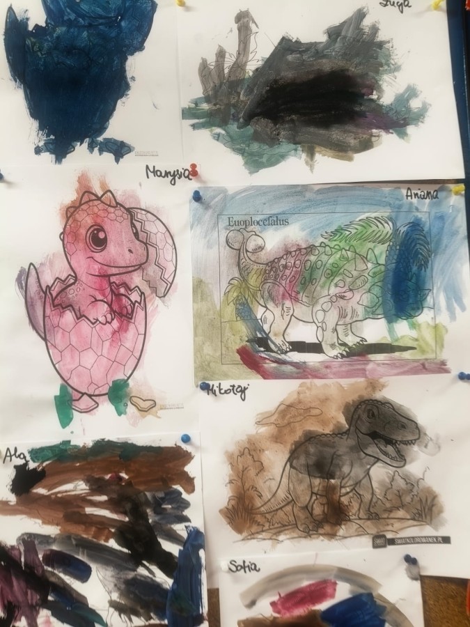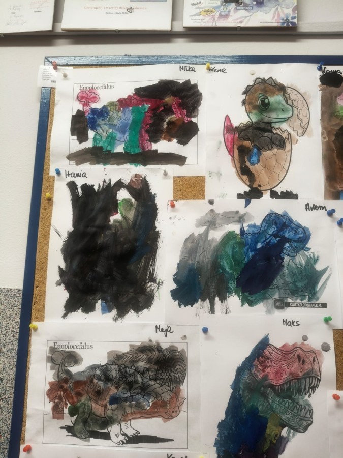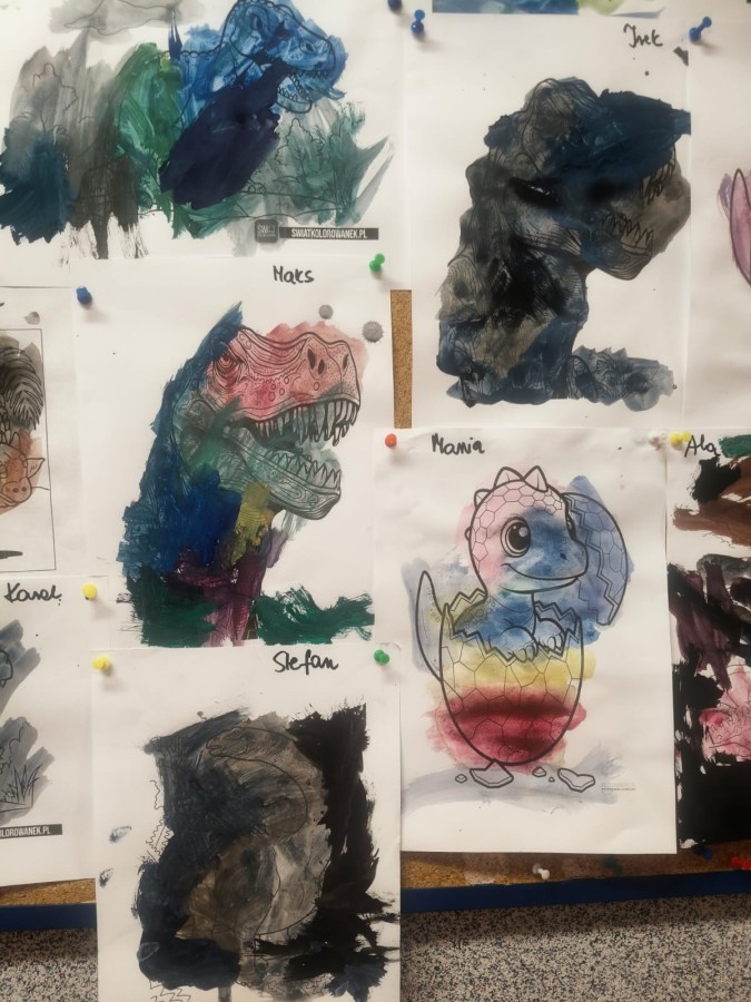 a ankylozaura czy stegozaura nie warto atakować, zwłaszcza gdy jest w stadzie. Poznaliśmy również kilka hipotez na temat wyginięcia tego gatunku oraz przeprowadziliśmy całkiem udany eksperyment z wybuchem wulkanu. W różnych rodzajach prac plastycznych, doskonaląc malowanie, wycinanie czy tez pracę w grupie utrwalaliśmy sobie najciekawsze informacje. Dzieci mogły się bawić figurkami dinozaurów, pluszakami oraz oglądać książeczki. Na zakończenie cyklu tych zajęć oglądnęliśmy króciutką bajkę "Gigantozaur" oraz nauczyliśmy się ciekawie ilustrowanej piosenki o dinozaurach.