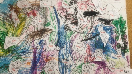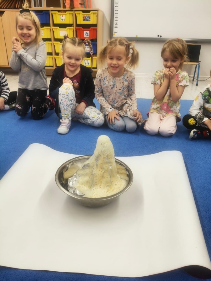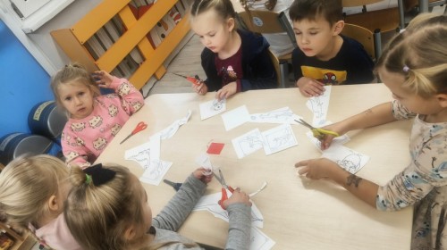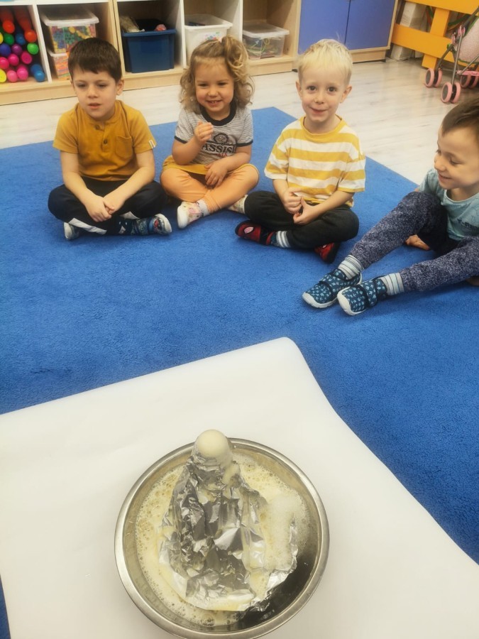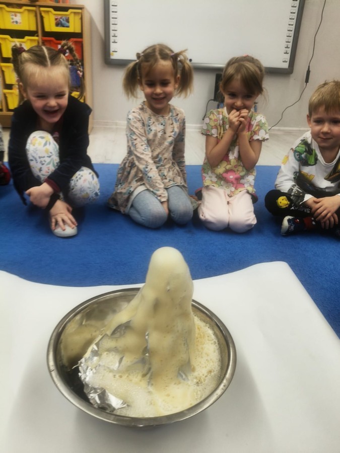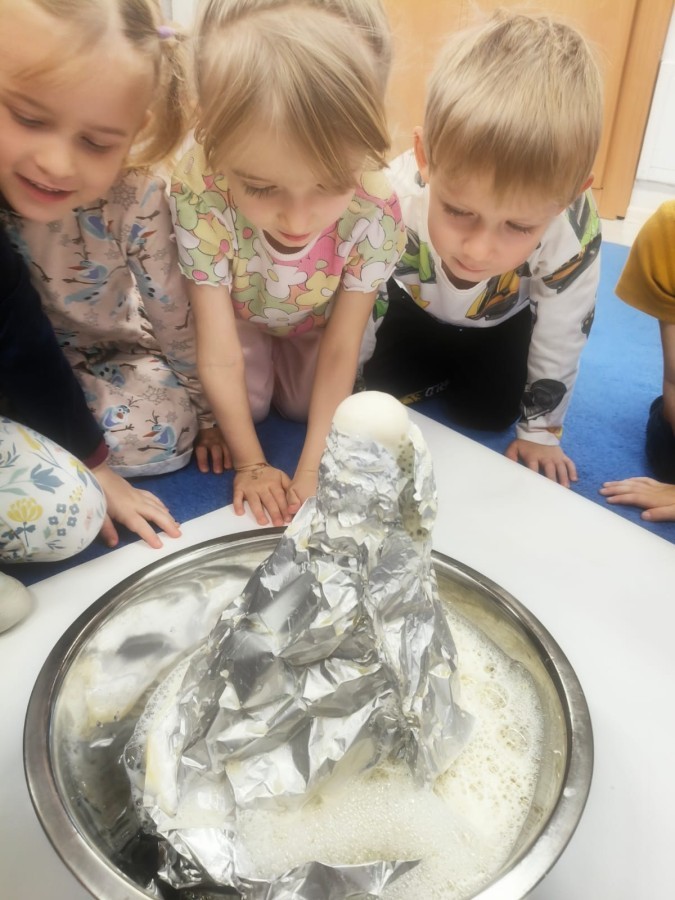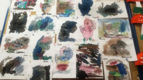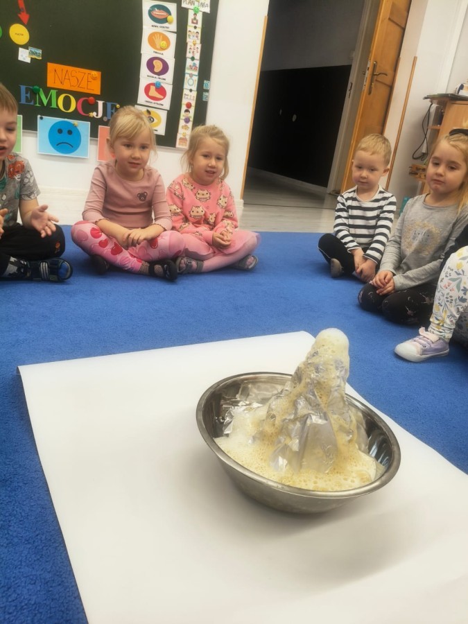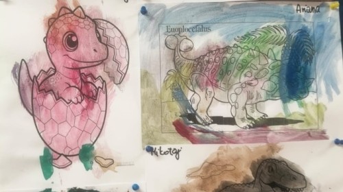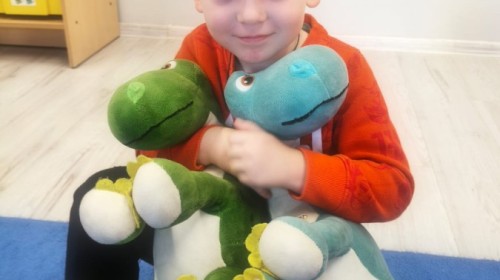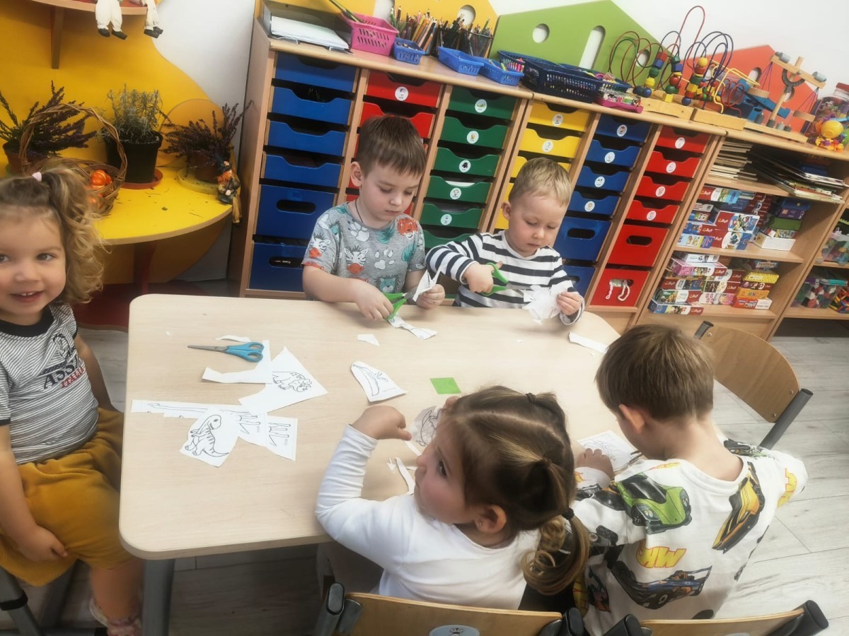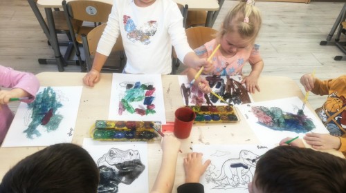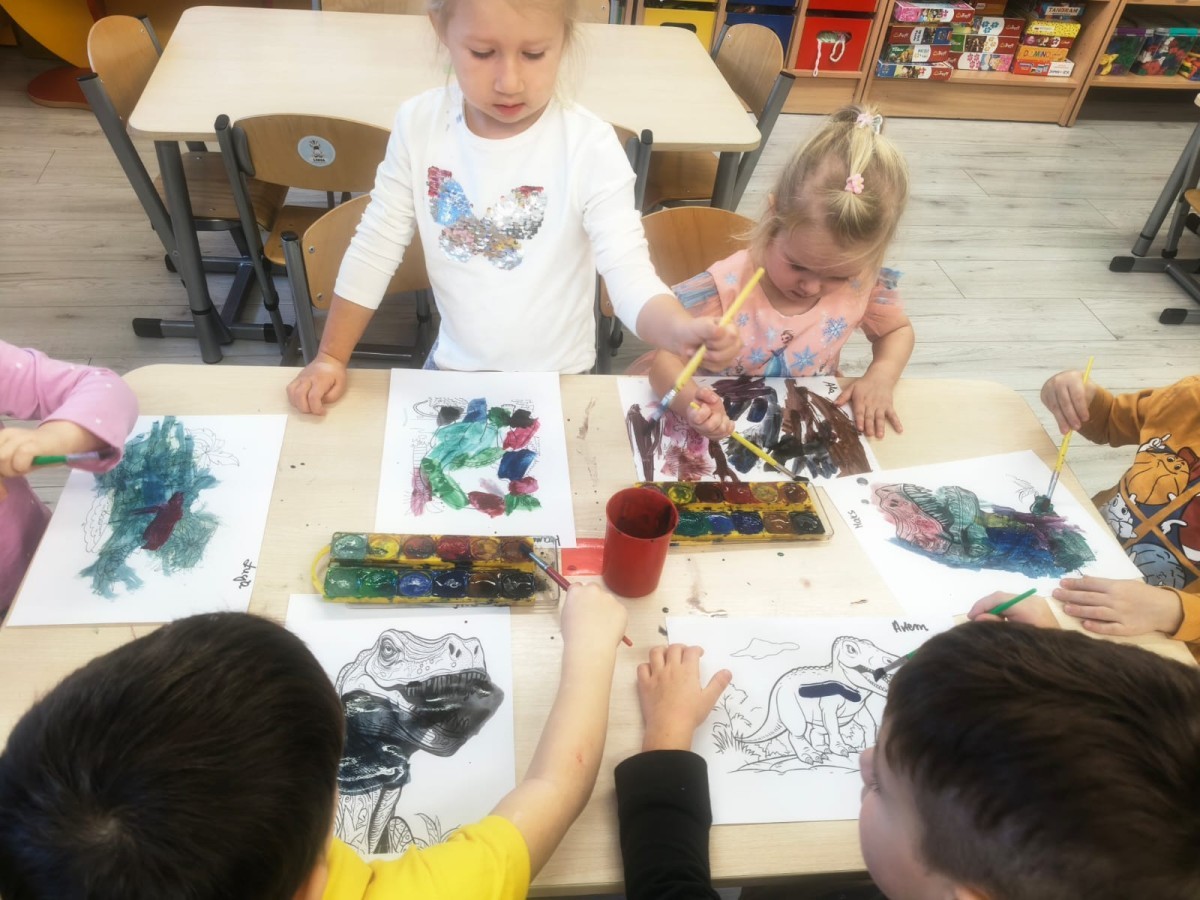 a ankylozaura czy stegozaura nie warto atakować, zwłaszcza gdy jest w stadzie. Poznaliśmy również kilka hipotez na temat wyginięcia tego gatunku oraz przeprowadziliśmy całkiem udany eksperyment z wybuchem wulkanu. W różnych rodzajach prac plastycznych, doskonaląc malowanie, wycinanie czy tez pracę w grupie utrwalaliśmy sobie najciekawsze informacje. Dzieci mogły się bawić figurkami dinozaurów, pluszakami oraz oglądać książeczki. Na zakończenie cyklu tych zajęć oglądnęliśmy króciutką bajkę "Gigantozaur" oraz nauczyliśmy się ciekawie ilustrowanej piosenki o dinozaurach.