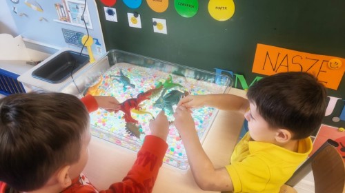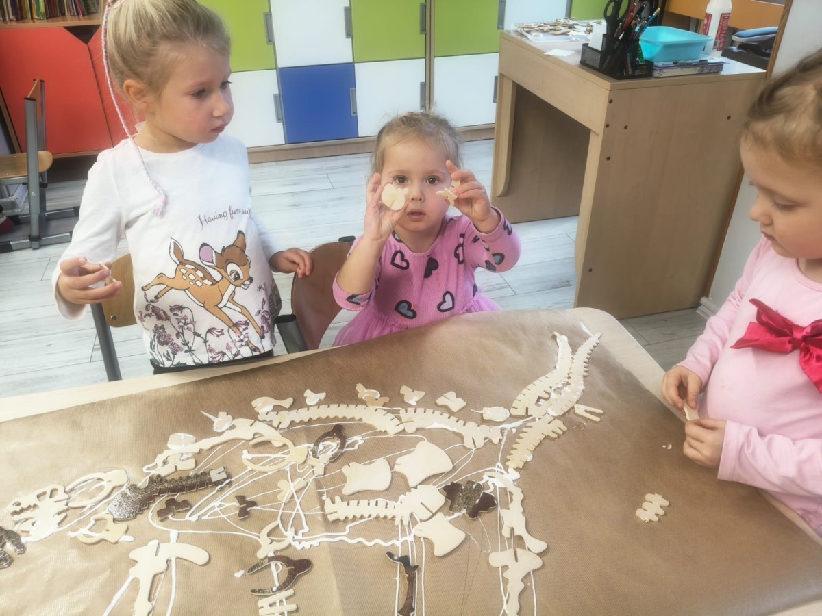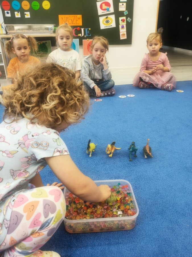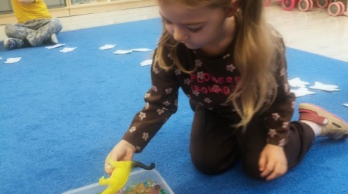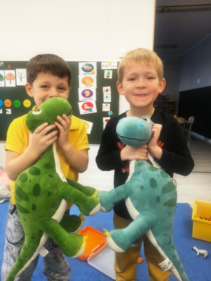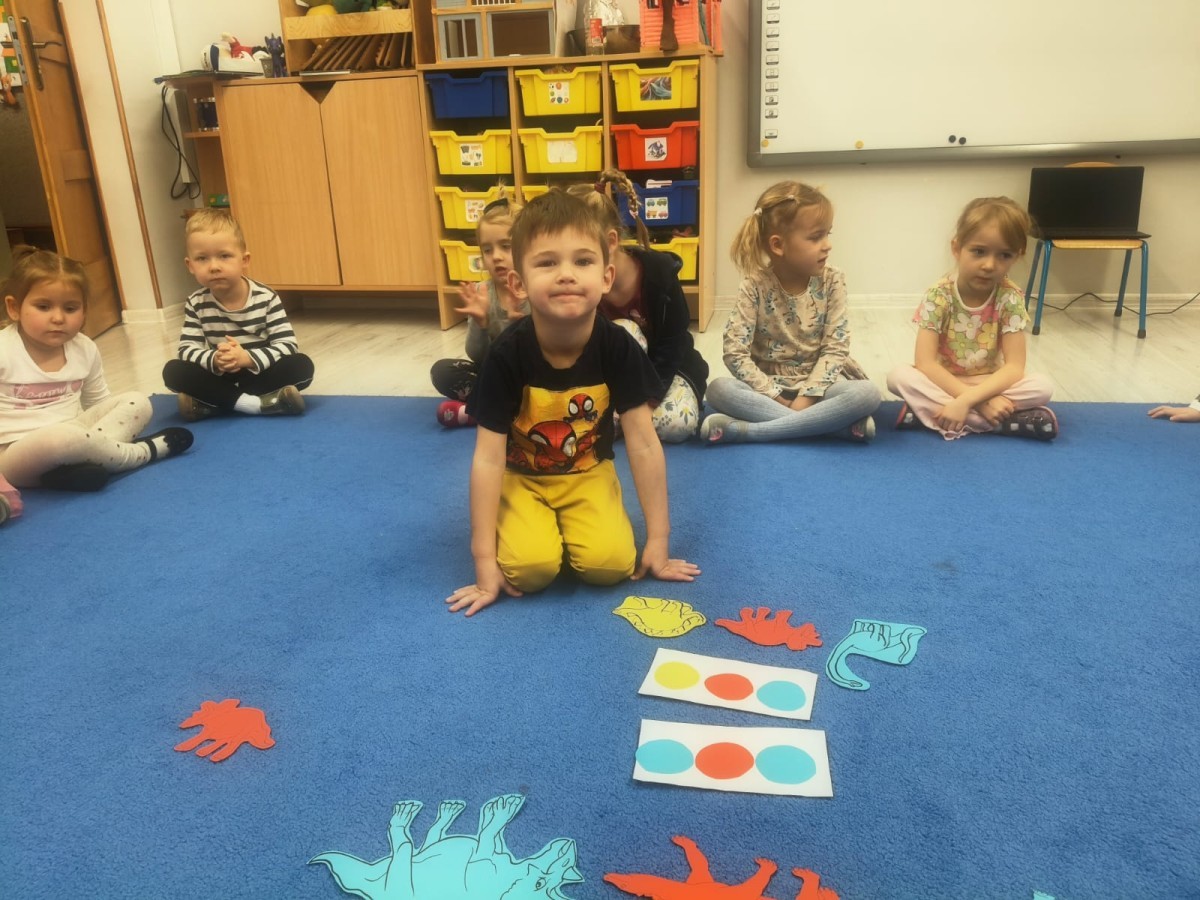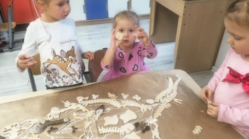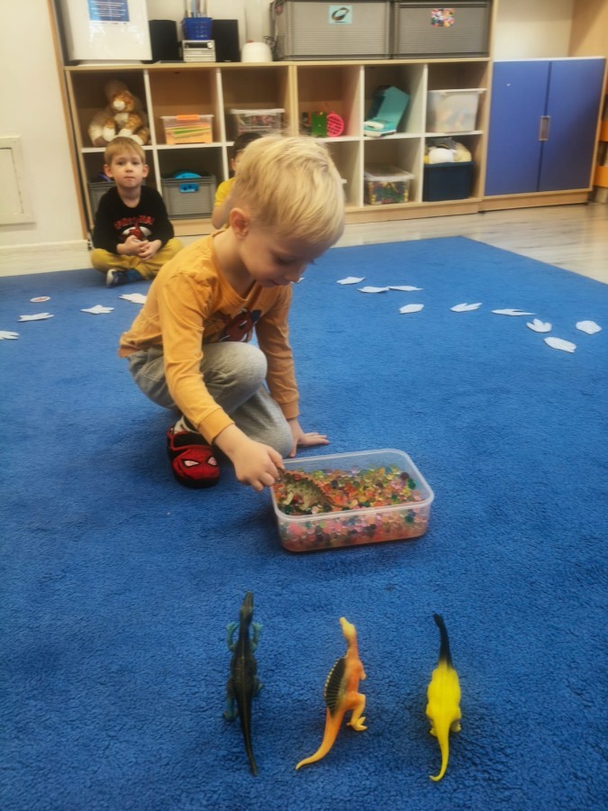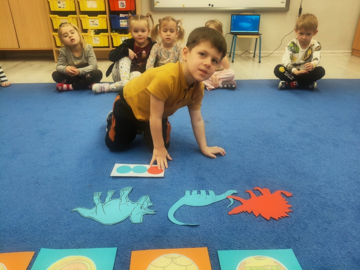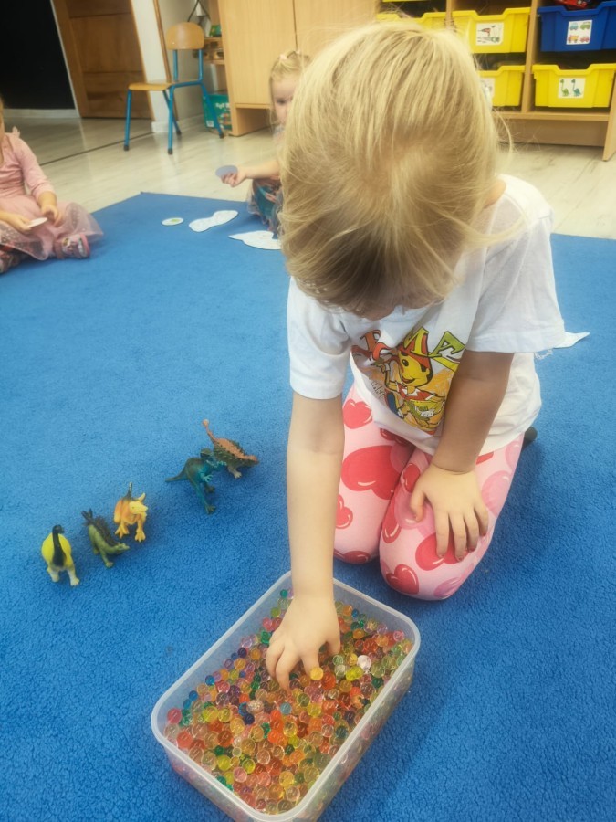 W tym tygodniu rozmawialiśmy w grupie "Wiewiórek" o dinozaurach oraz o tym, jak wyglądał świat wiele milionów lat temu. Dzieci najpierw chodziły po sali tropiąc ślady, szukały ukrytych obrazków, a później odgadywały temat zajęć. Dzieci bardzo szybko odgadły, iż temat dotyczy dinozaurów. Podczas zabaw sensorycznych odkrywaliśmy różne rodzaje dinozaurów, szukaliśmy ciekawostek