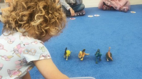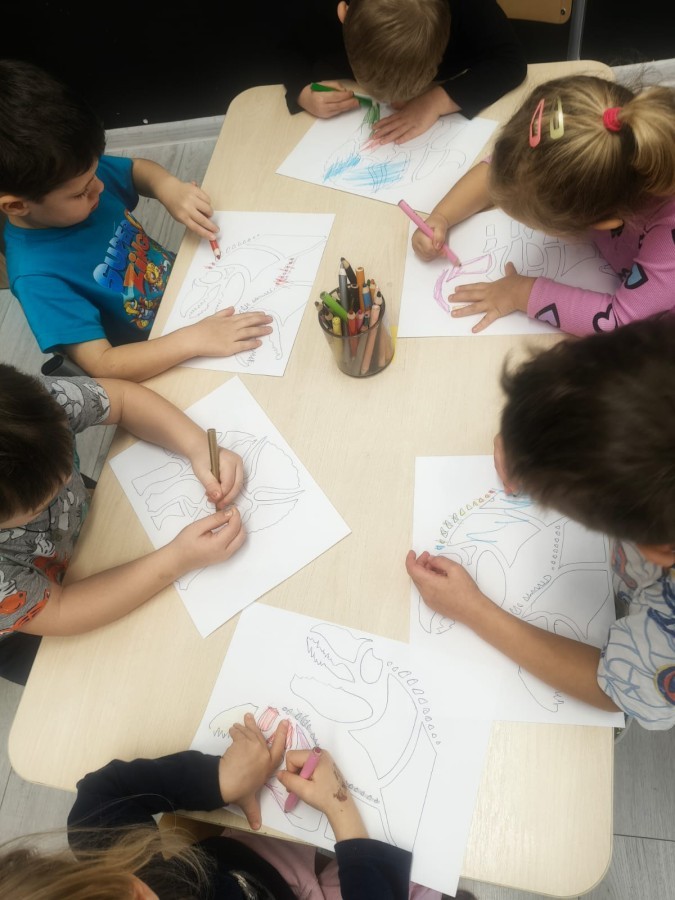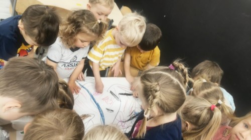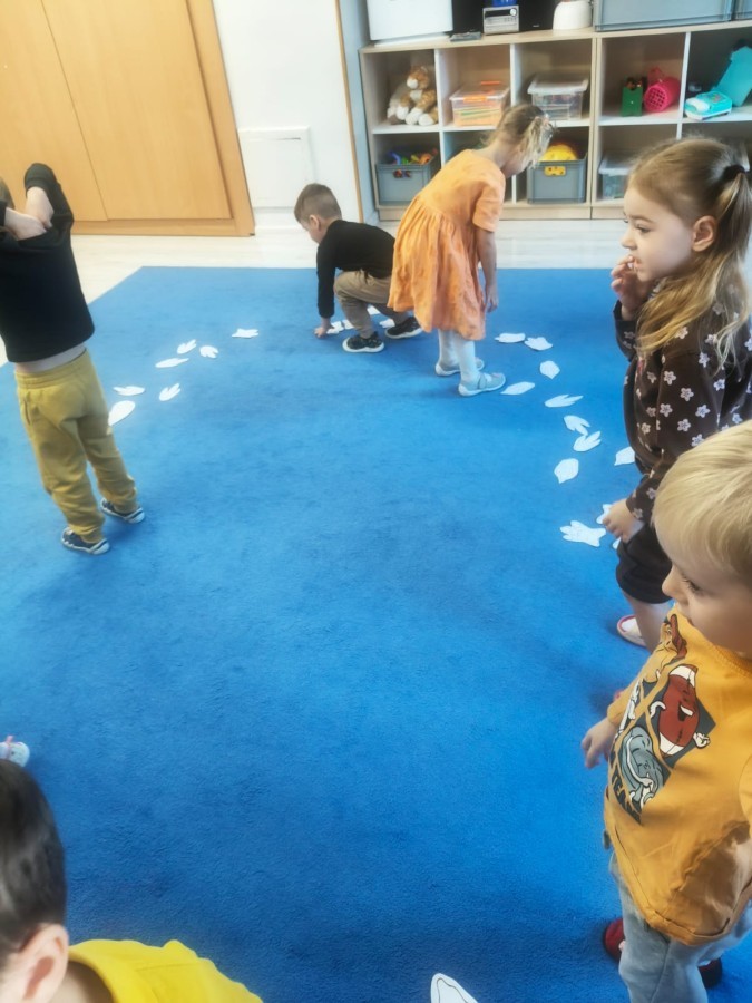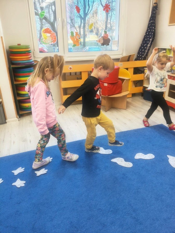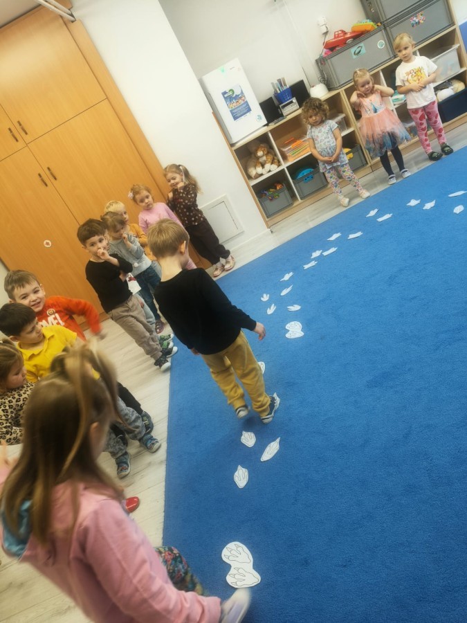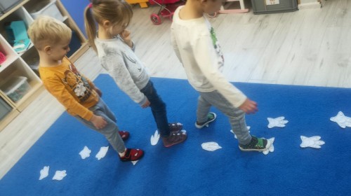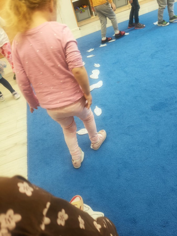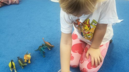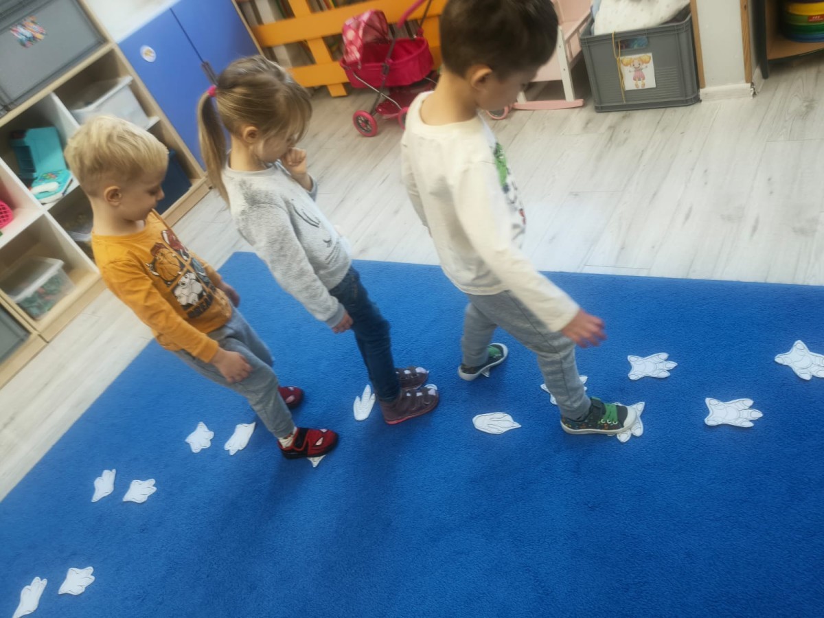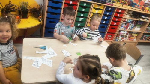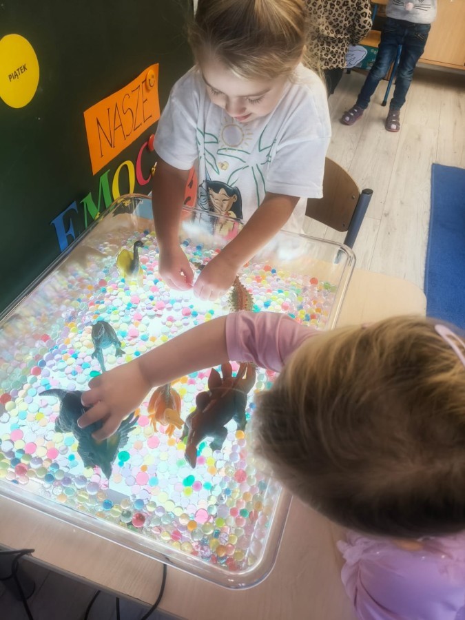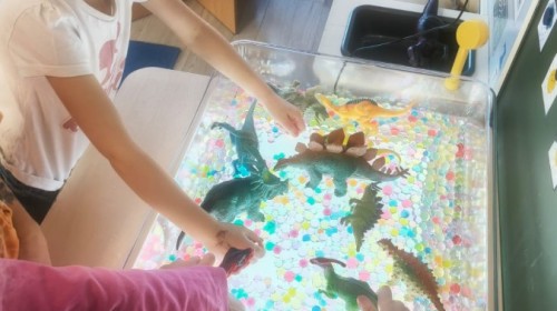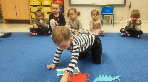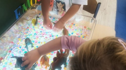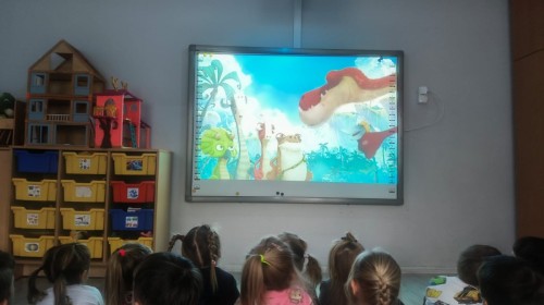 W tym tygodniu rozmawialiśmy w grupie "Wiewiórek" o dinozaurach oraz o tym, jak wyglądał świat wiele milionów lat temu. Dzieci najpierw chodziły po sali tropiąc ślady, szukały ukrytych obrazków, a później odgadywały temat zajęć. Dzieci bardzo szybko odgadły, iż temat dotyczy dinozaurów. Podczas zabaw sensorycznych odkrywaliśmy różne rodzaje dinozaurów, szukaliśmy ciekawostek