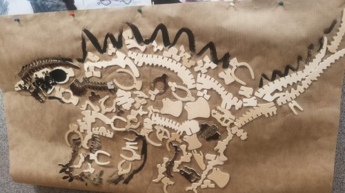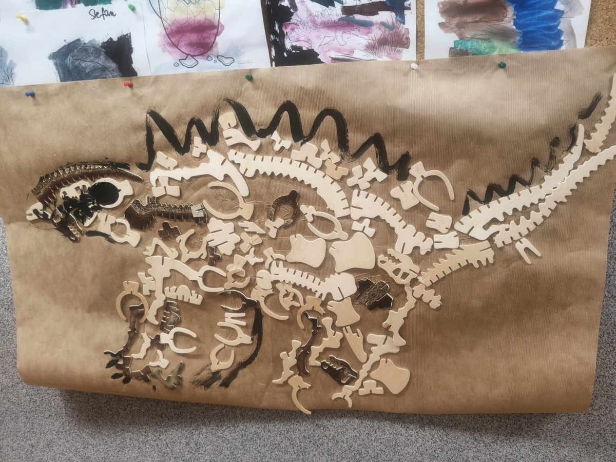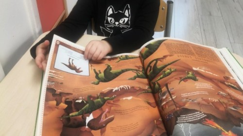 w książkach i encyklopediach. Dzieci dowiedziały, się również jak wygląda szkielet, że dinozaury wykluwają się z jaj, że mamy podział na roślinożerne i mięsożerne, że istniały gatunki morskie, lądowe i latające. Porównywaliśmy wielkości, rodzaj zębów, pazurów, szybkość poruszania i wiele, wiele innych. Już wiadomo, dlaczego diplodok ma długa szyję, raptory biegają najszybciej,