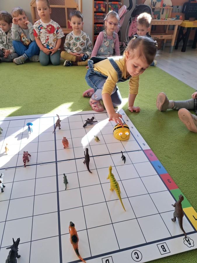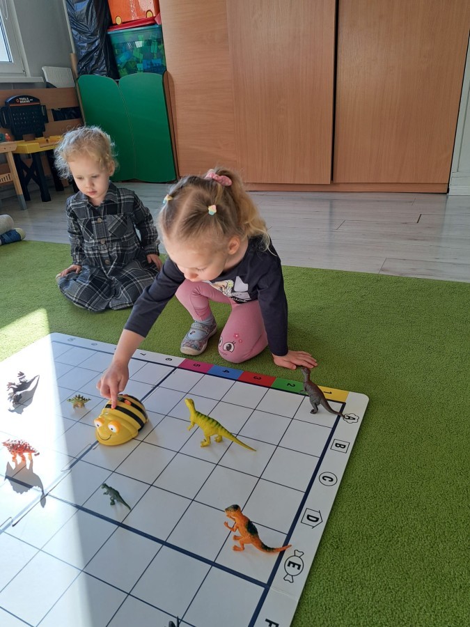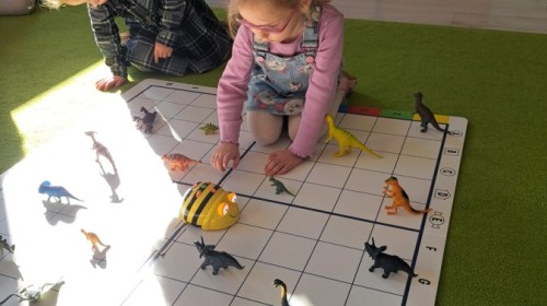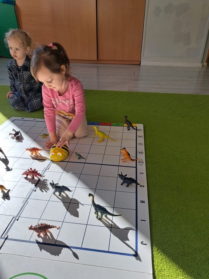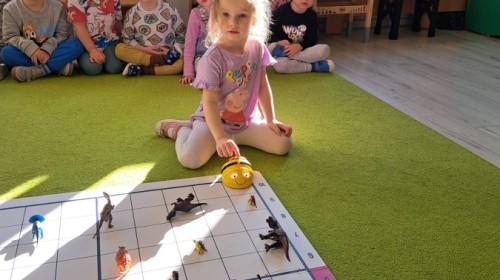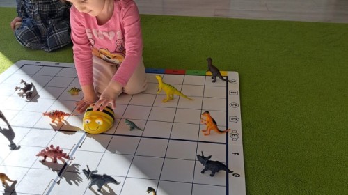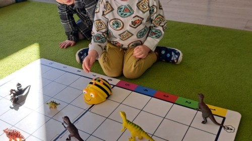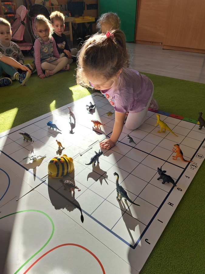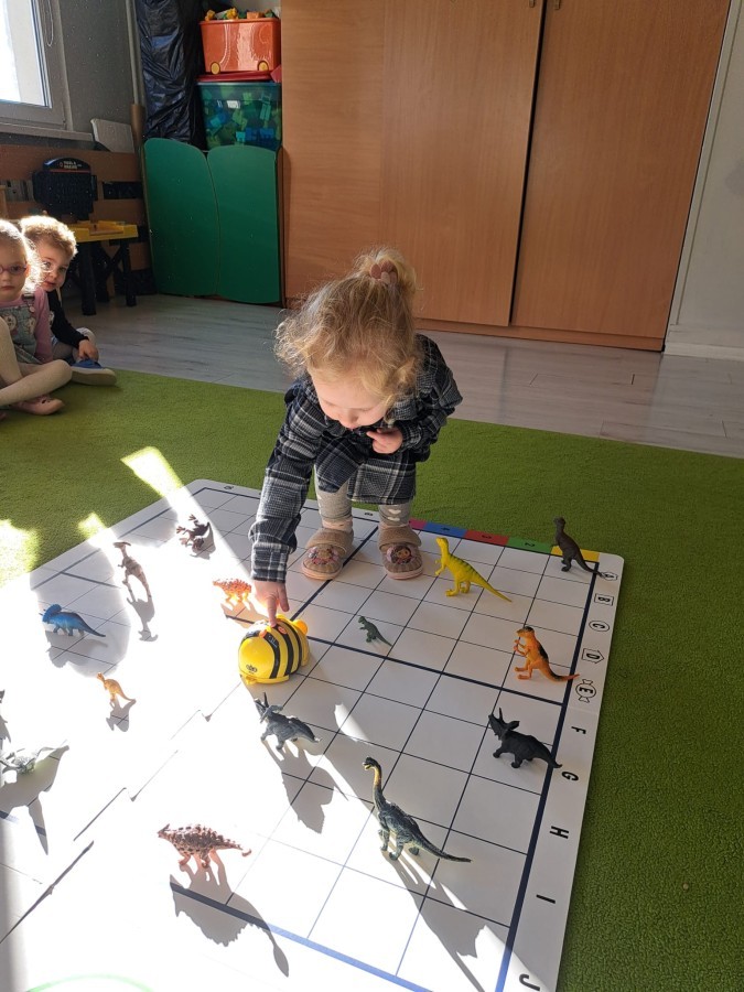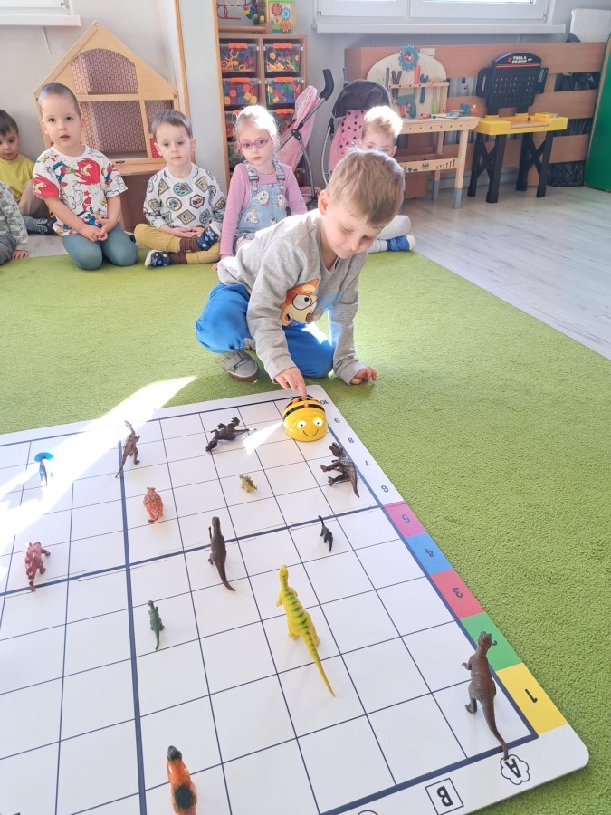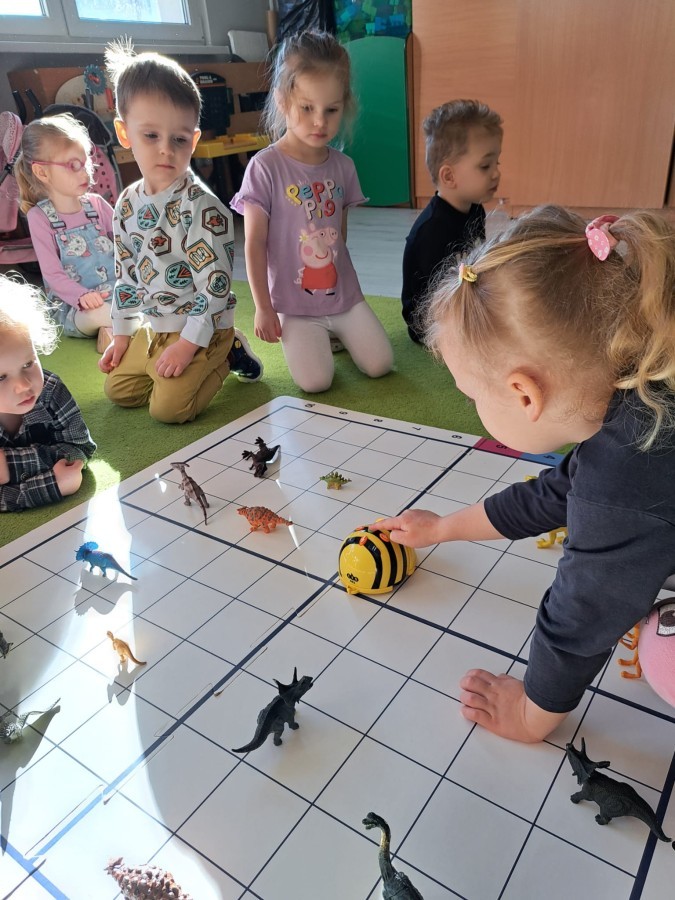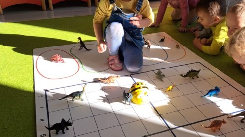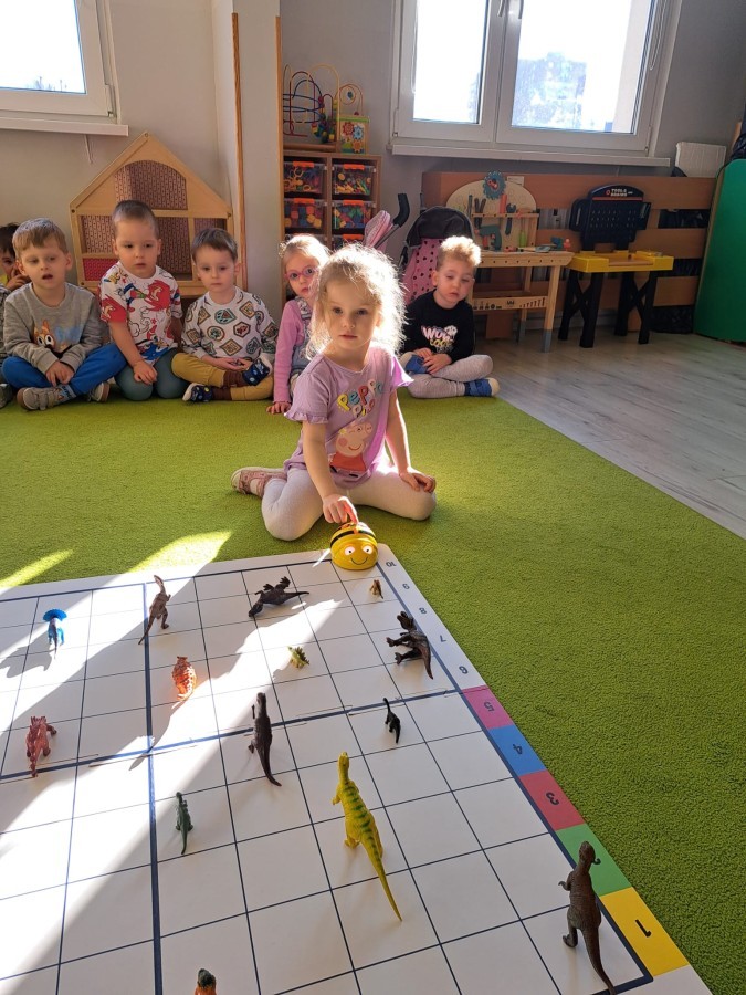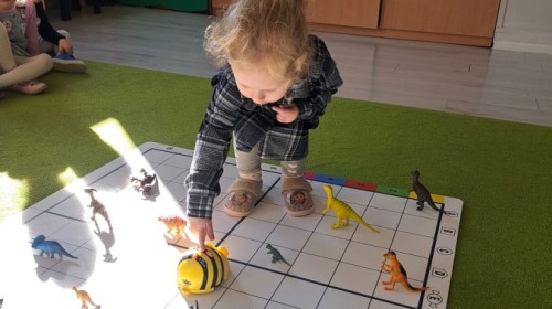 z wykorzystaniem robota Bee-Bot. Dzieci programowały pszczółkę tak, aby poruszała się po macie i zbierała dinozaury