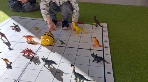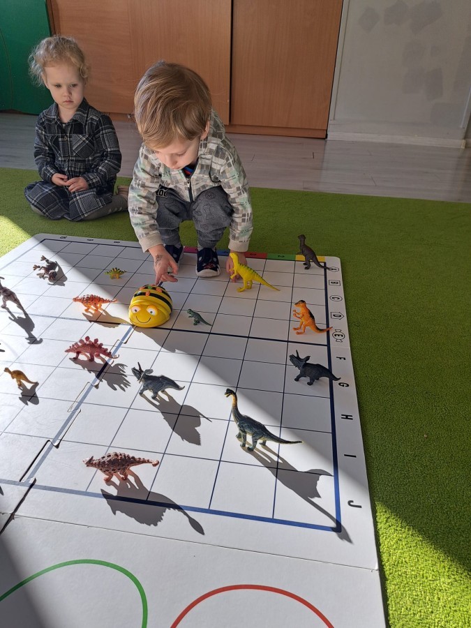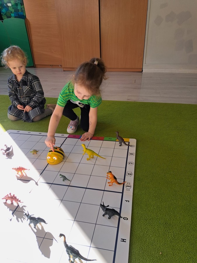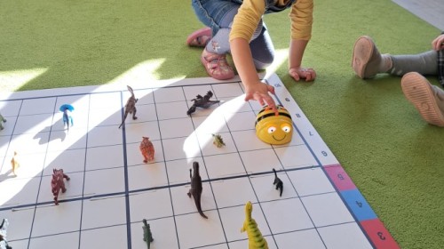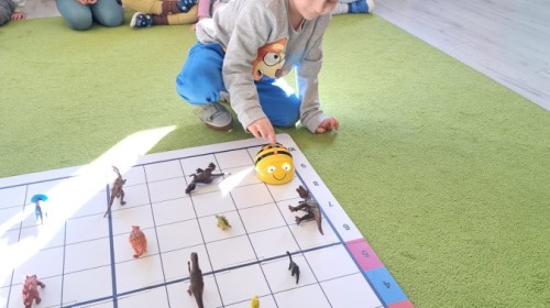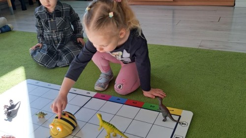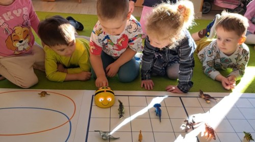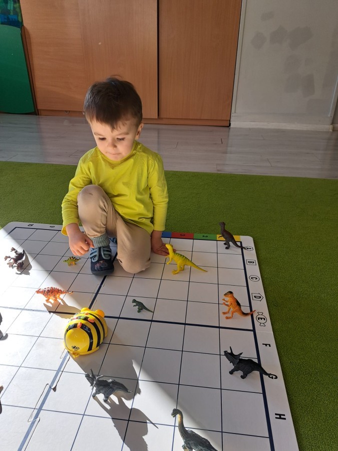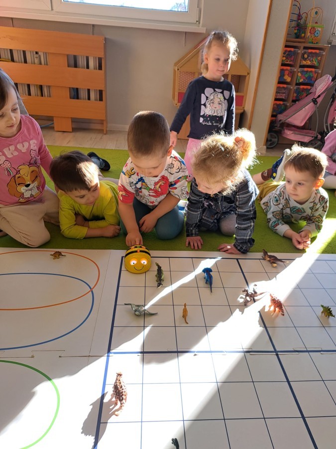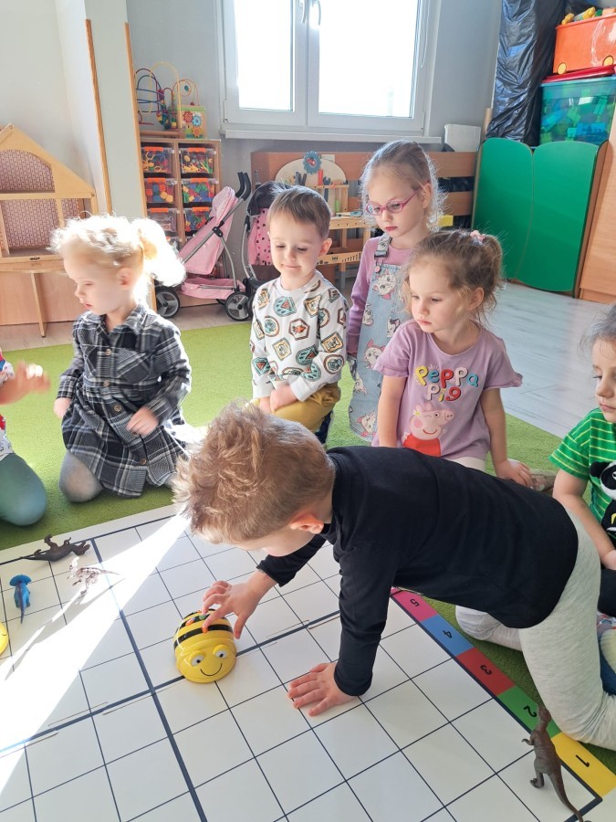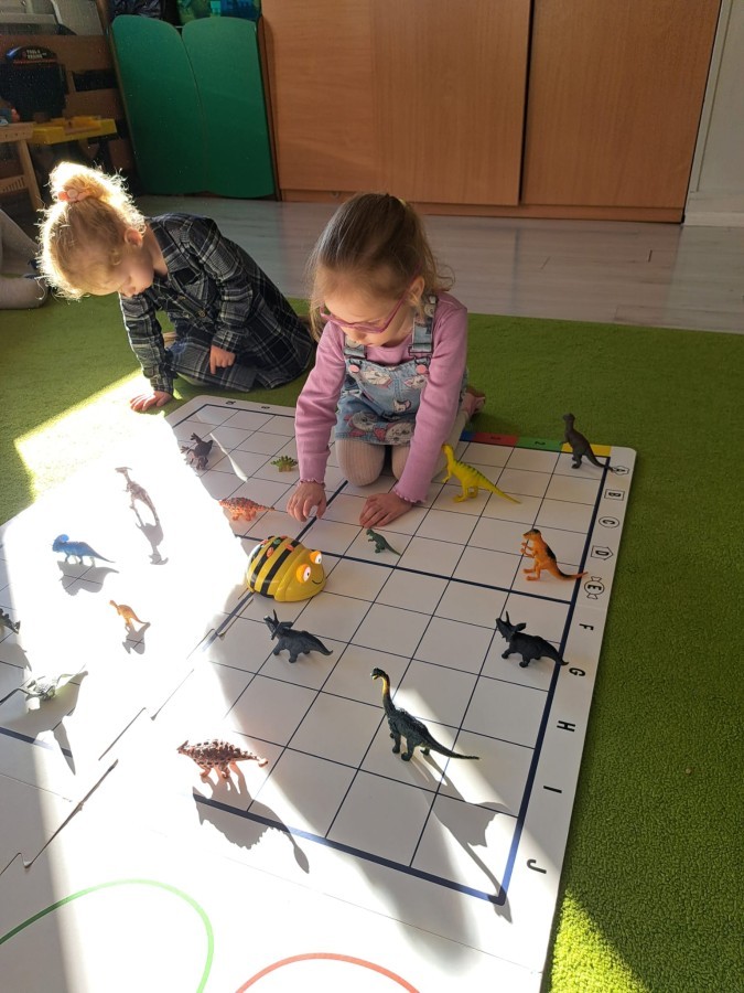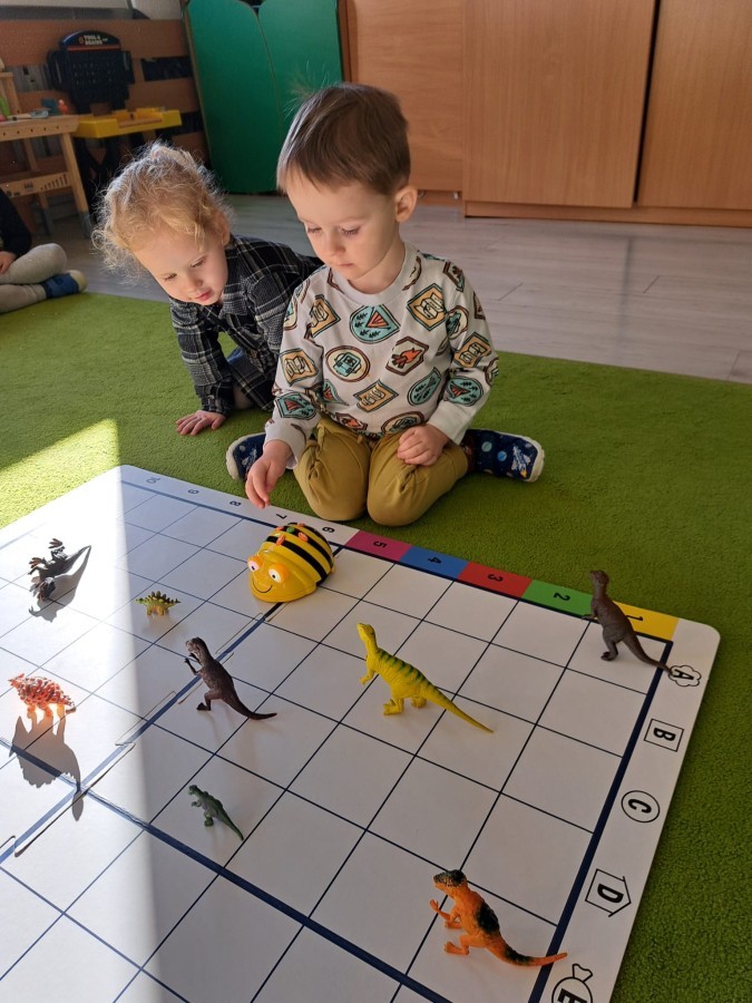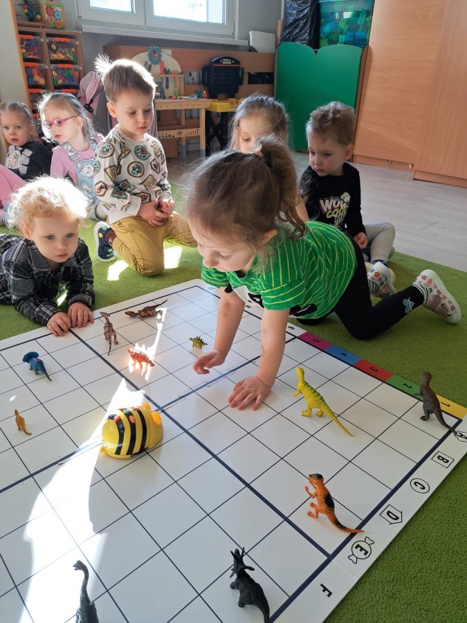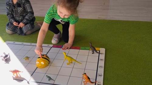 z wykorzystaniem robota Bee-Bot. Dzieci programowały pszczółkę tak, aby poruszała się po macie i zbierała dinozaury