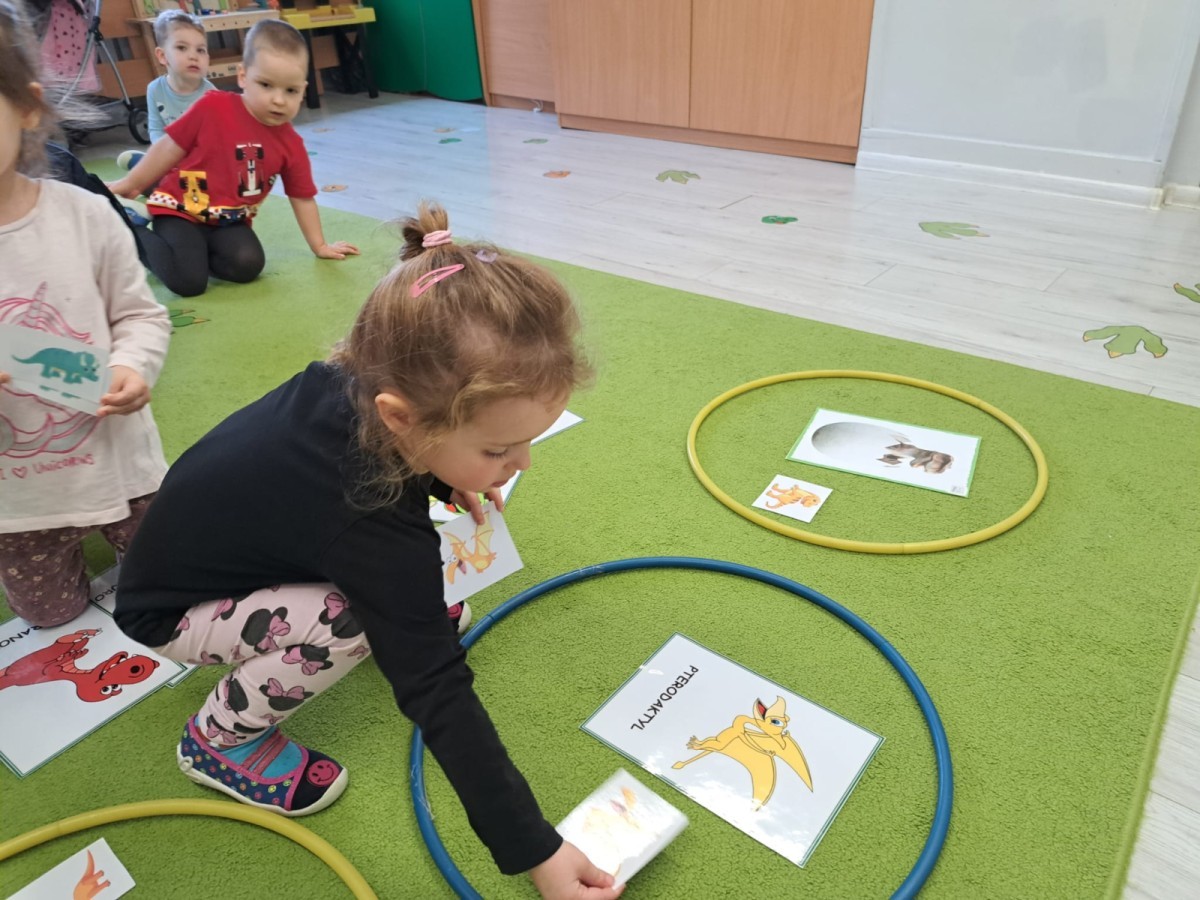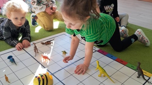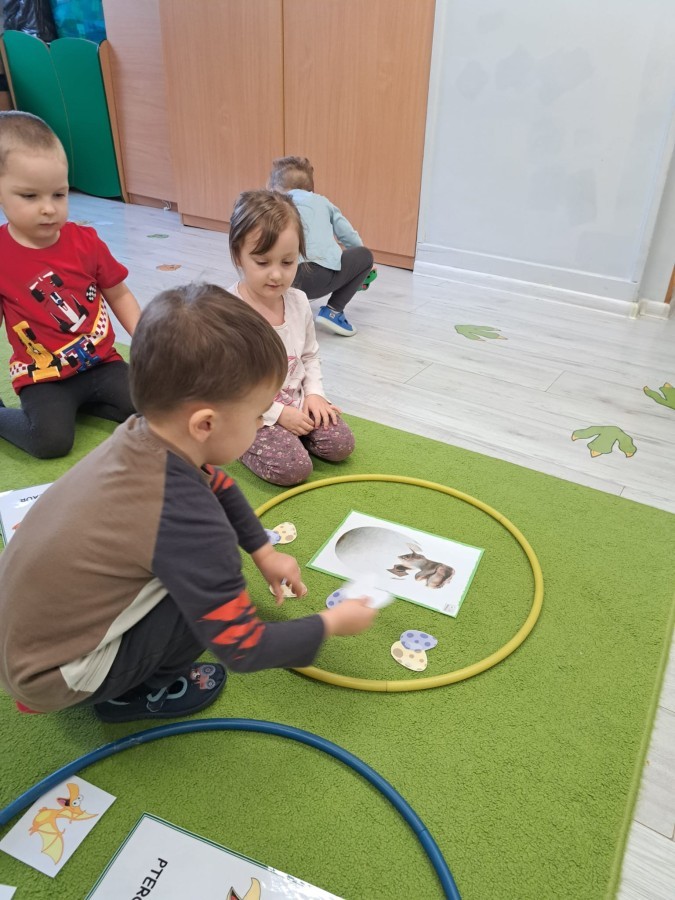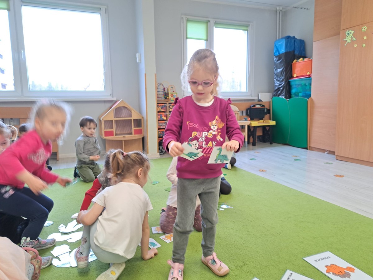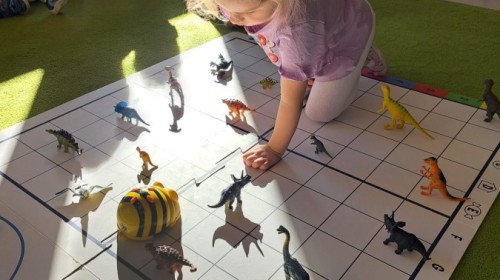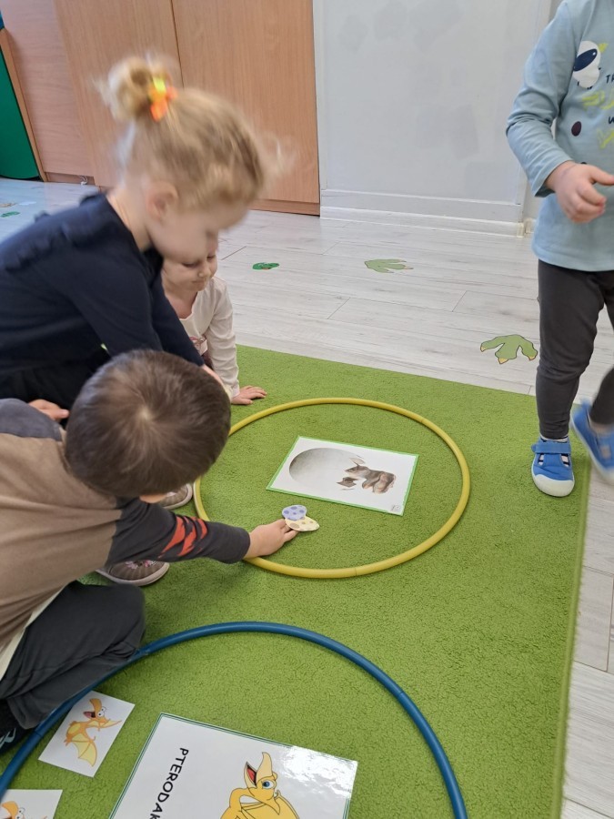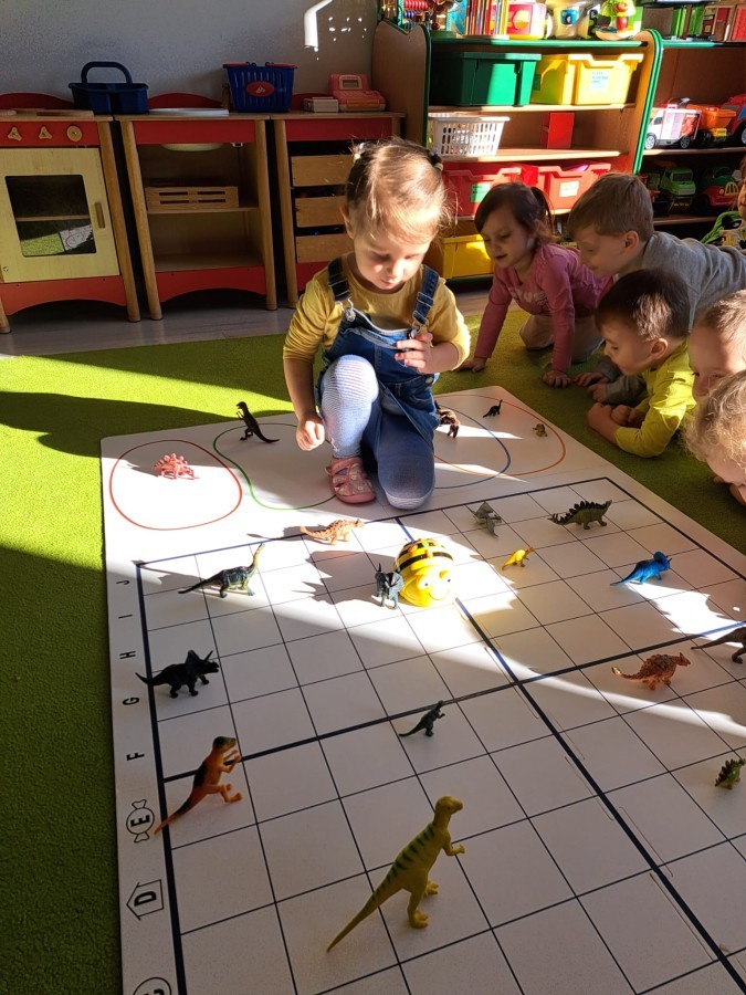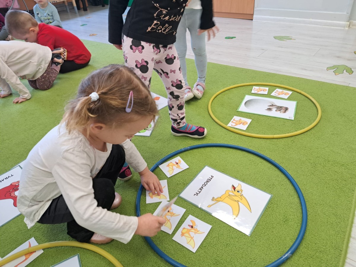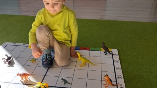 z odpowiednich pól, ćwicząc przy tym logiczne myślenie, orientację w przestrzeni oraz współpracę w grupie. Na zakończenie dzieci rozwijały swoją kreatywność i sprawność manualną, malując oraz tworząc własne dinozaury.