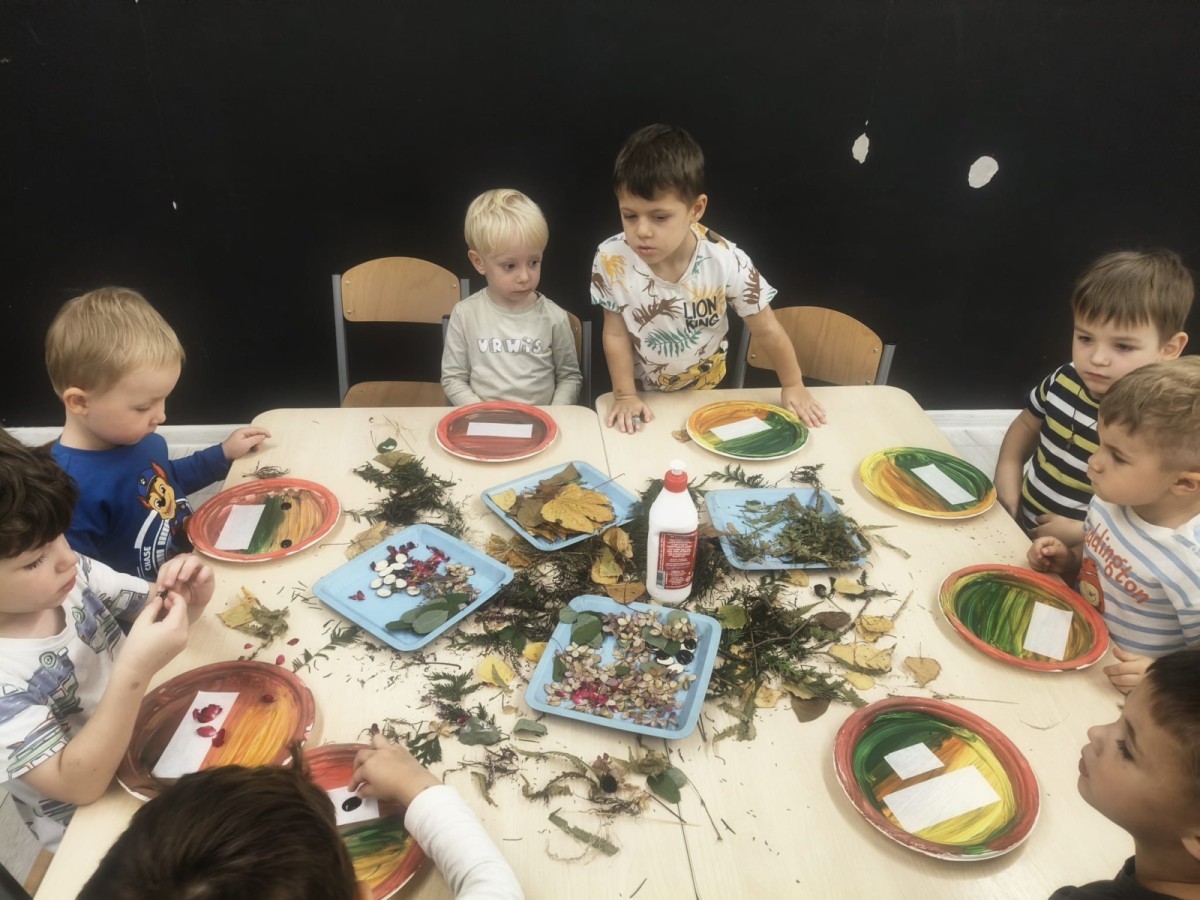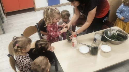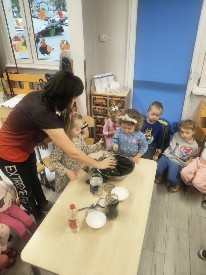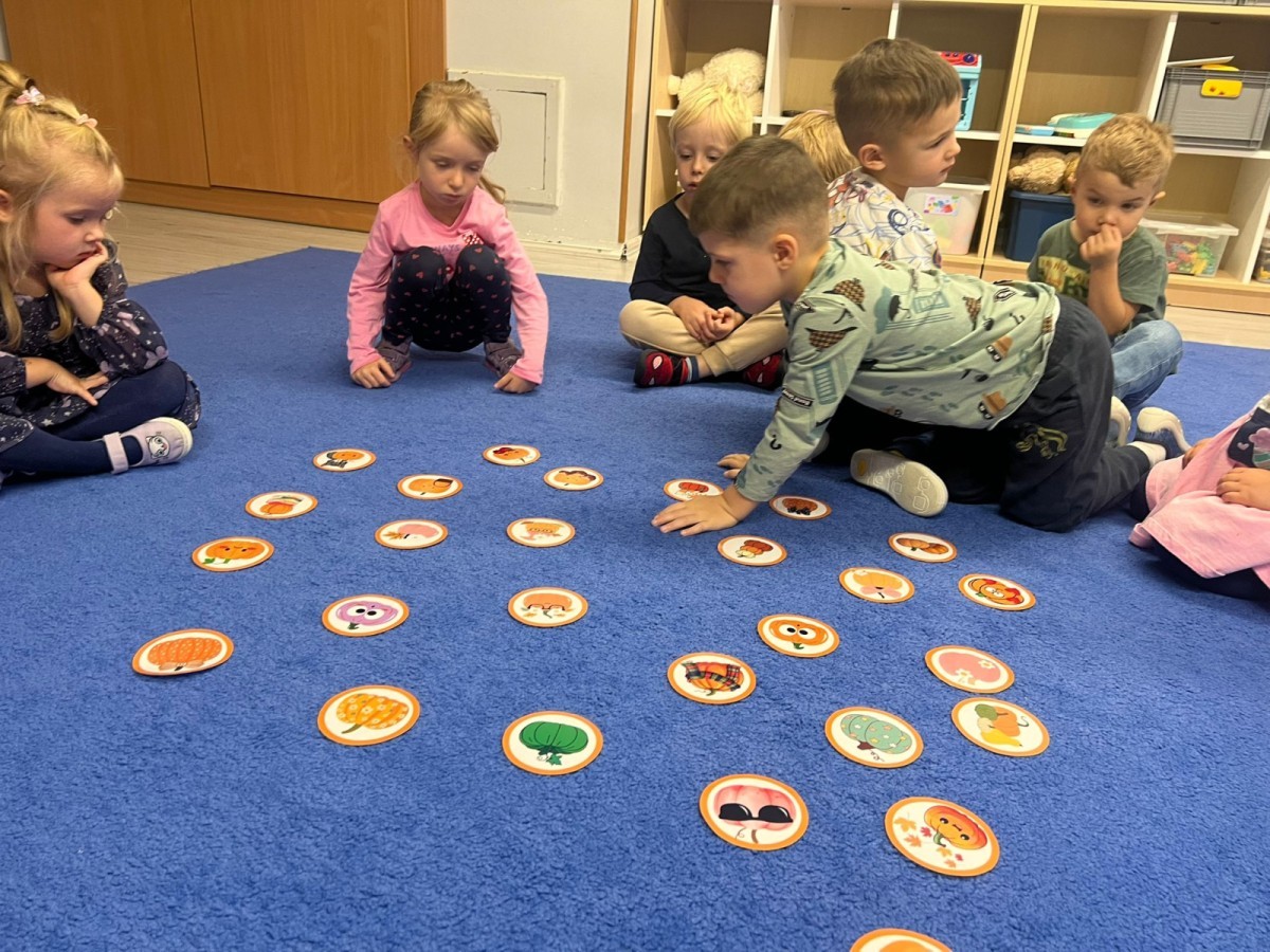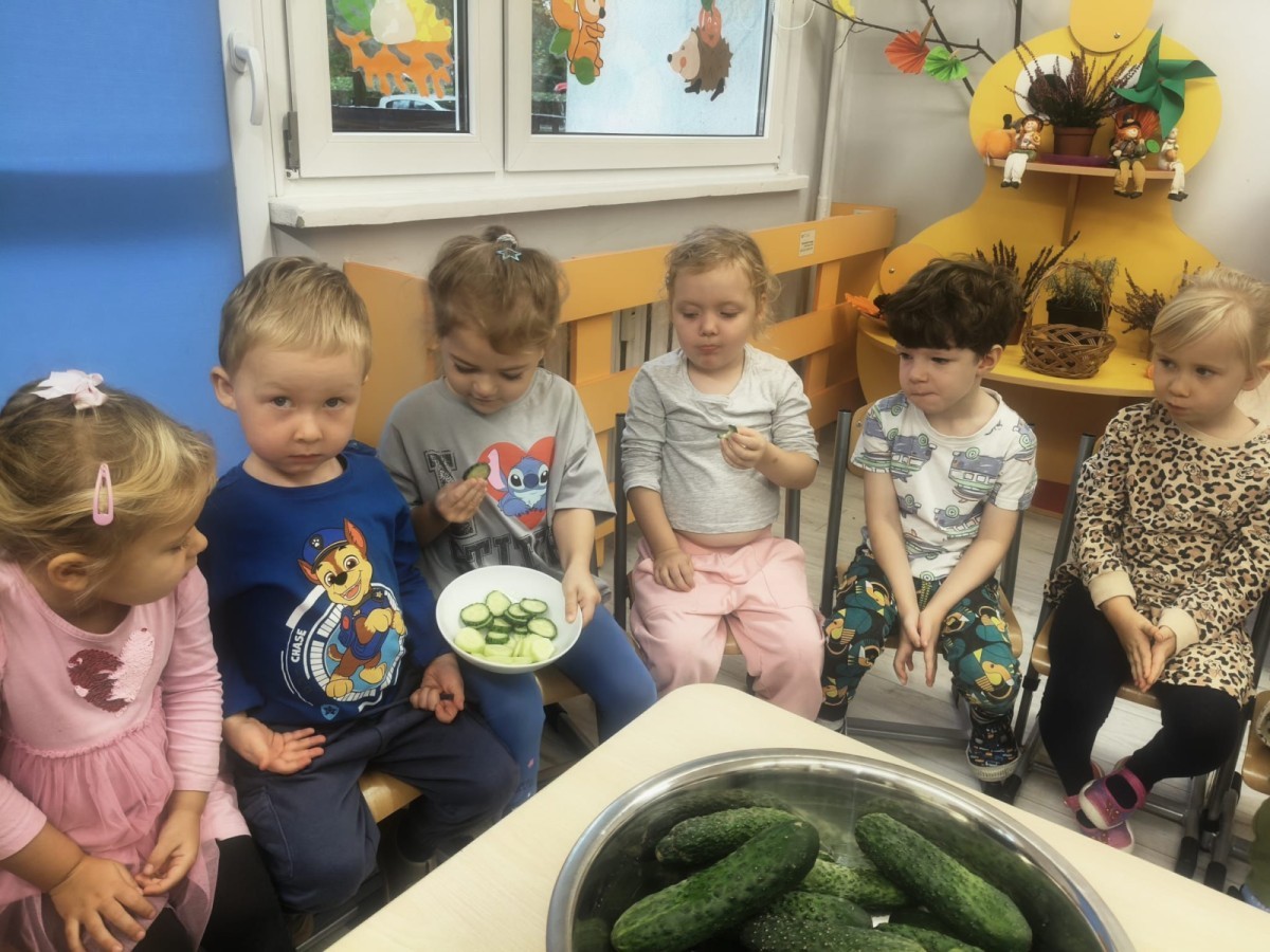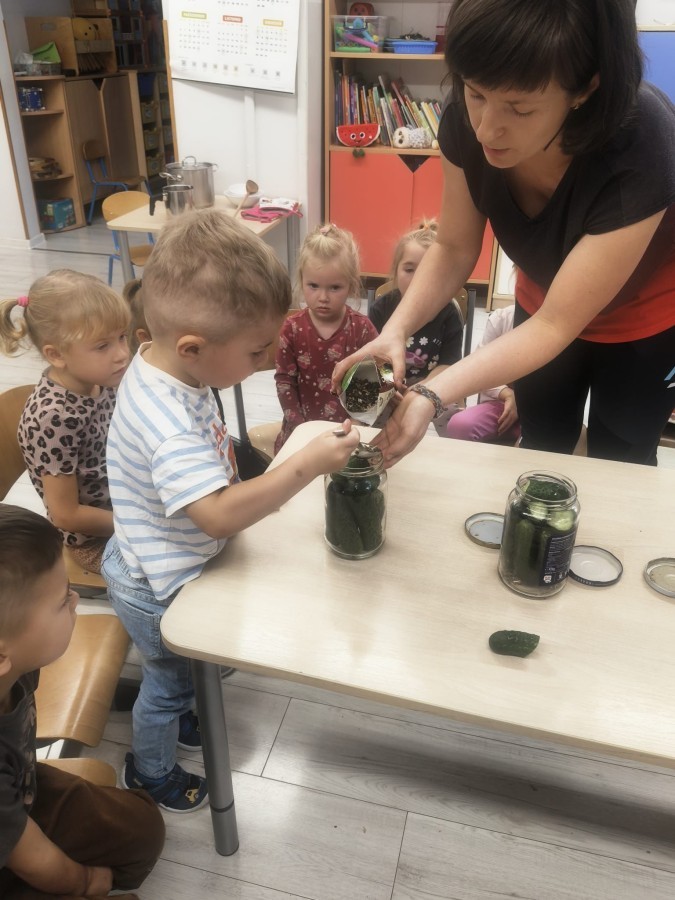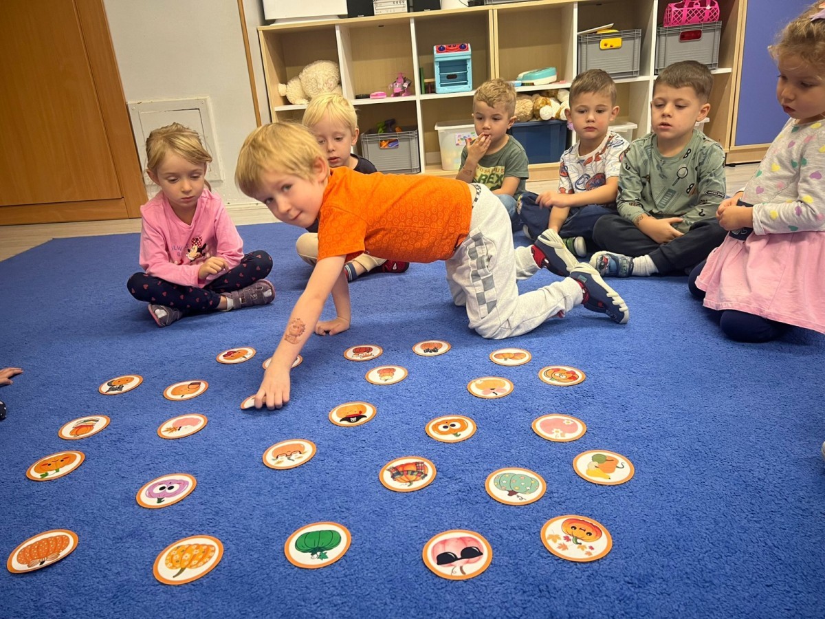 z wykorzystaniem darów tej pięknej pory roku. Na początku przedszkolaki układały wieże z kubeczków z darami jesieni według pokazanego wzoru, Następnie podczas zabawy z kostką dzieci rzucały i układały na drzewie tyle jesiennych warzyw lub owoców, ile oczek wypadło – to była świetna okazja do nauki liczenia poprzez zabawę! Nie zabrakło również zabawy z liśćmi – dzieci ćwiczyły spostrzegawczość i logiczne myślenie, układając kolorowe listki od najmniejszego do największego (lub odwrotnie). Przedszkolaki chętnie segregowały liście według koloru lub rozmiaru, rozwijając przy tym umiejętność klasyfikacji i porównywania. Podczas ćwiczeń percepcji wzrokowej dzieci próbowały odnaleźć taką samą dynię, jaka została opisana przez nauczyciela – zadanie wymagało uważności i koncentracji. Nie zabrakło także sensorycznej pracy plastycznej – mali artyści tworzyli jesienne kompozycje z liści, kwiatów, kamieni i traw, rozwijając wyobraźnię i wrażliwość na piękno przyrody. Dużą atrakcją okazały się zajęcia kulinarne – dzieci robiły od podstaw ogórki korniszone, poznawały różne przyprawy, wąchały je i smakowały, a na koniec odbyła się degustacja ogóreczków. Na zakończenie przedszkolaki wybrały się na jesienny spacer, podczas którego zbierały liście i bawiły się nimi.
