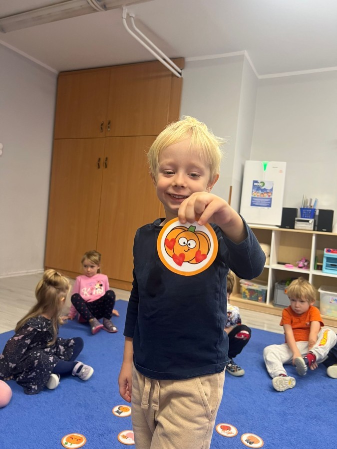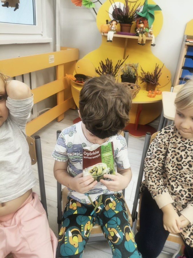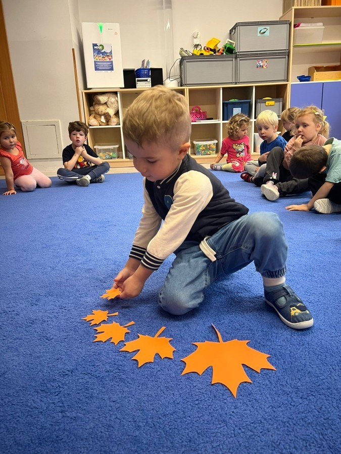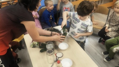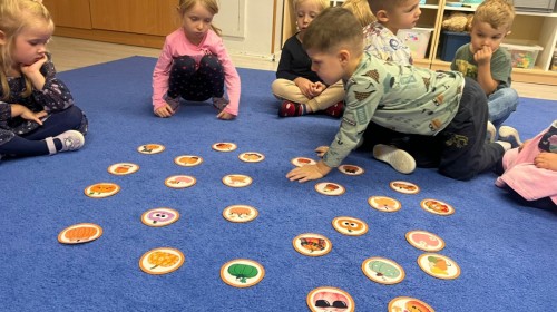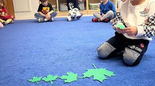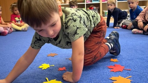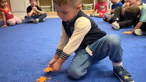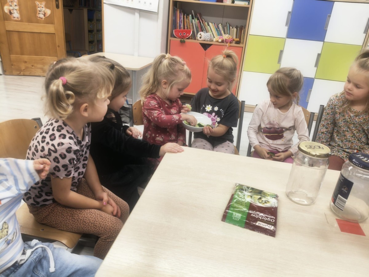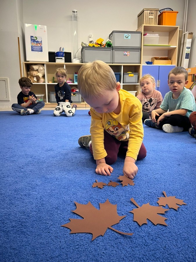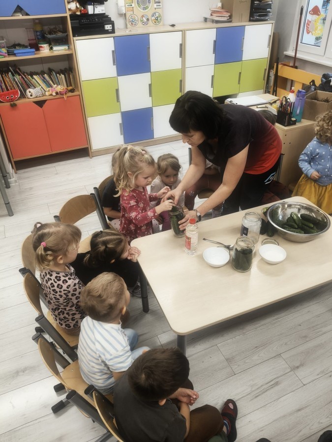 z wykorzystaniem darów tej pięknej pory roku. Na początku przedszkolaki układały wieże z kubeczków z darami jesieni według pokazanego wzoru, Następnie podczas zabawy z kostką dzieci rzucały i układały na drzewie tyle jesiennych warzyw lub owoców, ile oczek wypadło – to była świetna okazja do nauki liczenia poprzez zabawę! Nie zabrakło również zabawy z liśćmi – dzieci ćwiczyły spostrzegawczość i logiczne myślenie, układając kolorowe listki od najmniejszego do największego (lub odwrotnie). Przedszkolaki chętnie segregowały liście według koloru lub rozmiaru, rozwijając przy tym umiejętność klasyfikacji i porównywania. Podczas ćwiczeń percepcji wzrokowej dzieci próbowały odnaleźć taką samą dynię, jaka została opisana przez nauczyciela – zadanie wymagało uważności i koncentracji. Nie zabrakło także sensorycznej pracy plastycznej – mali artyści tworzyli jesienne kompozycje z liści, kwiatów, kamieni i traw, rozwijając wyobraźnię i wrażliwość na piękno przyrody. Dużą atrakcją okazały się zajęcia kulinarne – dzieci robiły od podstaw ogórki korniszone, poznawały różne przyprawy, wąchały je i smakowały, a na koniec odbyła się degustacja ogóreczków. Na zakończenie przedszkolaki wybrały się na jesienny spacer, podczas którego zbierały liście i bawiły się nimi.