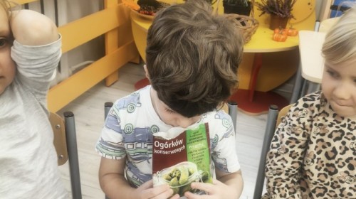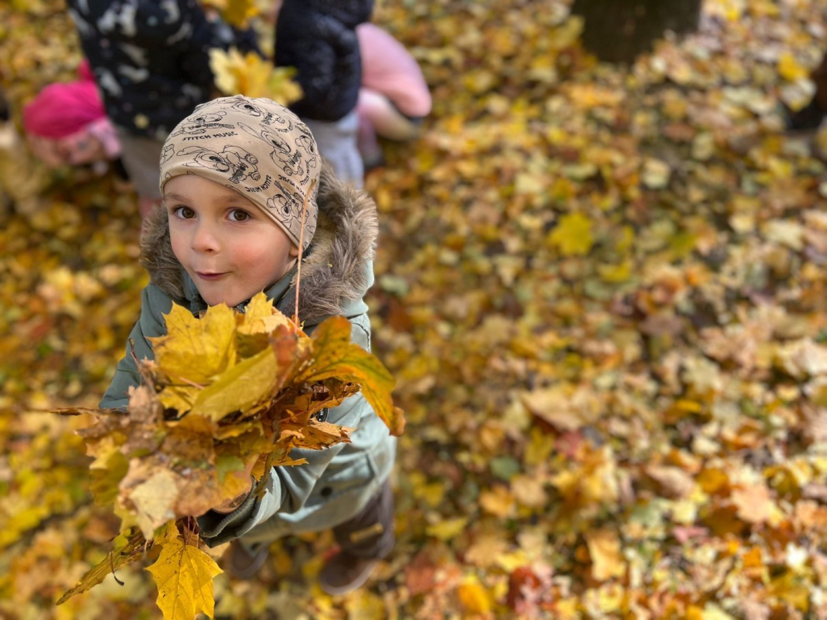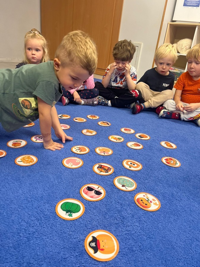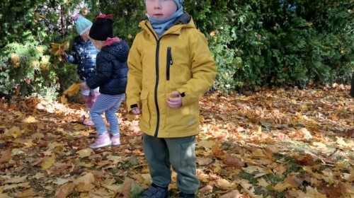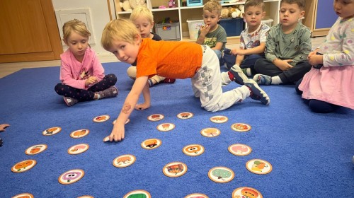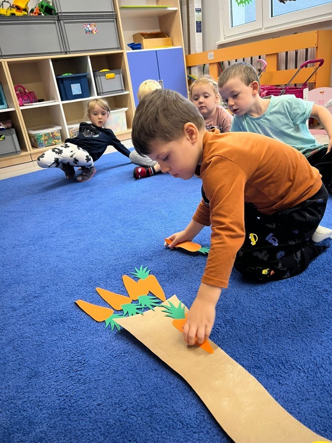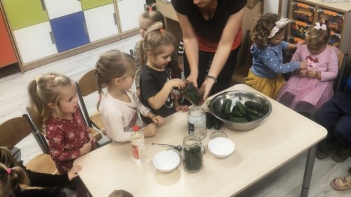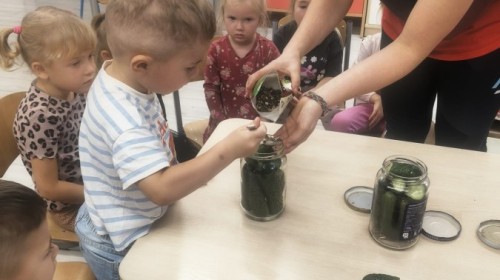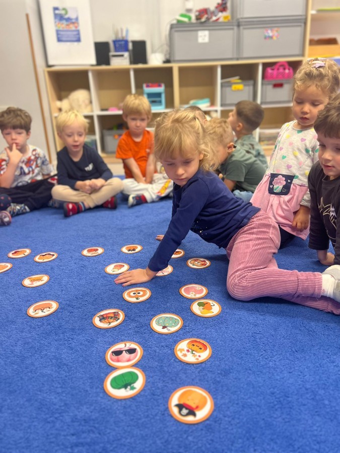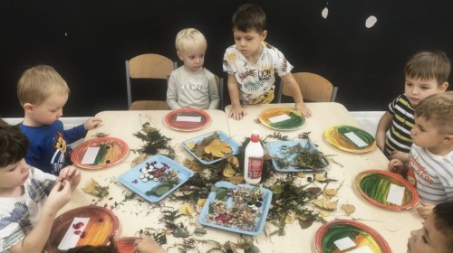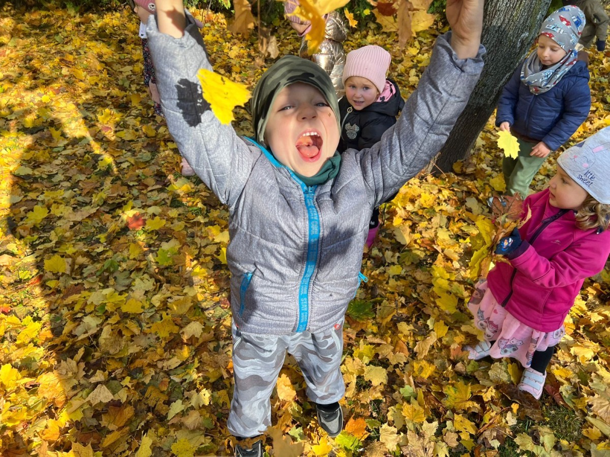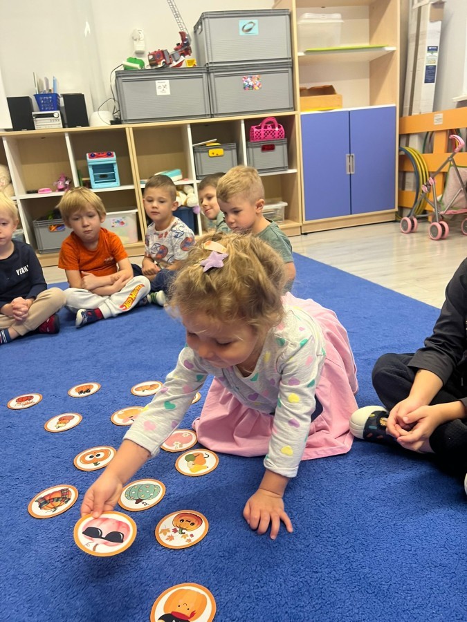 z wykorzystaniem darów tej pięknej pory roku. Na początku przedszkolaki układały wieże z kubeczków z darami jesieni według pokazanego wzoru, Następnie podczas zabawy z kostką dzieci rzucały i układały na drzewie tyle jesiennych warzyw lub owoców, ile oczek wypadło – to była świetna okazja do nauki liczenia poprzez zabawę! Nie zabrakło również zabawy z liśćmi – dzieci ćwiczyły spostrzegawczość i logiczne myślenie, układając kolorowe listki od najmniejszego do największego (lub odwrotnie). Przedszkolaki chętnie segregowały liście według koloru lub rozmiaru, rozwijając przy tym umiejętność klasyfikacji i porównywania. Podczas ćwiczeń percepcji wzrokowej dzieci próbowały odnaleźć taką samą dynię, jaka została opisana przez nauczyciela – zadanie wymagało uważności i koncentracji. Nie zabrakło także sensorycznej pracy plastycznej – mali artyści tworzyli jesienne kompozycje z liści, kwiatów, kamieni i traw, rozwijając wyobraźnię i wrażliwość na piękno przyrody. Dużą atrakcją okazały się zajęcia kulinarne – dzieci robiły od podstaw ogórki korniszone, poznawały różne przyprawy, wąchały je i smakowały, a na koniec odbyła się degustacja ogóreczków. Na zakończenie przedszkolaki wybrały się na jesienny spacer, podczas którego zbierały liście i bawiły się nimi.