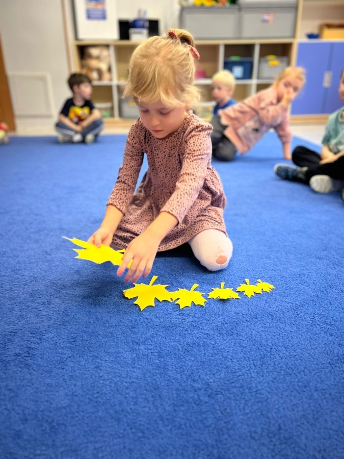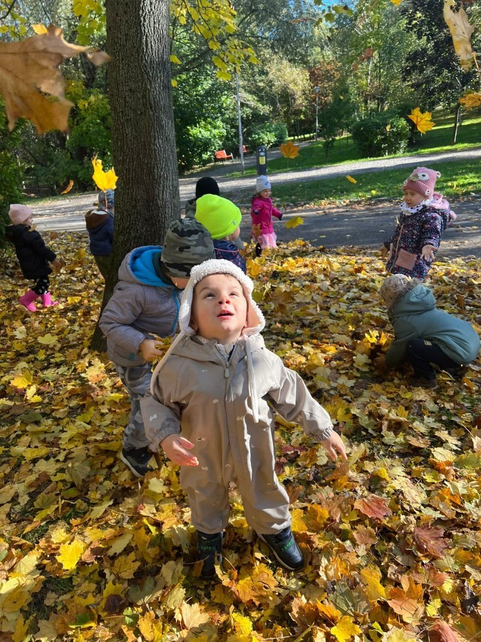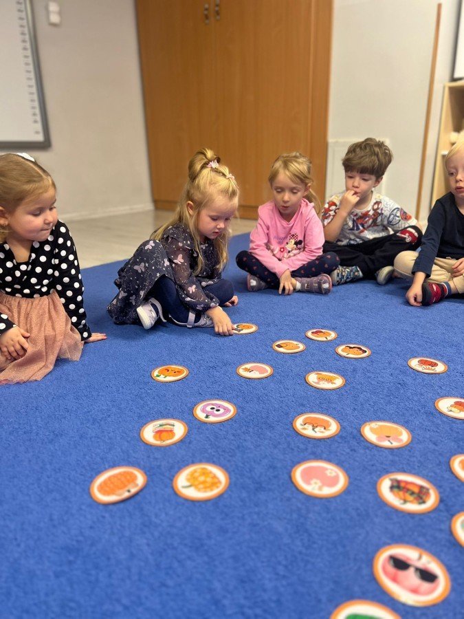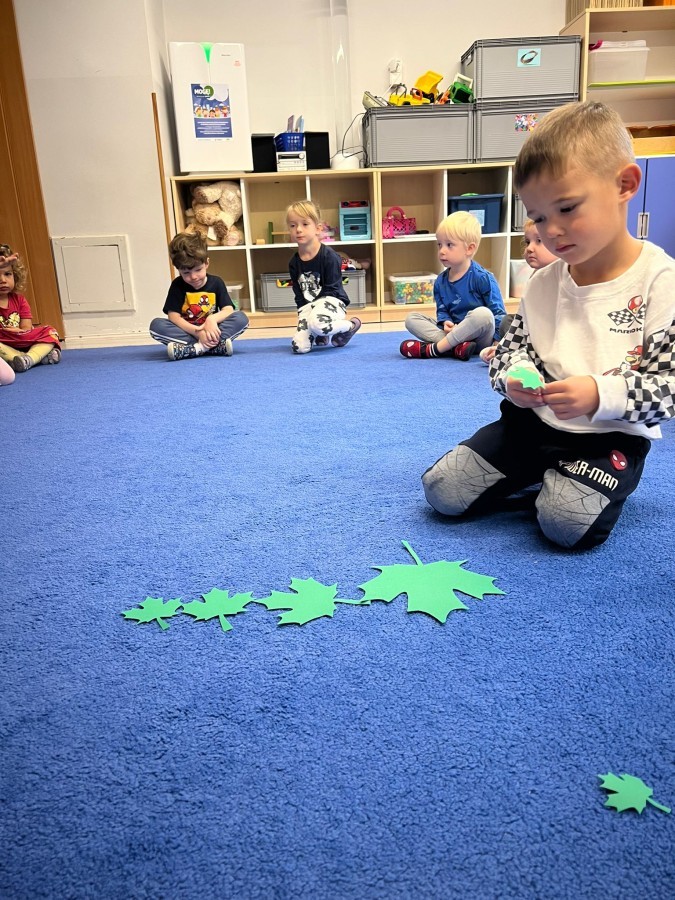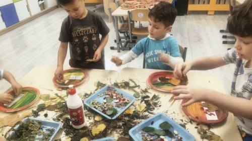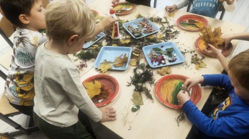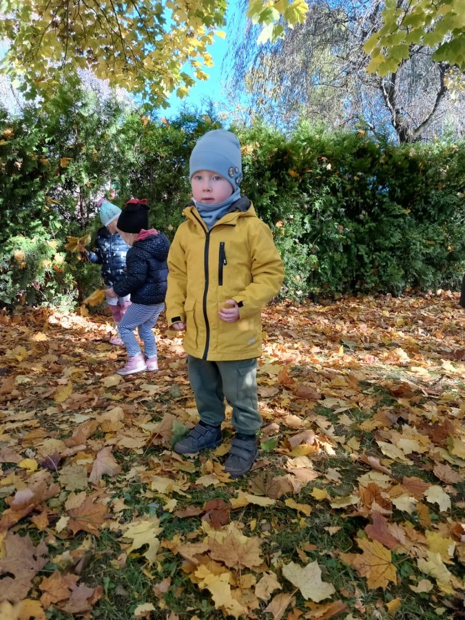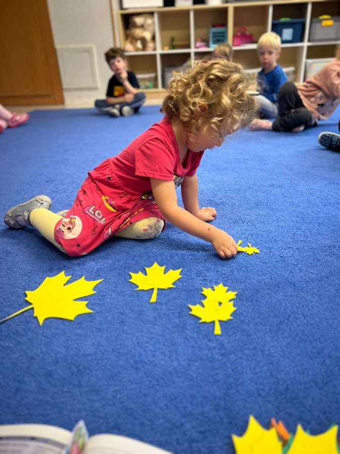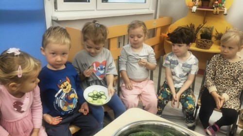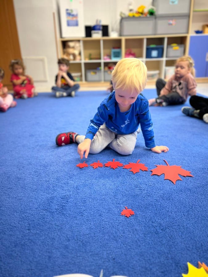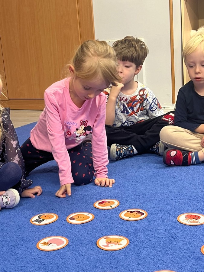 z wykorzystaniem darów tej pięknej pory roku. Na początku przedszkolaki układały wieże z kubeczków z darami jesieni według pokazanego wzoru, Następnie podczas zabawy z kostką dzieci rzucały i układały na drzewie tyle jesiennych warzyw lub owoców, ile oczek wypadło – to była świetna okazja do nauki liczenia poprzez zabawę! Nie zabrakło również zabawy z liśćmi – dzieci ćwiczyły spostrzegawczość i logiczne myślenie, układając kolorowe listki od najmniejszego do największego (lub odwrotnie). Przedszkolaki chętnie segregowały liście według koloru lub rozmiaru, rozwijając przy tym umiejętność klasyfikacji i porównywania. Podczas ćwiczeń percepcji wzrokowej dzieci próbowały odnaleźć taką samą dynię, jaka została opisana przez nauczyciela – zadanie wymagało uważności i koncentracji. Nie zabrakło także sensorycznej pracy plastycznej – mali artyści tworzyli jesienne kompozycje z liści, kwiatów, kamieni i traw, rozwijając wyobraźnię i wrażliwość na piękno przyrody. Dużą atrakcją okazały się zajęcia kulinarne – dzieci robiły od podstaw ogórki korniszone, poznawały różne przyprawy, wąchały je i smakowały, a na koniec odbyła się degustacja ogóreczków. Na zakończenie przedszkolaki wybrały się na jesienny spacer, podczas którego zbierały liście i bawiły się nimi.