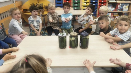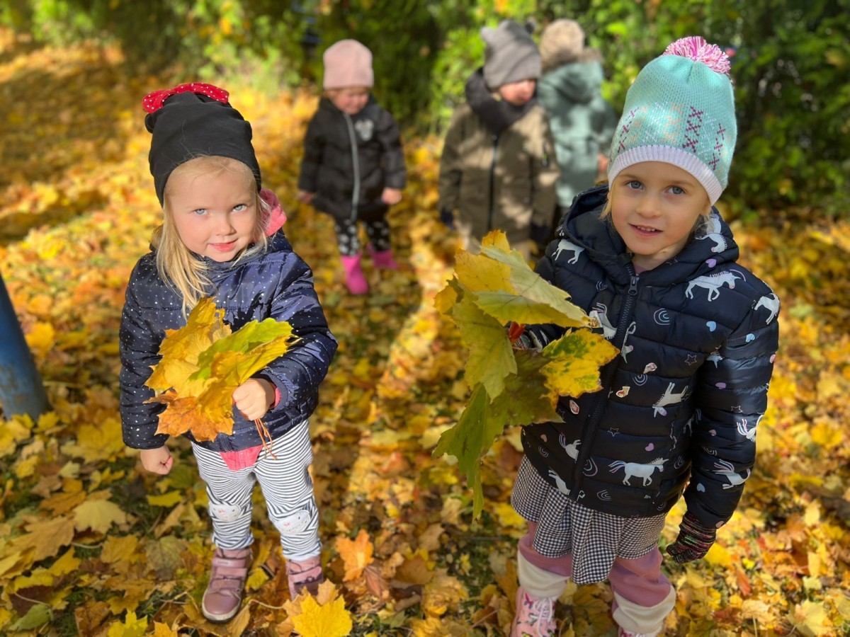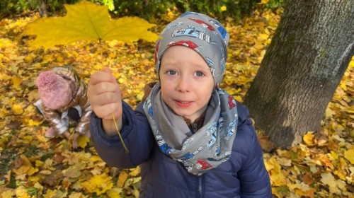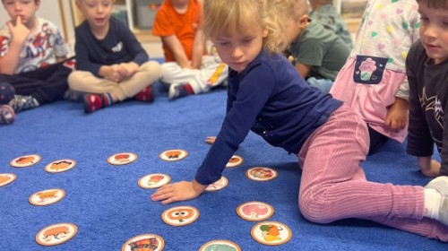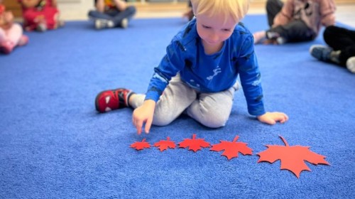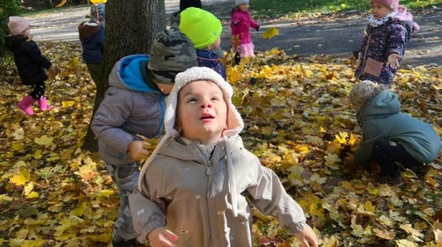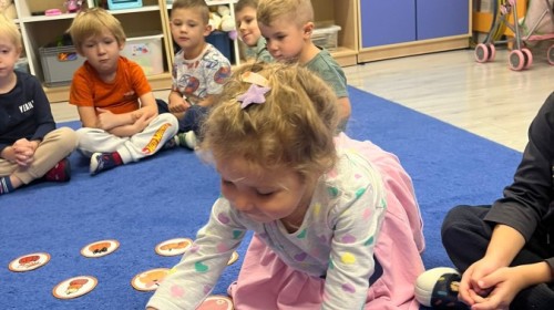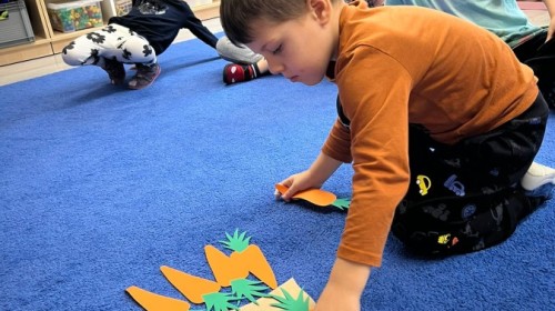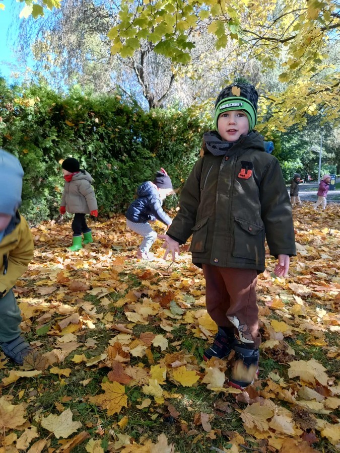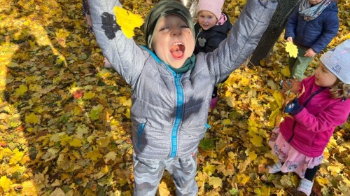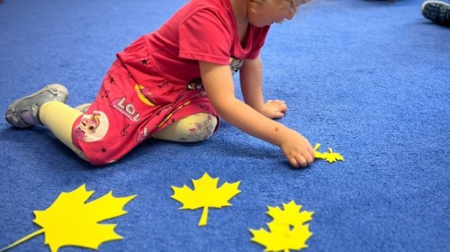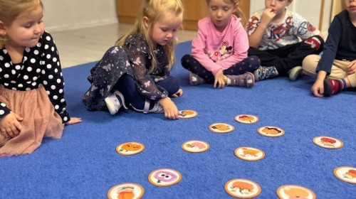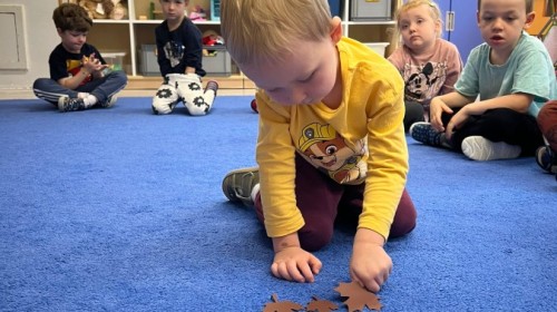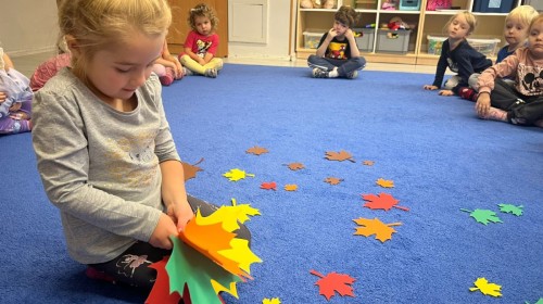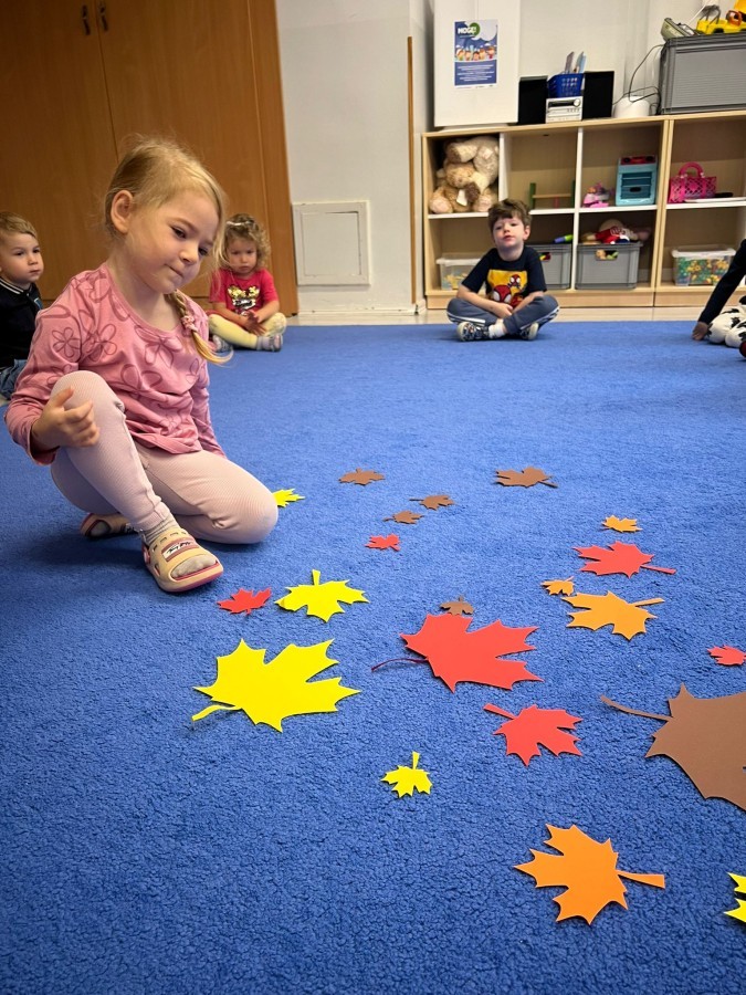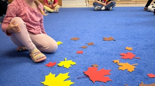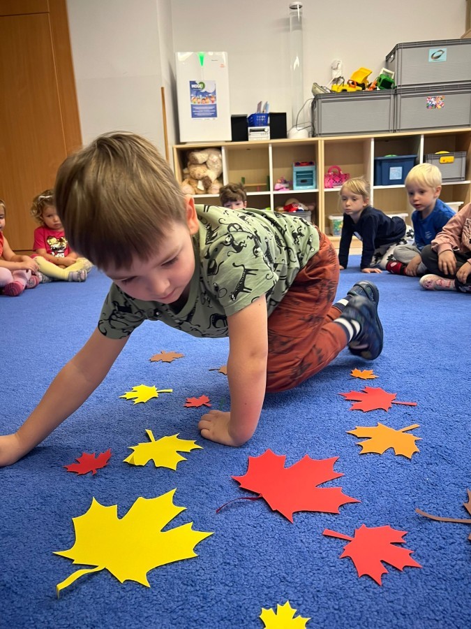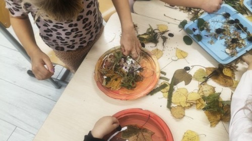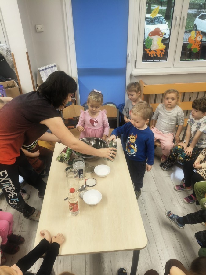 z wykorzystaniem darów tej pięknej pory roku. Na początku przedszkolaki układały wieże z kubeczków z darami jesieni według pokazanego wzoru, Następnie podczas zabawy z kostką dzieci rzucały i układały na drzewie tyle jesiennych warzyw lub owoców, ile oczek wypadło – to była świetna okazja do nauki liczenia poprzez zabawę! Nie zabrakło również zabawy z liśćmi – dzieci ćwiczyły spostrzegawczość i logiczne myślenie, układając kolorowe listki od najmniejszego do największego (lub odwrotnie). Przedszkolaki chętnie segregowały liście według koloru lub rozmiaru, rozwijając przy tym umiejętność klasyfikacji i porównywania. Podczas ćwiczeń percepcji wzrokowej dzieci próbowały odnaleźć taką samą dynię, jaka została opisana przez nauczyciela – zadanie wymagało uważności i koncentracji. Nie zabrakło także sensorycznej pracy plastycznej – mali artyści tworzyli jesienne kompozycje z liści, kwiatów, kamieni i traw, rozwijając wyobraźnię i wrażliwość na piękno przyrody. Dużą atrakcją okazały się zajęcia kulinarne – dzieci robiły od podstaw ogórki korniszone, poznawały różne przyprawy, wąchały je i smakowały, a na koniec odbyła się degustacja ogóreczków. Na zakończenie przedszkolaki wybrały się na jesienny spacer, podczas którego zbierały liście i bawiły się nimi.