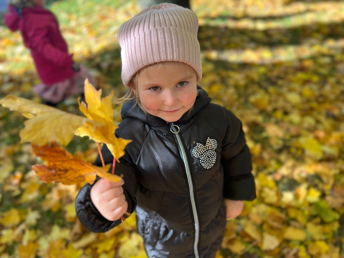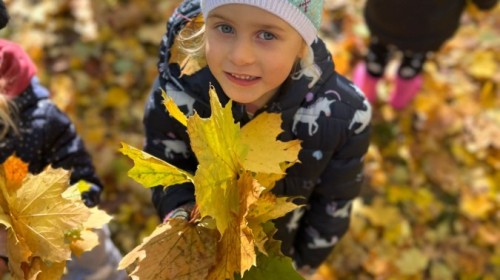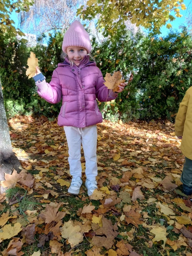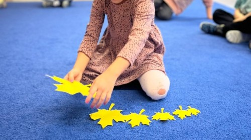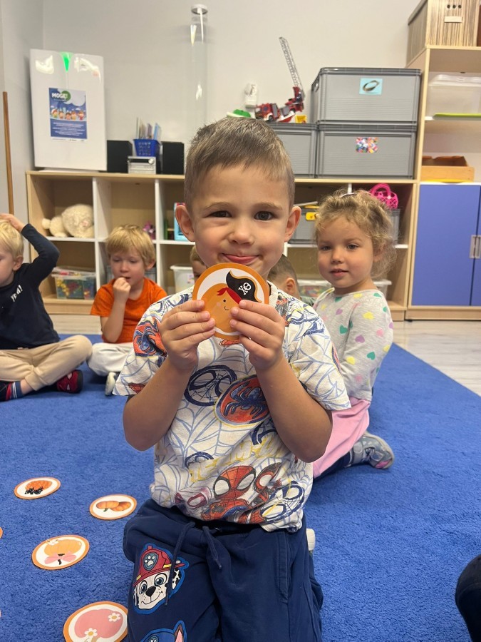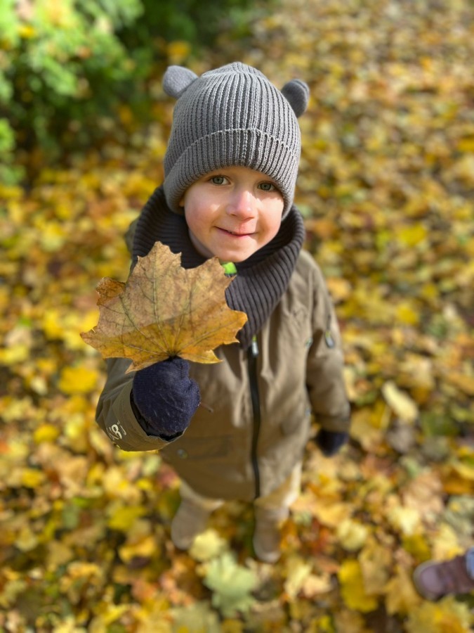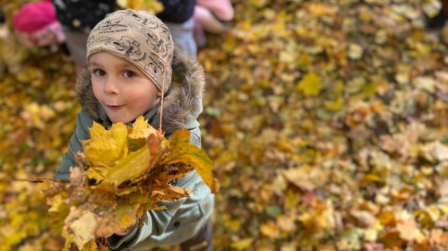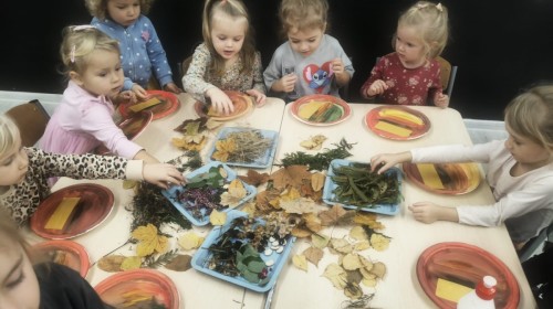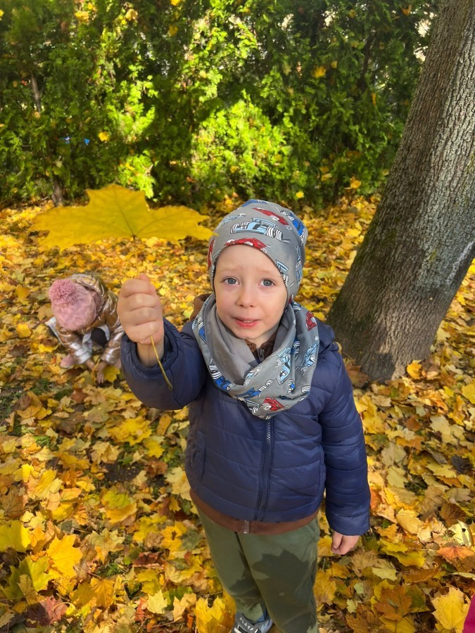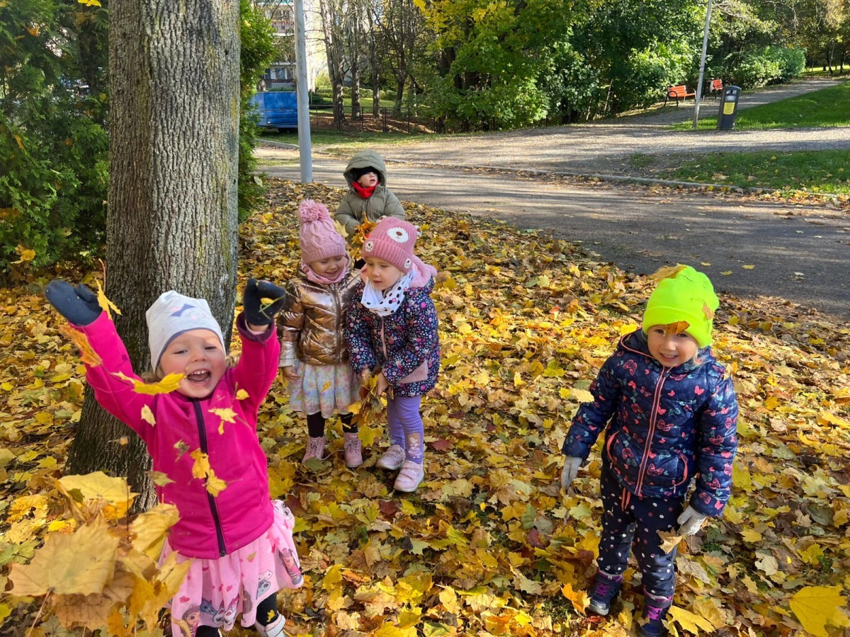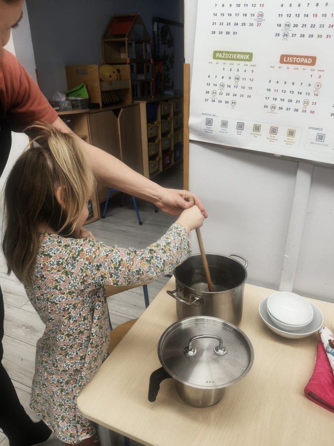 z wykorzystaniem darów tej pięknej pory roku. Na początku przedszkolaki układały wieże z kubeczków z darami jesieni według pokazanego wzoru, Następnie podczas zabawy z kostką dzieci rzucały i układały na drzewie tyle jesiennych warzyw lub owoców, ile oczek wypadło – to była świetna okazja do nauki liczenia poprzez zabawę! Nie zabrakło również zabawy z liśćmi – dzieci ćwiczyły spostrzegawczość i logiczne myślenie, układając kolorowe listki od najmniejszego do największego (lub odwrotnie). Przedszkolaki chętnie segregowały liście według koloru lub rozmiaru, rozwijając przy tym umiejętność klasyfikacji i porównywania. Podczas ćwiczeń percepcji wzrokowej dzieci próbowały odnaleźć taką samą dynię, jaka została opisana przez nauczyciela – zadanie wymagało uważności i koncentracji. Nie zabrakło także sensorycznej pracy plastycznej – mali artyści tworzyli jesienne kompozycje z liści, kwiatów, kamieni i traw, rozwijając wyobraźnię i wrażliwość na piękno przyrody. Dużą atrakcją okazały się zajęcia kulinarne – dzieci robiły od podstaw ogórki korniszone, poznawały różne przyprawy, wąchały je i smakowały, a na koniec odbyła się degustacja ogóreczków. Na zakończenie przedszkolaki wybrały się na jesienny spacer, podczas którego zbierały liście i bawiły się nimi.