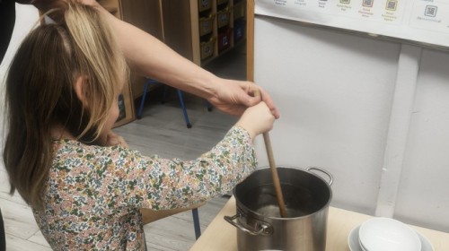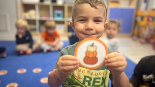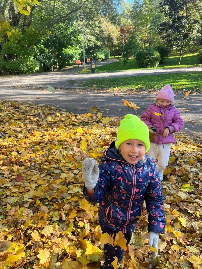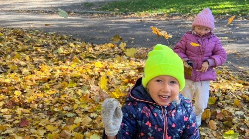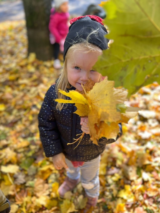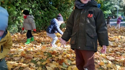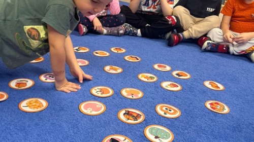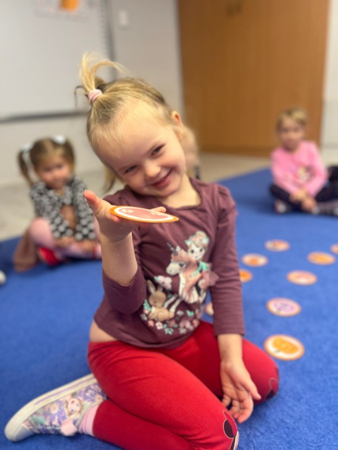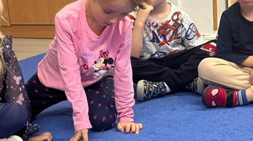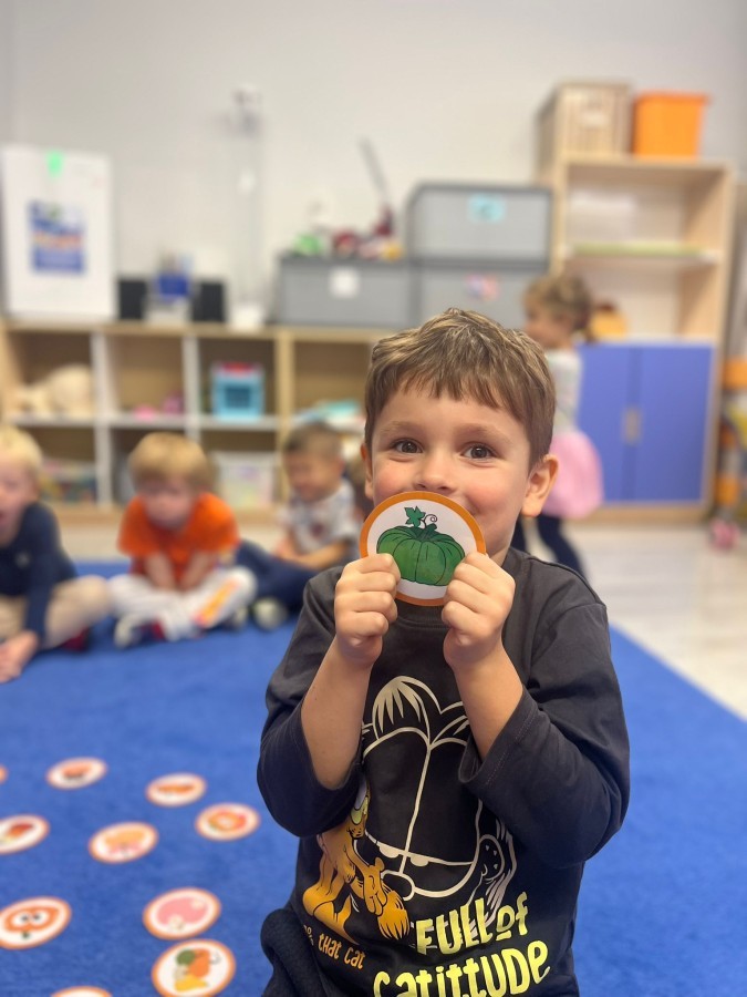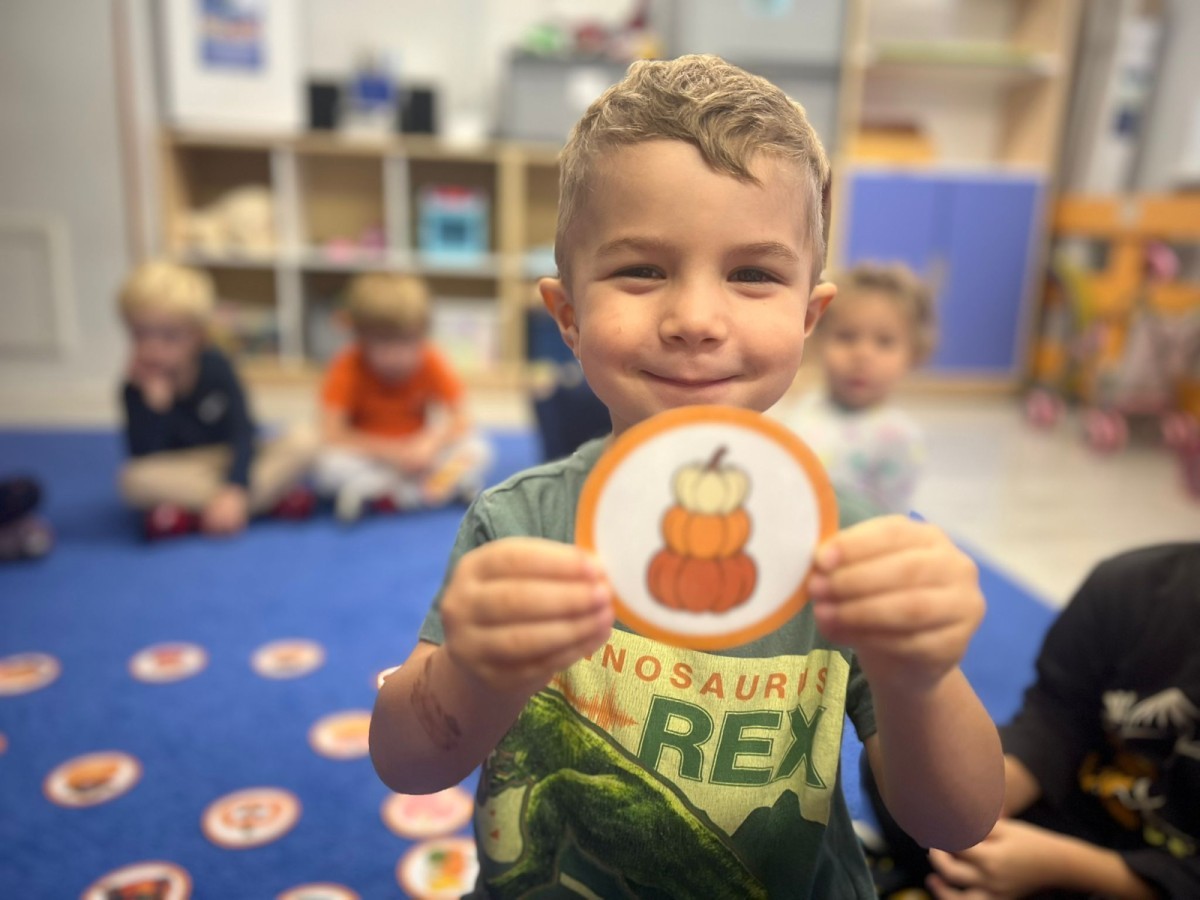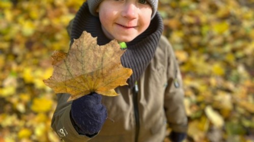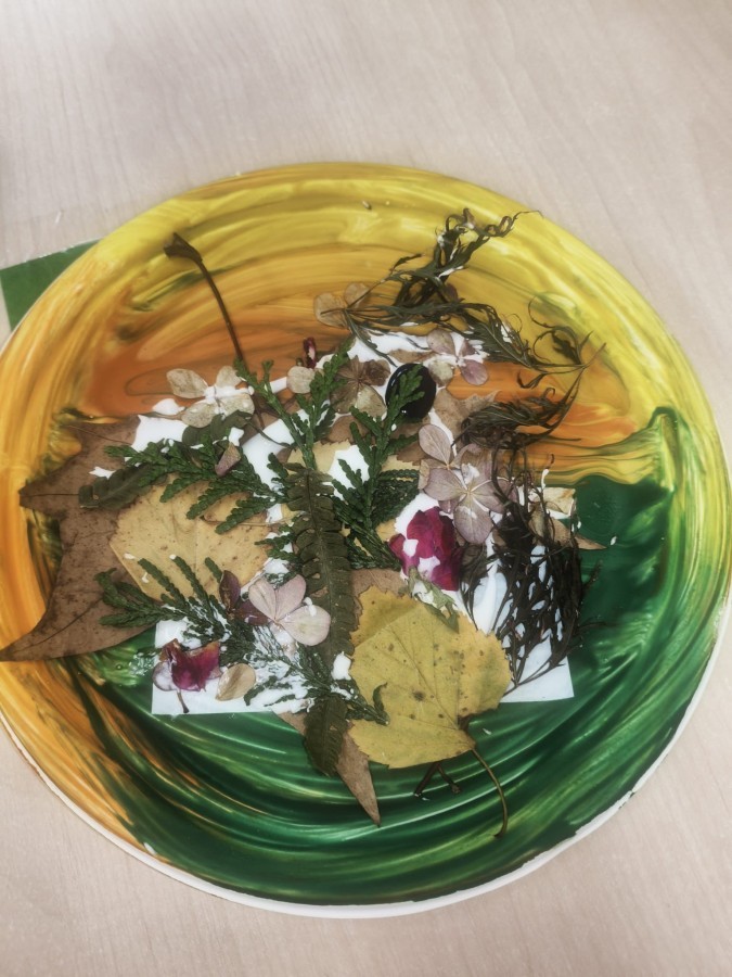 z wykorzystaniem darów tej pięknej pory roku. Na początku przedszkolaki układały wieże z kubeczków z darami jesieni według pokazanego wzoru, Następnie podczas zabawy z kostką dzieci rzucały i układały na drzewie tyle jesiennych warzyw lub owoców, ile oczek wypadło – to była świetna okazja do nauki liczenia poprzez zabawę! Nie zabrakło również zabawy z liśćmi – dzieci ćwiczyły spostrzegawczość i logiczne myślenie, układając kolorowe listki od najmniejszego do największego (lub odwrotnie). Przedszkolaki chętnie segregowały liście według koloru lub rozmiaru, rozwijając przy tym umiejętność klasyfikacji i porównywania. Podczas ćwiczeń percepcji wzrokowej dzieci próbowały odnaleźć taką samą dynię, jaka została opisana przez nauczyciela – zadanie wymagało uważności i koncentracji. Nie zabrakło także sensorycznej pracy plastycznej – mali artyści tworzyli jesienne kompozycje z liści, kwiatów, kamieni i traw, rozwijając wyobraźnię i wrażliwość na piękno przyrody. Dużą atrakcją okazały się zajęcia kulinarne – dzieci robiły od podstaw ogórki korniszone, poznawały różne przyprawy, wąchały je i smakowały, a na koniec odbyła się degustacja ogóreczków. Na zakończenie przedszkolaki wybrały się na jesienny spacer, podczas którego zbierały liście i bawiły się nimi.
