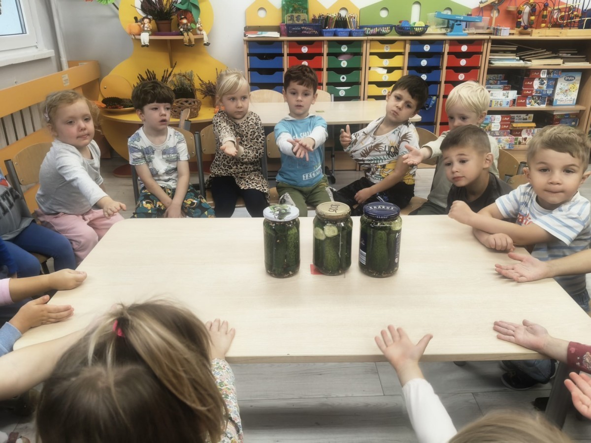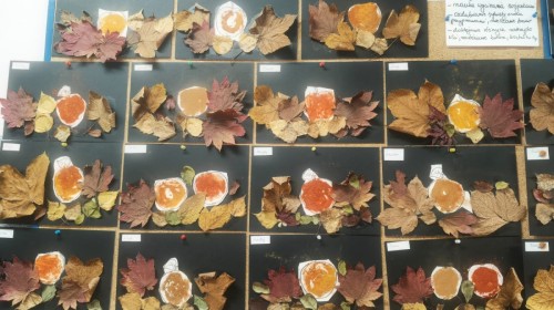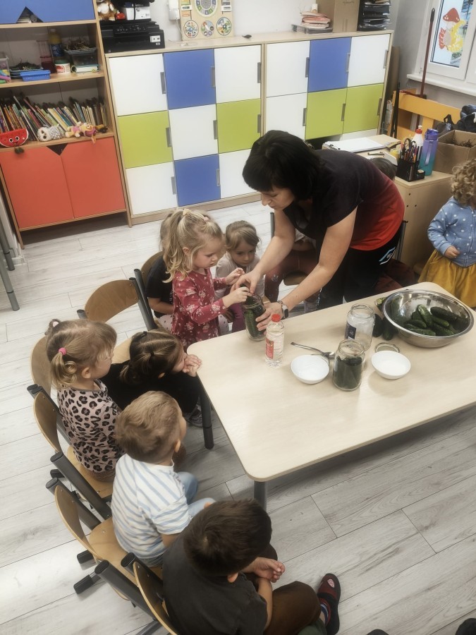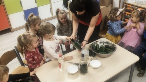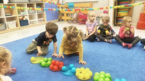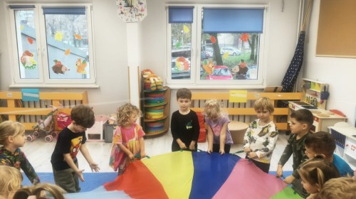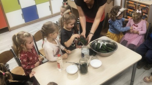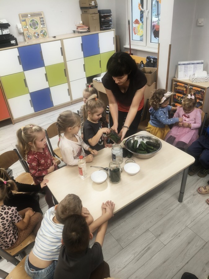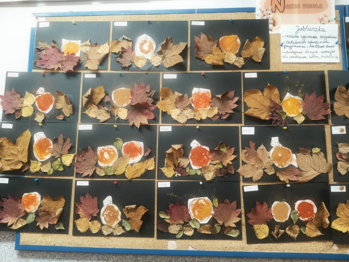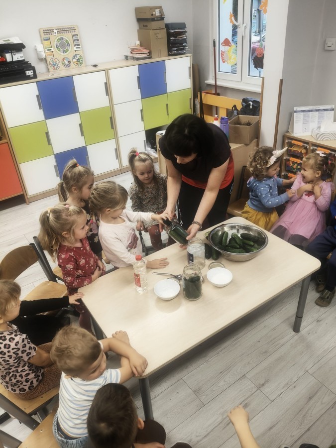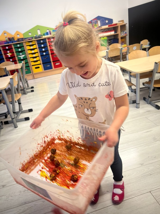 W dwóch ostatnich tygodniach w przedszkolu w grupie "Wiewiórek" dzieci bardzo dużo poznawały lub bawiły się poprzez różne zmysły i ruch. Do zajęć wykorzystywaliśmy chustę animacyjną, mnóstwo kolorowych piłek oraz nowy tor przeszkód. Te zabawy były świetnym sposobem na wsparcie i rozwijanie motoryki dużej i małej, koordynacji oraz integracji sensorycznej. Przy okazji dzieci utrwalały sobie nazwy kolorów, doskonaliły segregację i równowagę. "Wiewiórki" bawiły się też kolorem podczas zabaw z kasztanami, którymi malowały kartki - przy świetnej zabawie darami natury powstały, tak jakby przy okazji, wspaniałe prace plastyczne. Dzieci miały też okazję zrobić samodzielnie ogórki korniszone - dzięki temu poznały jeden ze sposobów robienia przetworów na zimę, a że takie ogórki szybko się robią, to dzieci miały już możliwość degustacji. Rozmawialiśmy tez o walorach zdrowotnych jedzenia kiszonych rzeczy. Nie zabrakło również próbowania innych warzyw. A na koniec tego tygodnia dzieci uczyły się posługiwać nożyczkami, by później przez zabawę różnymi kolorami przypraw ozdabiać sylwety jabłuszek. Do gotowego obrazka wykonanego w ten sposób doklejały kolorowe liście.