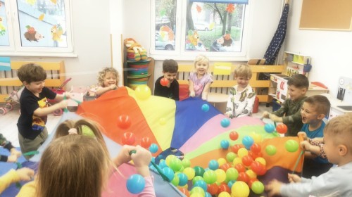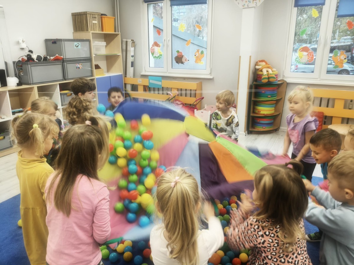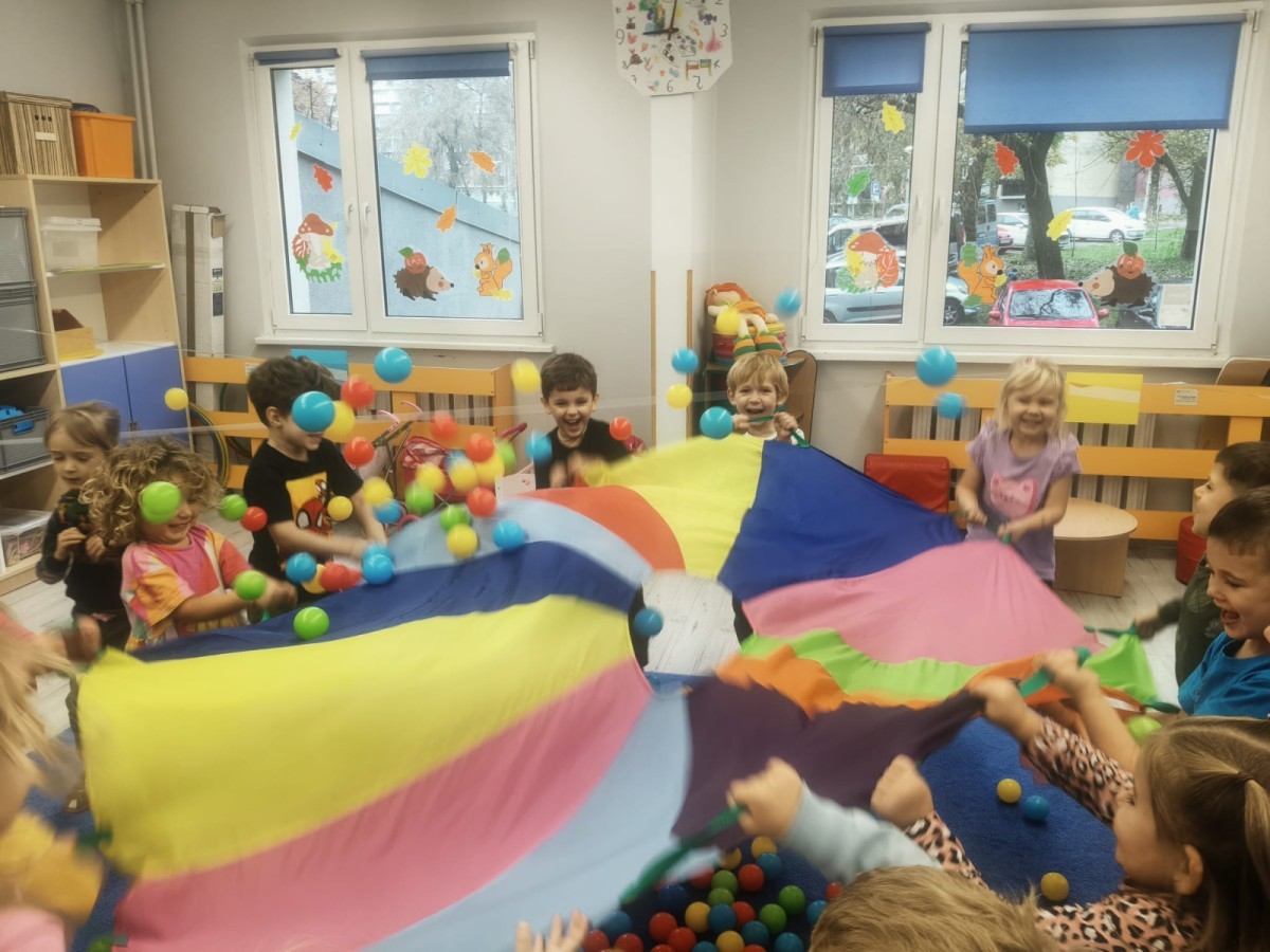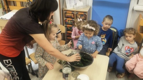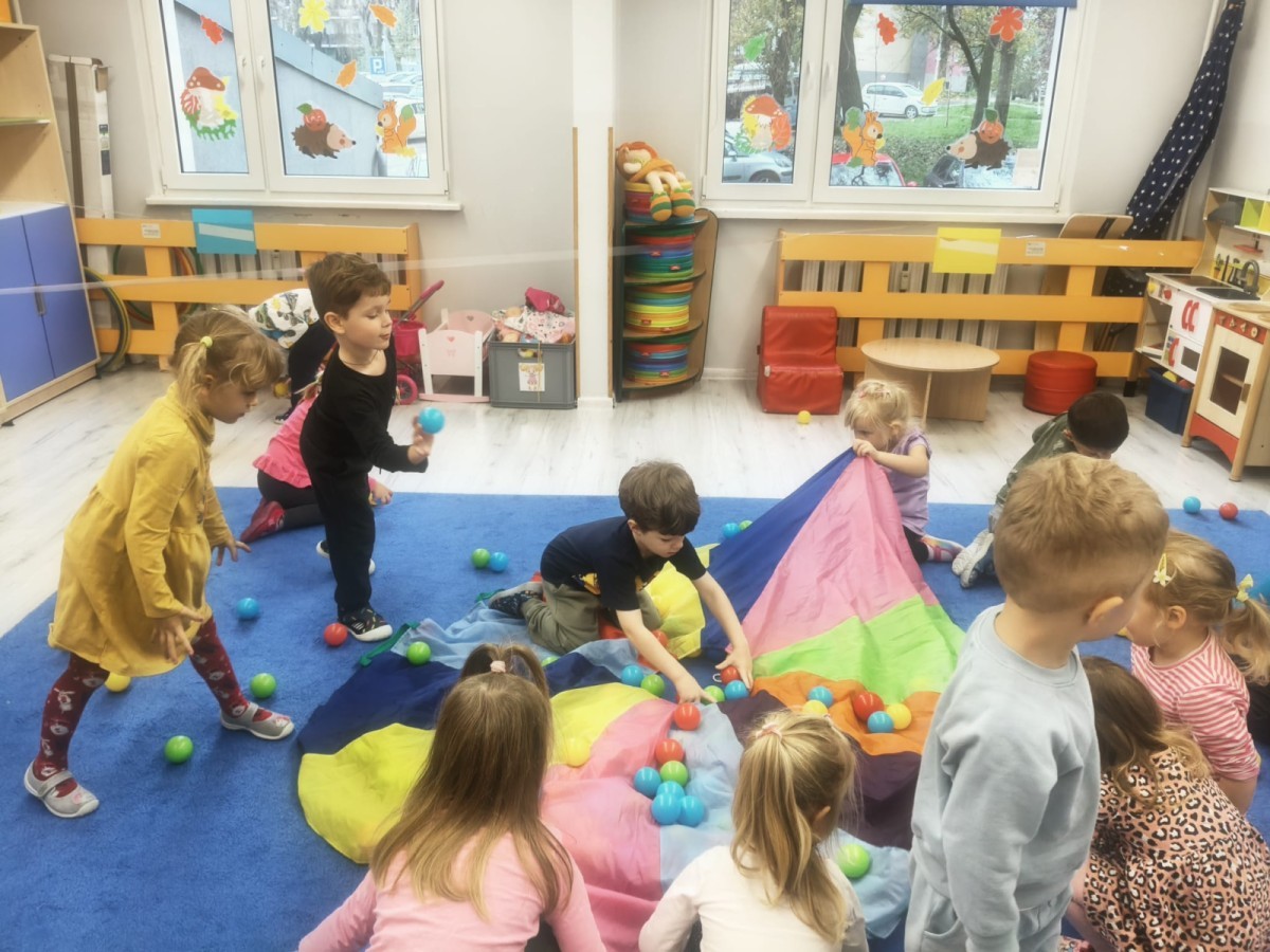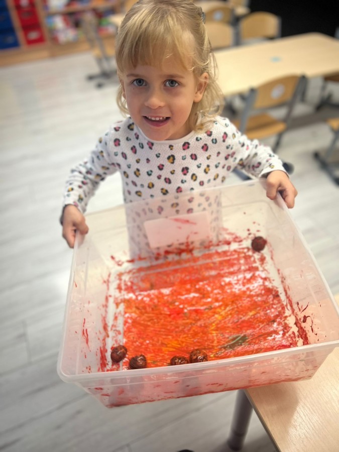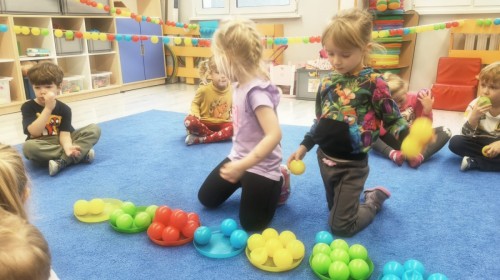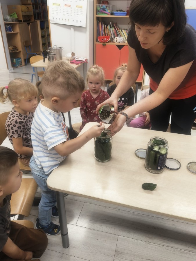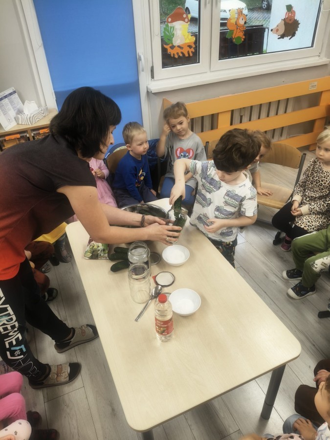W dwóch ostatnich tygodniach w przedszkolu w grupie "Wiewiórek" dzieci bardzo dużo poznawały lub bawiły się poprzez różne zmysły i ruch. Do zajęć wykorzystywaliśmy chustę animacyjną, mnóstwo kolorowych piłek oraz nowy tor przeszkód. Te zabawy były świetnym sposobem na wsparcie i rozwijanie motoryki dużej i małej, koordynacji oraz integracji sensorycznej. Przy okazji dzieci utrwalały sobie nazwy kolorów, doskonaliły segregację i równowagę. "Wiewiórki" bawiły się też kolorem podczas zabaw z kasztanami, którymi malowały kartki - przy świetnej zabawie darami natury powstały, tak jakby przy okazji, wspaniałe prace plastyczne. Dzieci miały też okazję zrobić samodzielnie ogórki korniszone - dzięki temu poznały jeden ze sposobów robienia przetworów na zimę, a że takie ogórki szybko się robią, to dzieci miały już możliwość degustacji. Rozmawialiśmy tez o walorach zdrowotnych jedzenia kiszonych rzeczy. Nie zabrakło również próbowania innych warzyw. A na koniec tego tygodnia dzieci uczyły się posługiwać nożyczkami, by później przez zabawę różnymi kolorami przypraw ozdabiać sylwety jabłuszek. Do gotowego obrazka wykonanego w ten sposób doklejały kolorowe liście.