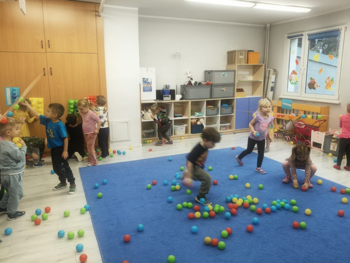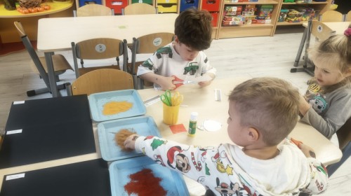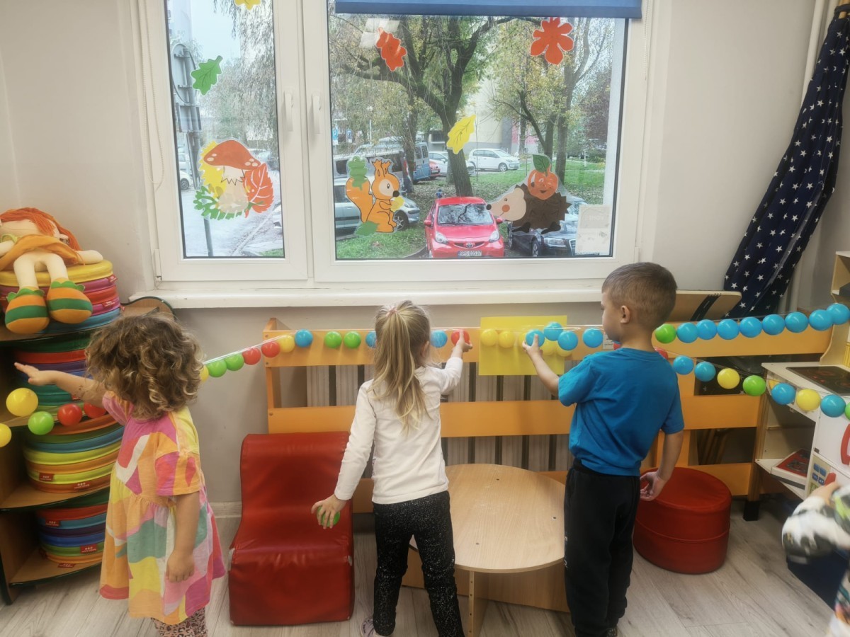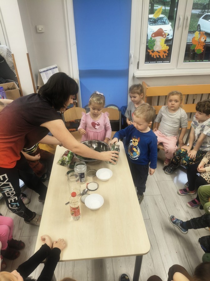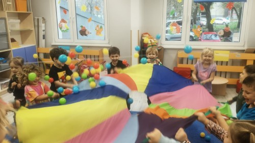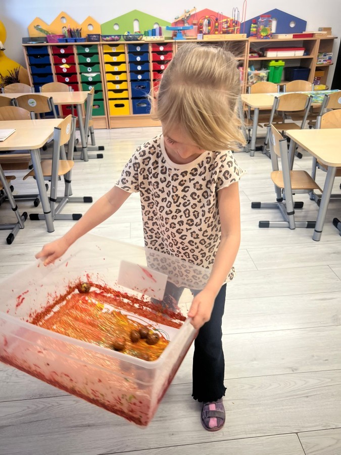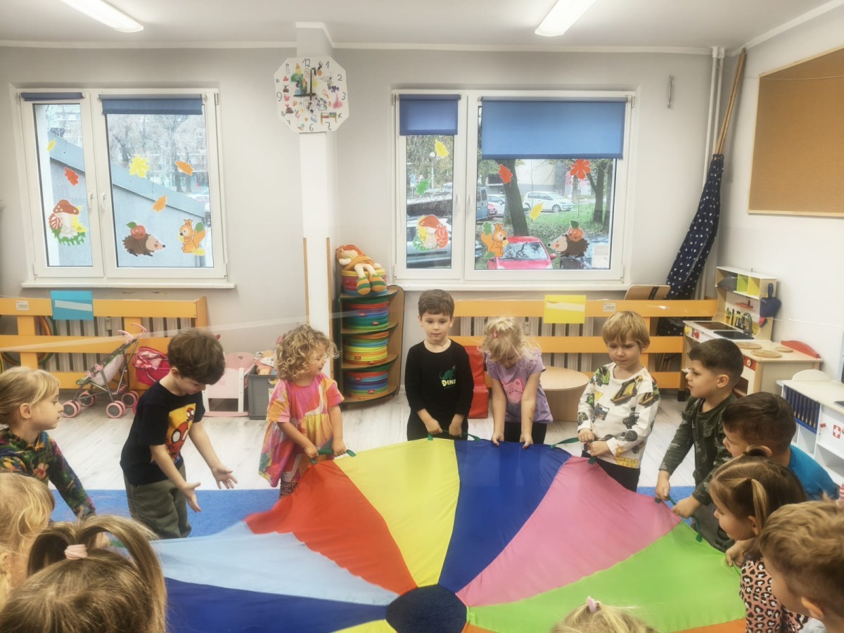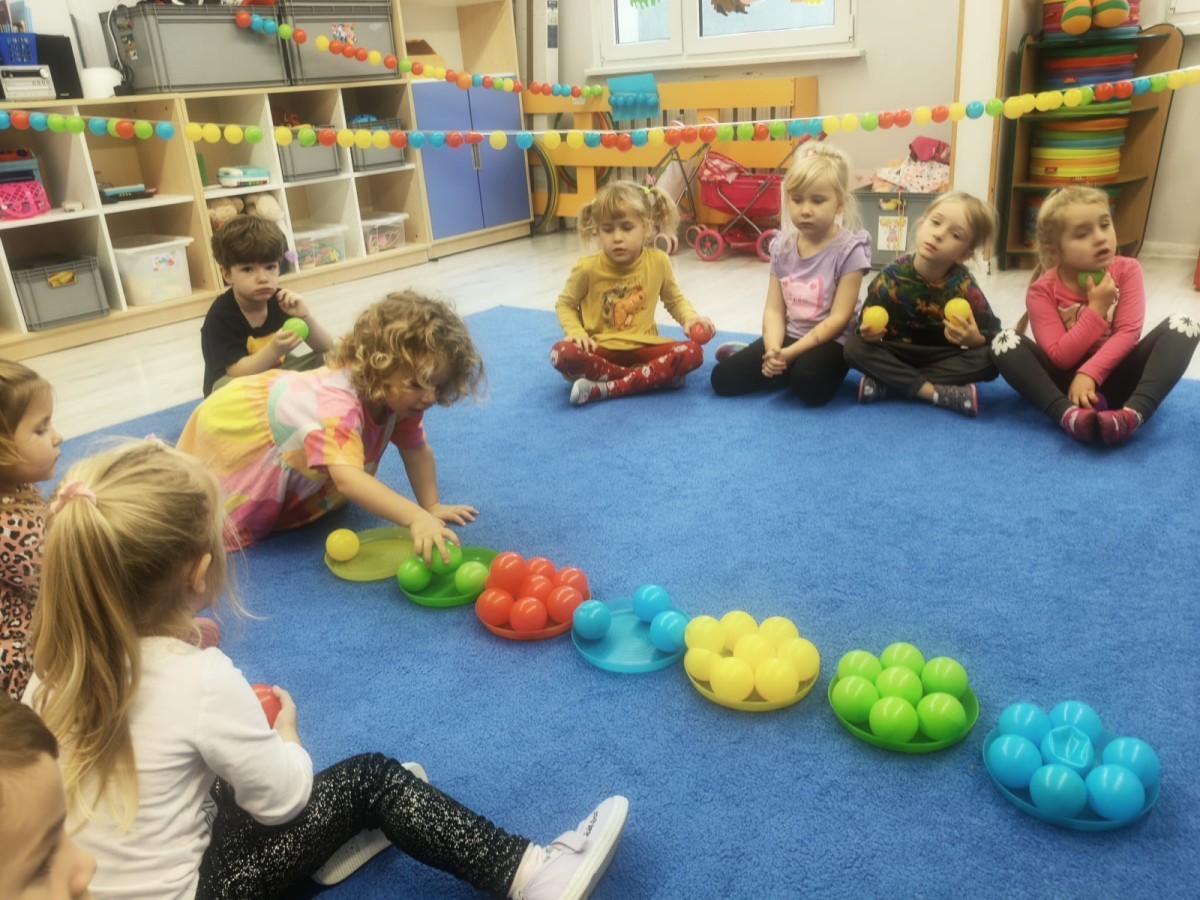 W dwóch ostatnich tygodniach w przedszkolu w grupie "Wiewiórek" dzieci bardzo dużo poznawały lub bawiły się poprzez różne zmysły i ruch. Do zajęć wykorzystywaliśmy chustę animacyjną, mnóstwo kolorowych piłek oraz nowy tor przeszkód. Te zabawy były świetnym sposobem na wsparcie i rozwijanie motoryki dużej i małej, koordynacji oraz integracji sensorycznej. Przy okazji dzieci utrwalały sobie nazwy kolorów, doskonaliły segregację i równowagę. "Wiewiórki" bawiły się też kolorem podczas zabaw z kasztanami, którymi malowały kartki - przy świetnej zabawie darami natury powstały, tak jakby przy okazji, wspaniałe prace plastyczne. Dzieci miały też okazję zrobić samodzielnie ogórki korniszone - dzięki temu poznały jeden ze sposobów robienia przetworów na zimę, a że takie ogórki szybko się robią, to dzieci miały już możliwość degustacji. Rozmawialiśmy tez o walorach zdrowotnych jedzenia kiszonych rzeczy. Nie zabrakło również próbowania innych warzyw. A na koniec tego tygodnia dzieci uczyły się posługiwać nożyczkami, by później przez zabawę różnymi kolorami przypraw ozdabiać sylwety jabłuszek. Do gotowego obrazka wykonanego w ten sposób doklejały kolorowe liście.