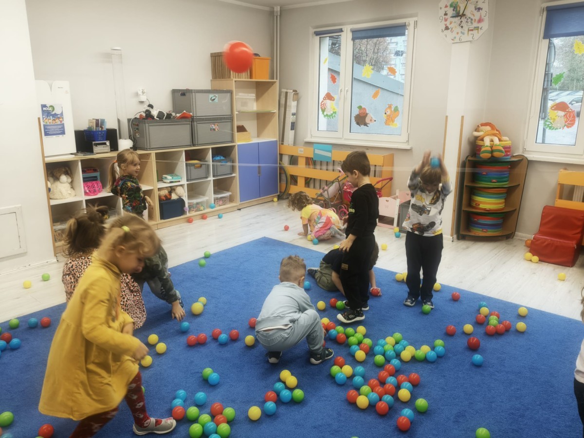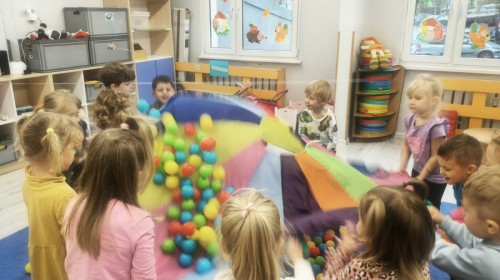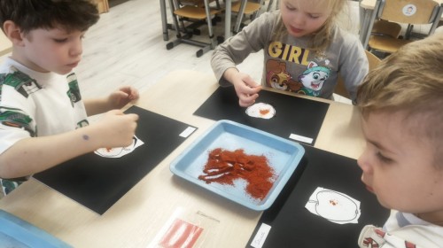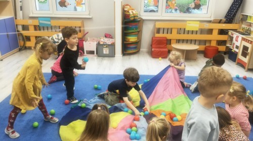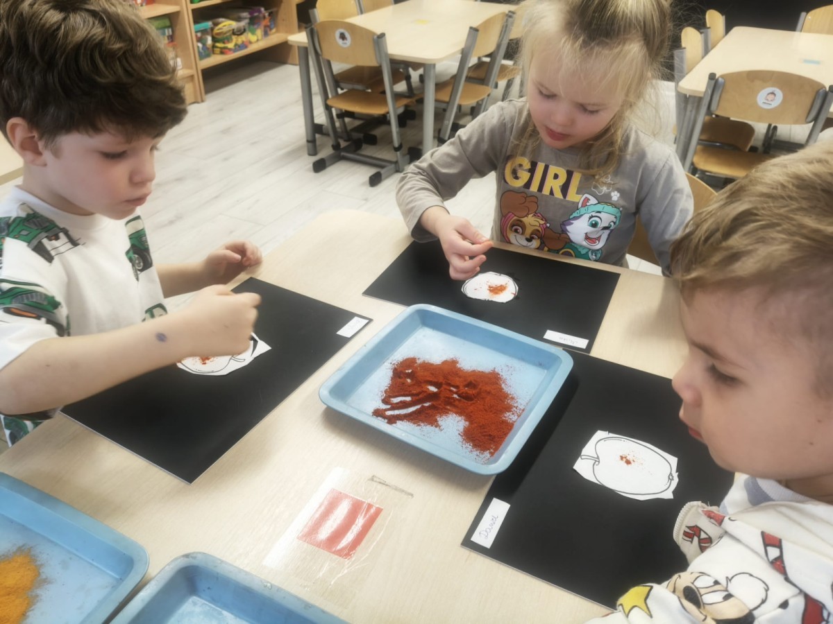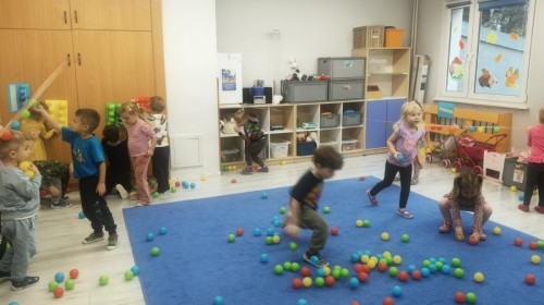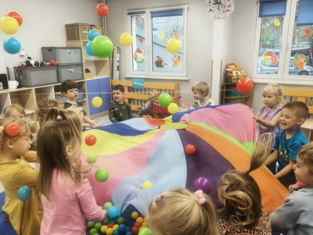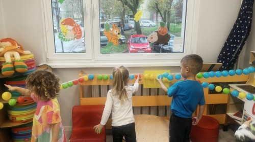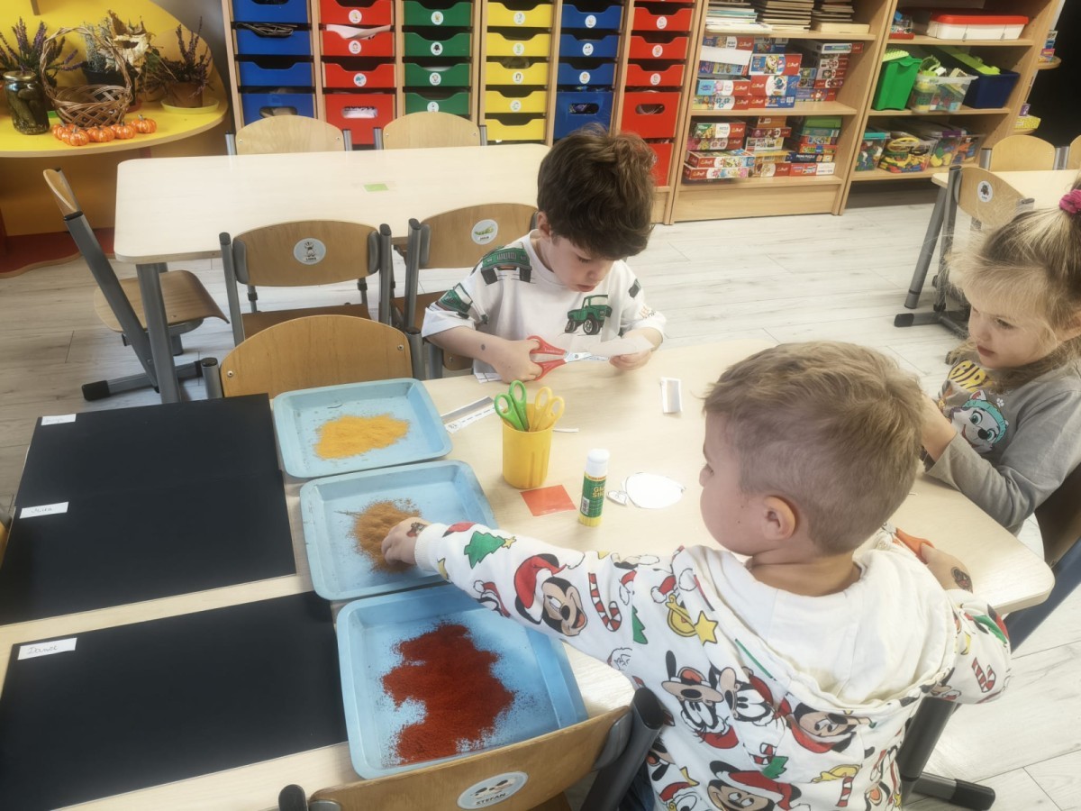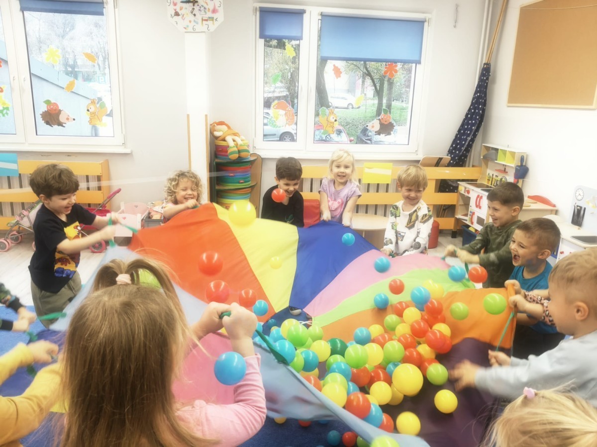 W dwóch ostatnich tygodniach w przedszkolu w grupie "Wiewiórek" dzieci bardzo dużo poznawały lub bawiły się poprzez różne zmysły i ruch. Do zajęć wykorzystywaliśmy chustę animacyjną, mnóstwo kolorowych piłek oraz nowy tor przeszkód. Te zabawy były świetnym sposobem na wsparcie i rozwijanie motoryki dużej i małej, koordynacji oraz integracji sensorycznej. Przy okazji dzieci utrwalały sobie nazwy kolorów, doskonaliły segregację i równowagę. "Wiewiórki" bawiły się też kolorem podczas zabaw z kasztanami, którymi malowały kartki - przy świetnej zabawie darami natury powstały, tak jakby przy okazji, wspaniałe prace plastyczne. Dzieci miały też okazję zrobić samodzielnie ogórki korniszone - dzięki temu poznały jeden ze sposobów robienia przetworów na zimę, a że takie ogórki szybko się robią, to dzieci miały już możliwość degustacji. Rozmawialiśmy tez o walorach zdrowotnych jedzenia kiszonych rzeczy. Nie zabrakło również próbowania innych warzyw. A na koniec tego tygodnia dzieci uczyły się posługiwać nożyczkami, by później przez zabawę różnymi kolorami przypraw ozdabiać sylwety jabłuszek. Do gotowego obrazka wykonanego w ten sposób doklejały kolorowe liście.