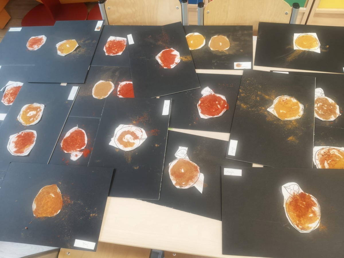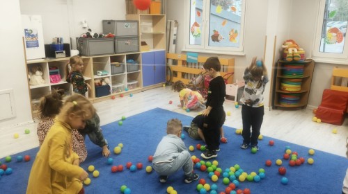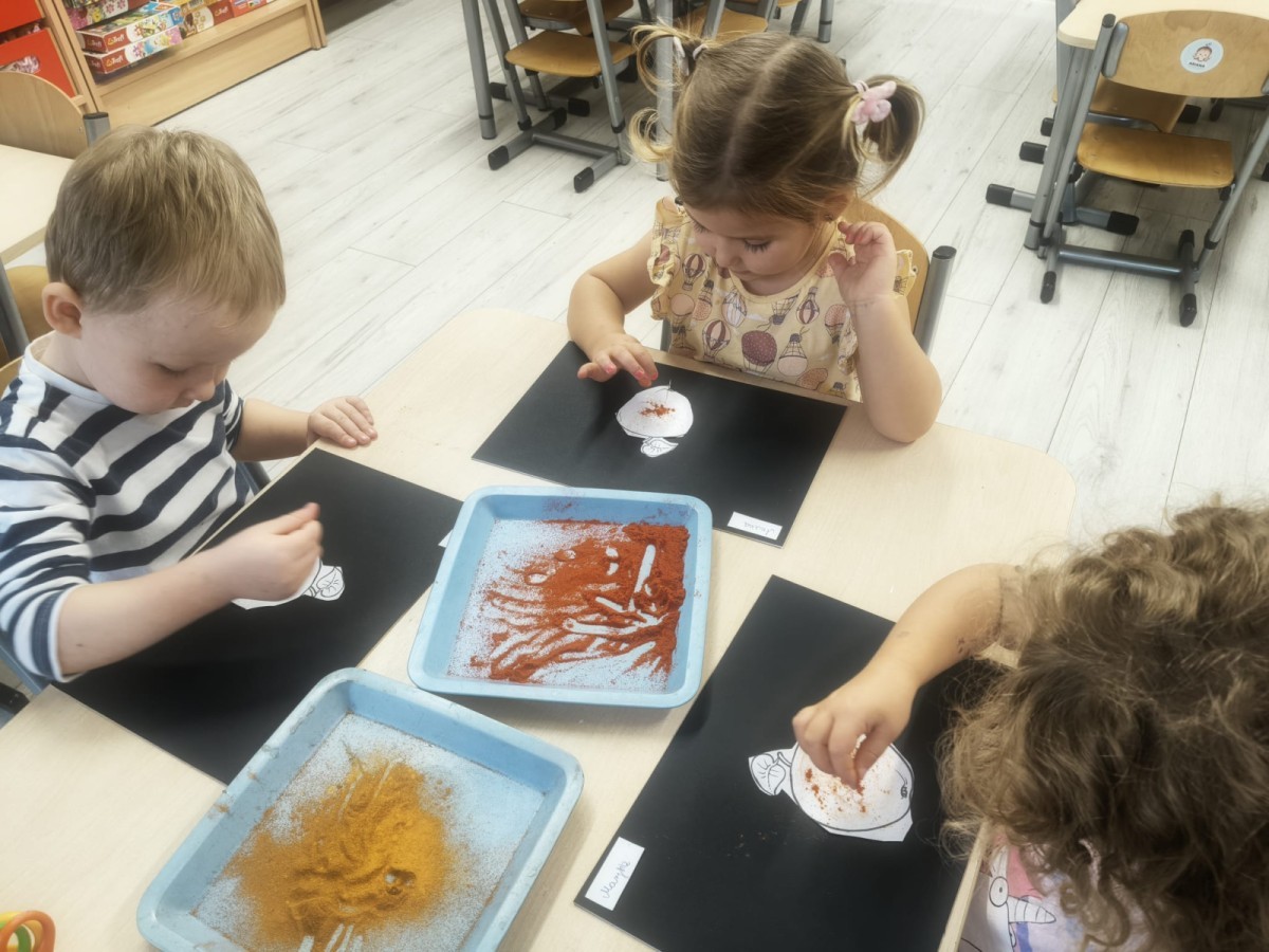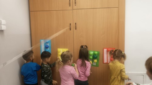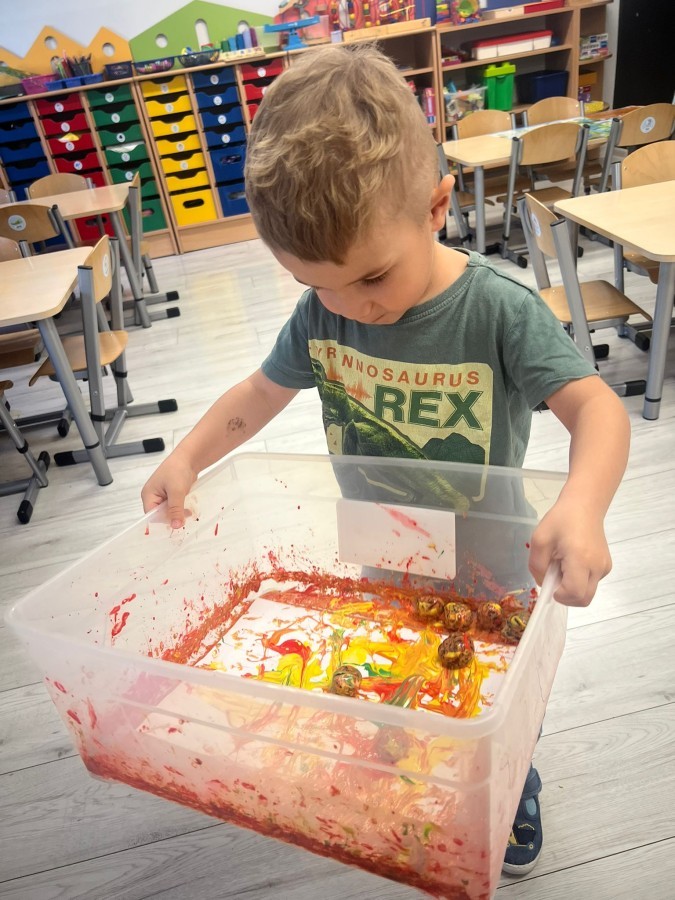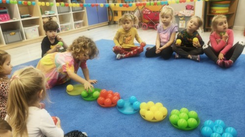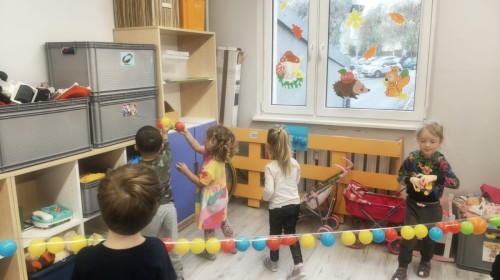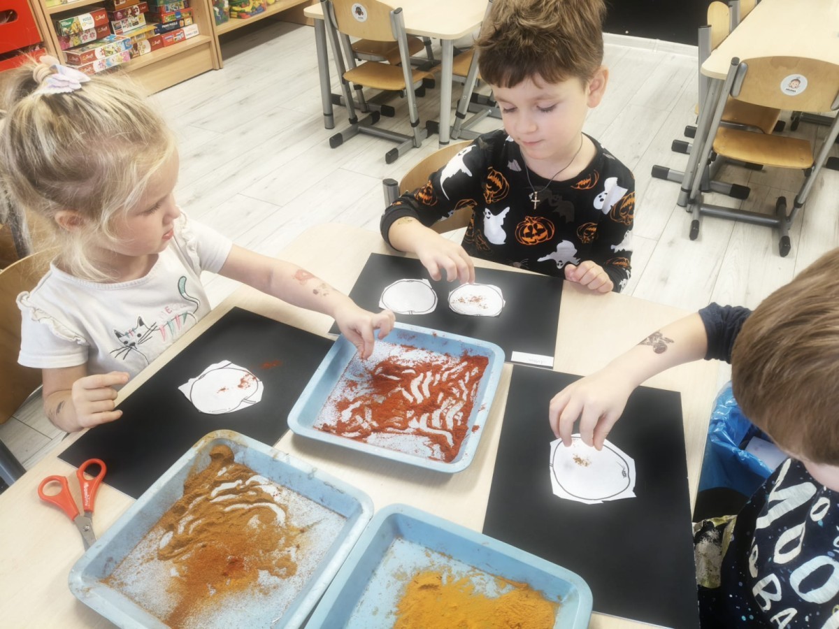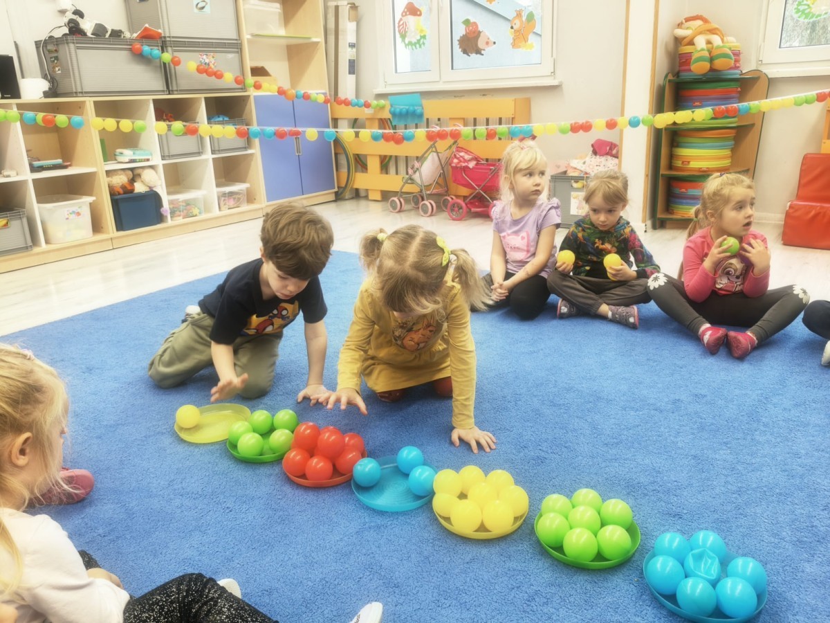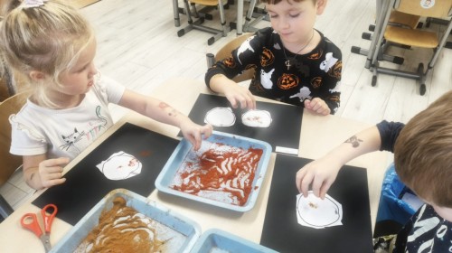 W dwóch ostatnich tygodniach w przedszkolu w grupie "Wiewiórek" dzieci bardzo dużo poznawały lub bawiły się poprzez różne zmysły i ruch. Do zajęć wykorzystywaliśmy chustę animacyjną, mnóstwo kolorowych piłek oraz nowy tor przeszkód. Te zabawy były świetnym sposobem na wsparcie i rozwijanie motoryki dużej i małej, koordynacji oraz integracji sensorycznej. Przy okazji dzieci utrwalały sobie nazwy kolorów, doskonaliły segregację i równowagę. "Wiewiórki" bawiły się też kolorem podczas zabaw z kasztanami, którymi malowały kartki - przy świetnej zabawie darami natury powstały, tak jakby przy okazji, wspaniałe prace plastyczne. Dzieci miały też okazję zrobić samodzielnie ogórki korniszone - dzięki temu poznały jeden ze sposobów robienia przetworów na zimę, a że takie ogórki szybko się robią, to dzieci miały już możliwość degustacji. Rozmawialiśmy tez o walorach zdrowotnych jedzenia kiszonych rzeczy. Nie zabrakło również próbowania innych warzyw. A na koniec tego tygodnia dzieci uczyły się posługiwać nożyczkami, by później przez zabawę różnymi kolorami przypraw ozdabiać sylwety jabłuszek. Do gotowego obrazka wykonanego w ten sposób doklejały kolorowe liście.