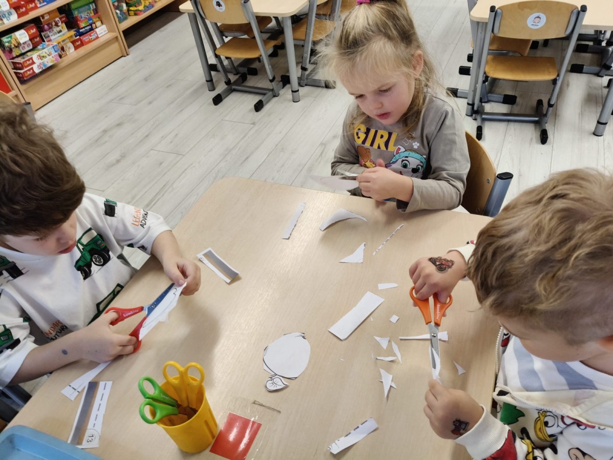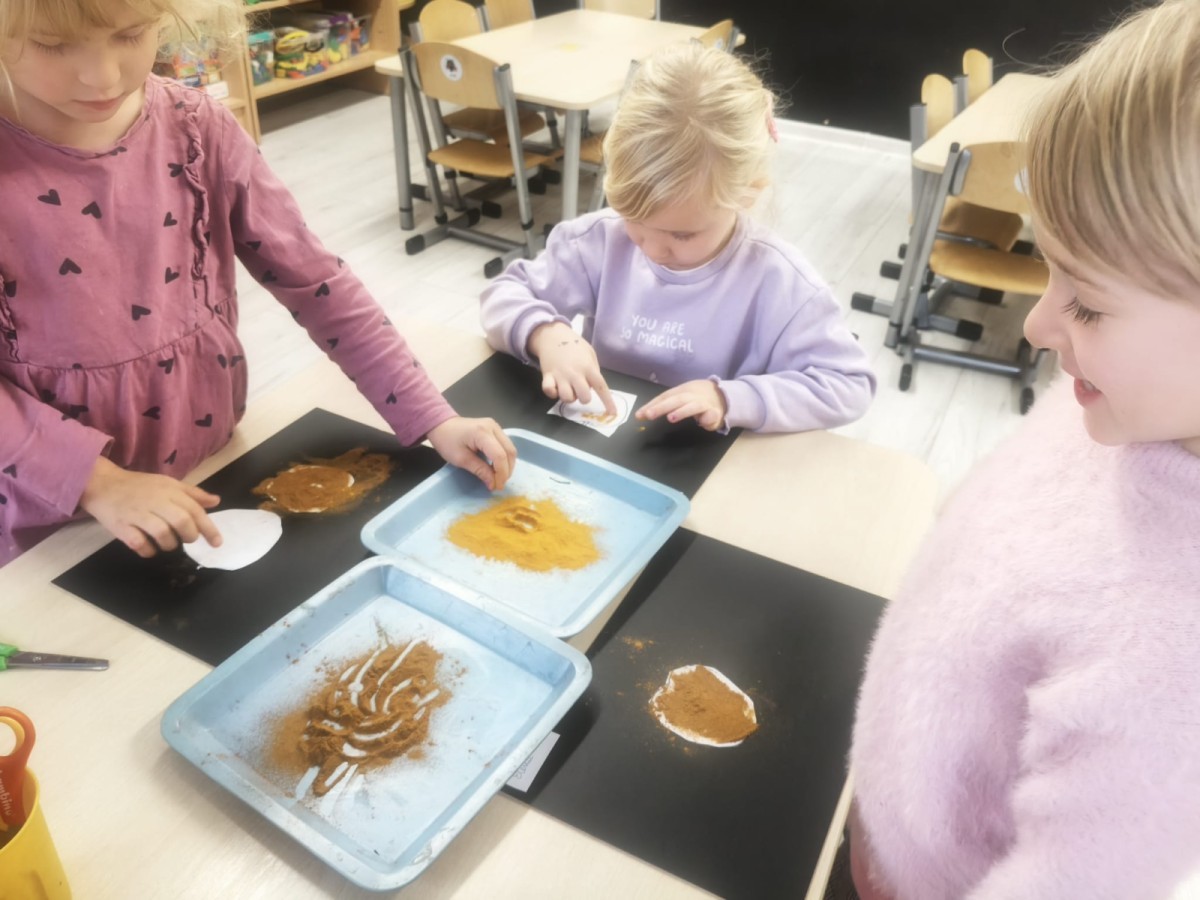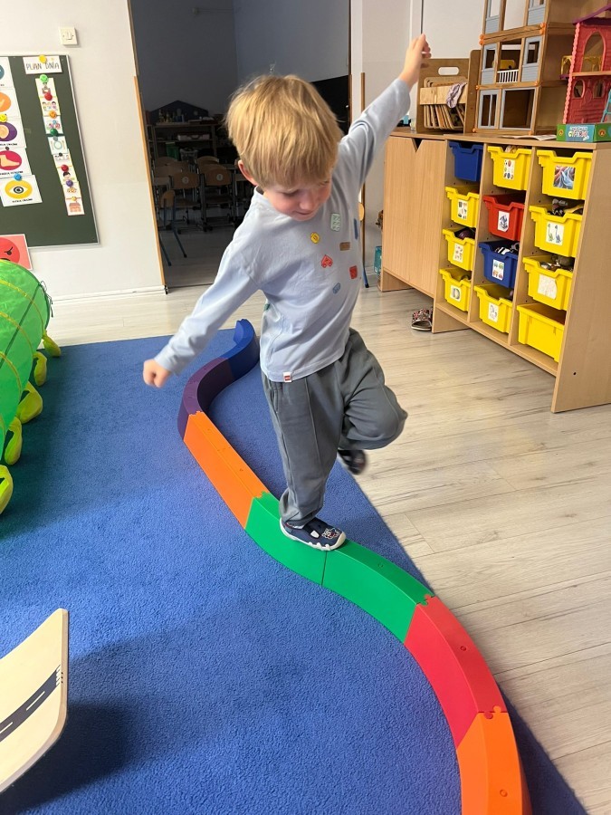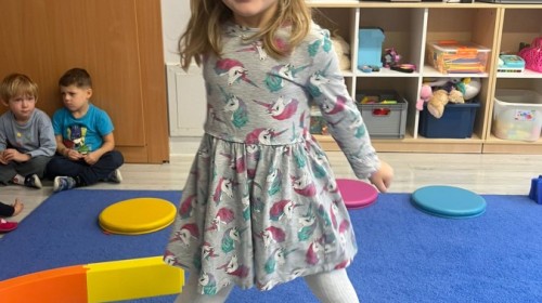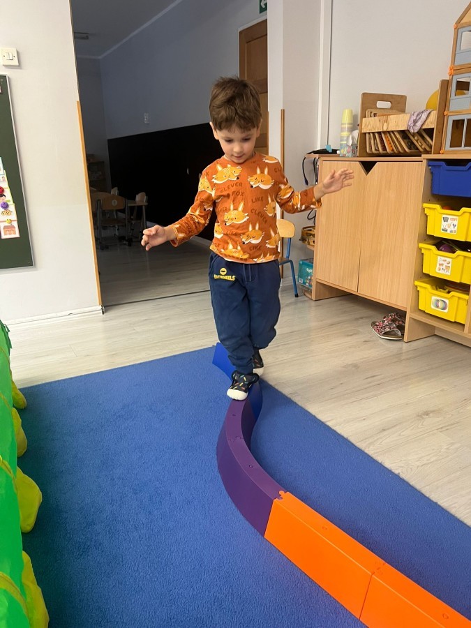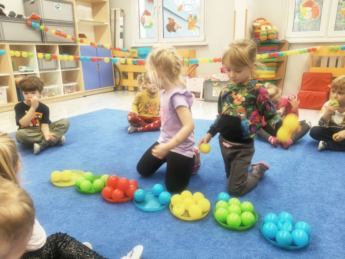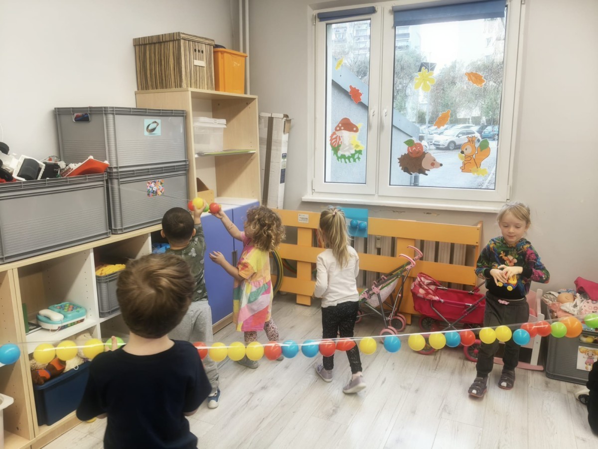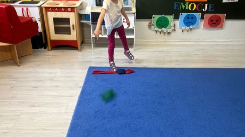 W dwóch ostatnich tygodniach w przedszkolu w grupie "Wiewiórek" dzieci bardzo dużo poznawały lub bawiły się poprzez różne zmysły i ruch. Do zajęć wykorzystywaliśmy chustę animacyjną, mnóstwo kolorowych piłek oraz nowy tor przeszkód. Te zabawy były świetnym sposobem na wsparcie i rozwijanie motoryki dużej i małej, koordynacji oraz integracji sensorycznej. Przy okazji dzieci utrwalały sobie nazwy kolorów, doskonaliły segregację i równowagę. "Wiewiórki" bawiły się też kolorem podczas zabaw z kasztanami, którymi malowały kartki - przy świetnej zabawie darami natury powstały, tak jakby przy okazji, wspaniałe prace plastyczne. Dzieci miały też okazję zrobić samodzielnie ogórki korniszone - dzięki temu poznały jeden ze sposobów robienia przetworów na zimę, a że takie ogórki szybko się robią, to dzieci miały już możliwość degustacji. Rozmawialiśmy tez o walorach zdrowotnych jedzenia kiszonych rzeczy. Nie zabrakło również próbowania innych warzyw. A na koniec tego tygodnia dzieci uczyły się posługiwać nożyczkami, by później przez zabawę różnymi kolorami przypraw ozdabiać sylwety jabłuszek. Do gotowego obrazka wykonanego w ten sposób doklejały kolorowe liście.