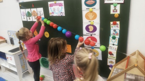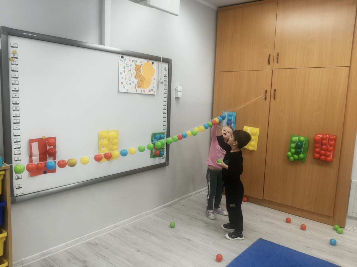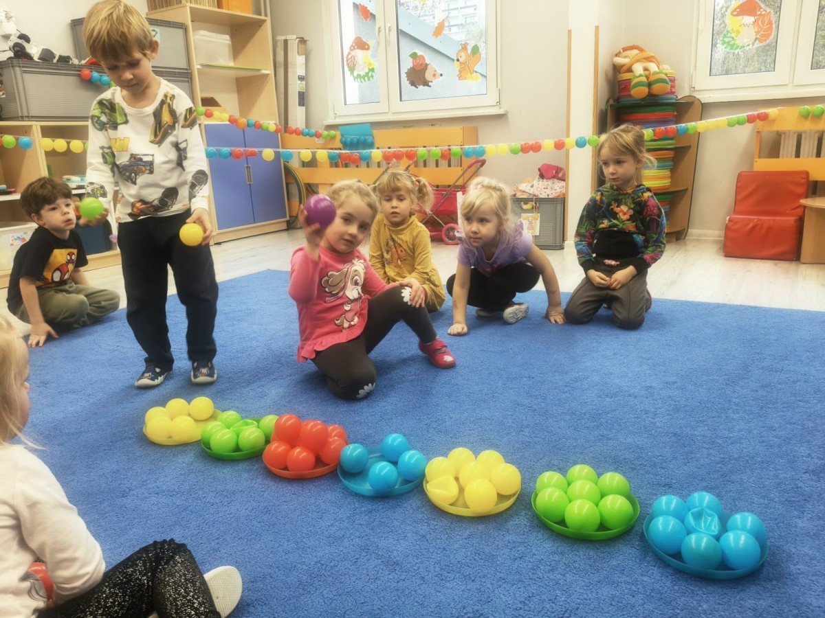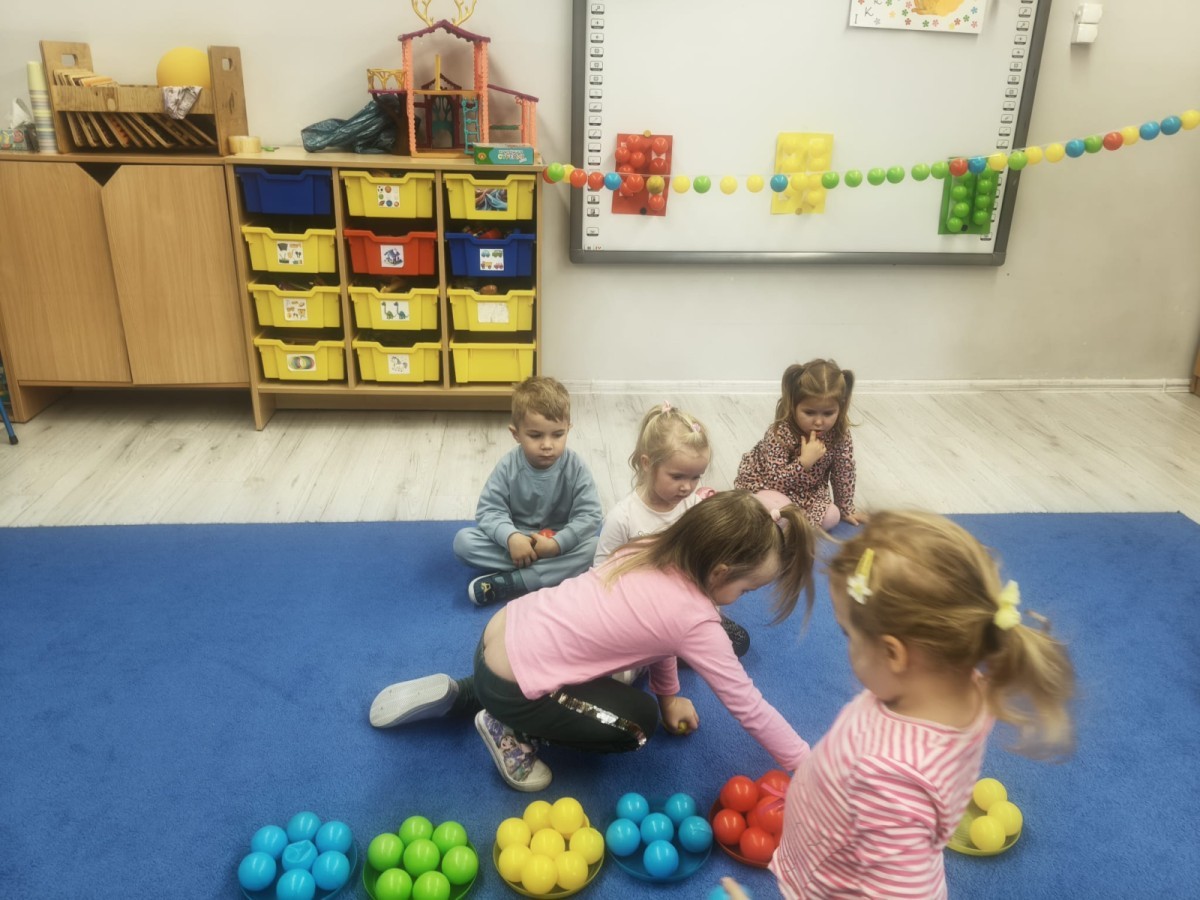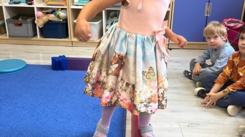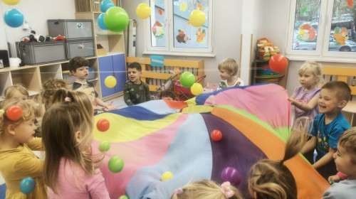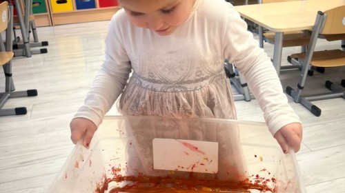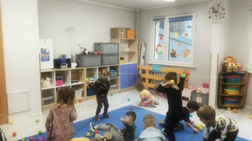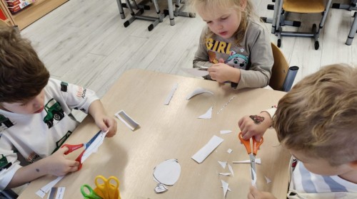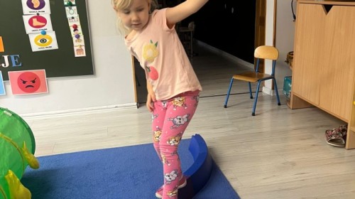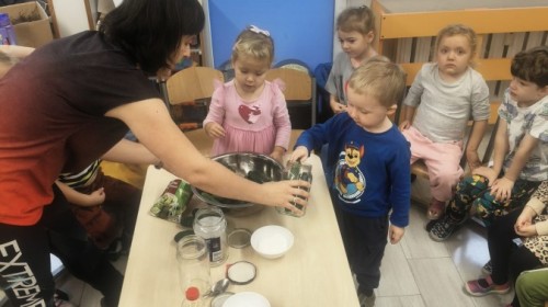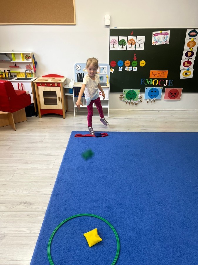 W dwóch ostatnich tygodniach w przedszkolu w grupie "Wiewiórek" dzieci bardzo dużo poznawały lub bawiły się poprzez różne zmysły i ruch. Do zajęć wykorzystywaliśmy chustę animacyjną, mnóstwo kolorowych piłek oraz nowy tor przeszkód. Te zabawy były świetnym sposobem na wsparcie i rozwijanie motoryki dużej i małej, koordynacji oraz integracji sensorycznej. Przy okazji dzieci utrwalały sobie nazwy kolorów, doskonaliły segregację i równowagę. "Wiewiórki" bawiły się też kolorem podczas zabaw z kasztanami, którymi malowały kartki - przy świetnej zabawie darami natury powstały, tak jakby przy okazji, wspaniałe prace plastyczne. Dzieci miały też okazję zrobić samodzielnie ogórki korniszone - dzięki temu poznały jeden ze sposobów robienia przetworów na zimę, a że takie ogórki szybko się robią, to dzieci miały już możliwość degustacji. Rozmawialiśmy tez o walorach zdrowotnych jedzenia kiszonych rzeczy. Nie zabrakło również próbowania innych warzyw. A na koniec tego tygodnia dzieci uczyły się posługiwać nożyczkami, by później przez zabawę różnymi kolorami przypraw ozdabiać sylwety jabłuszek. Do gotowego obrazka wykonanego w ten sposób doklejały kolorowe liście.