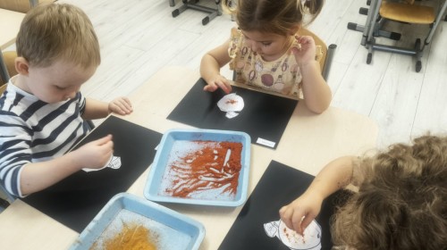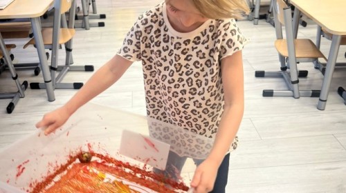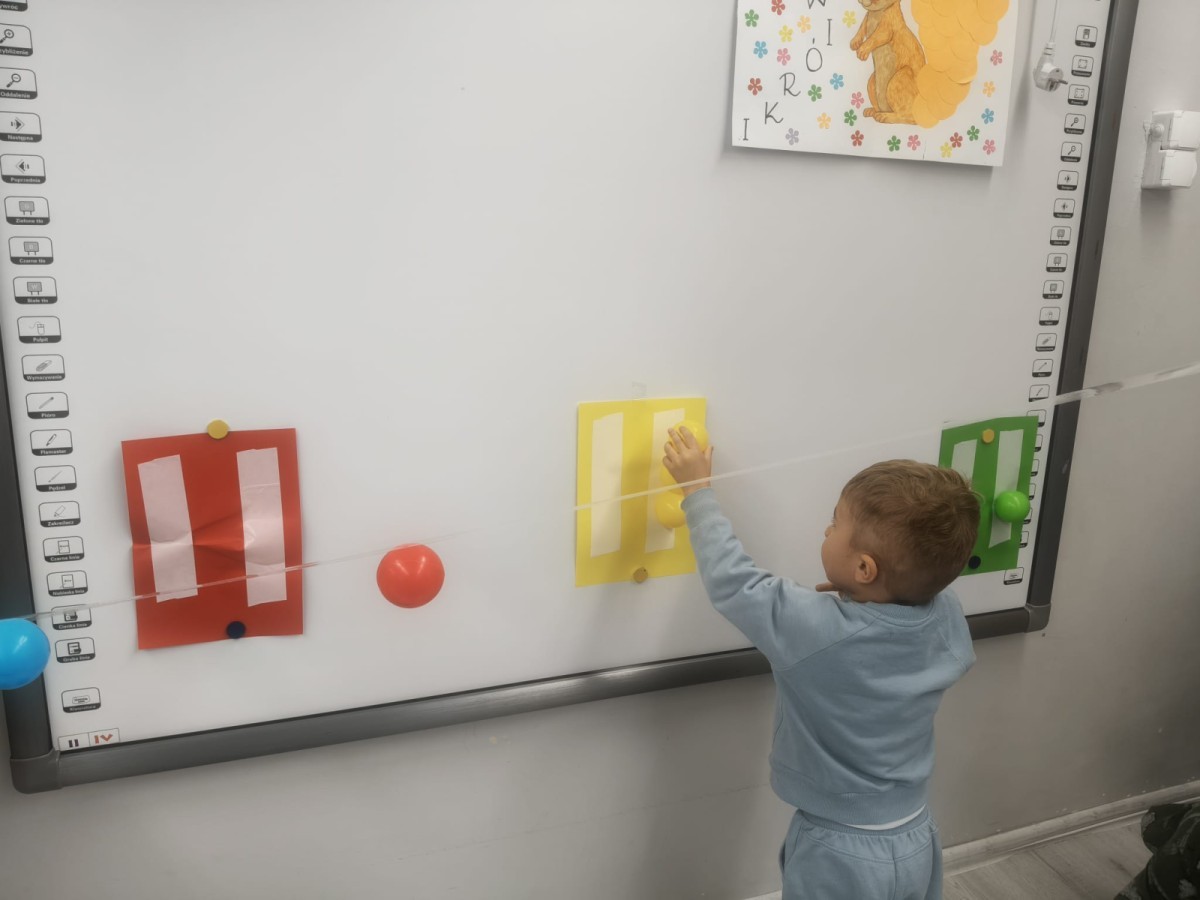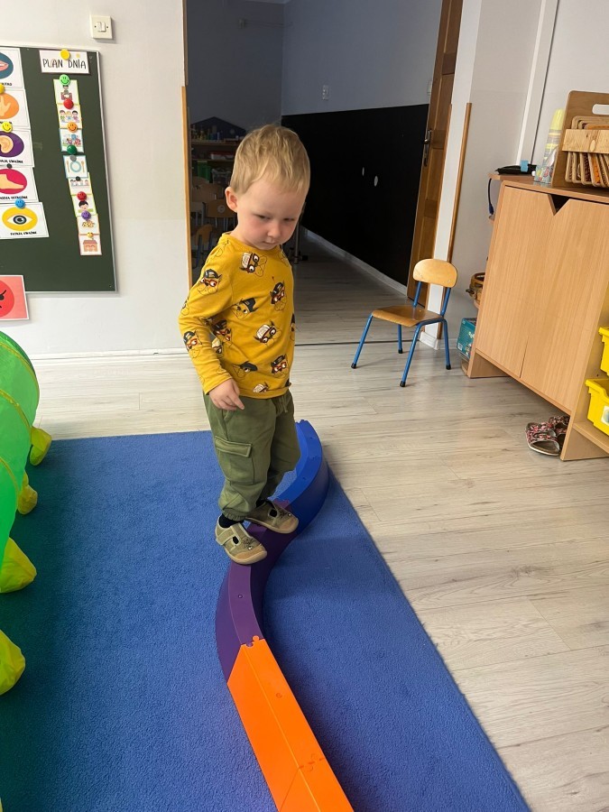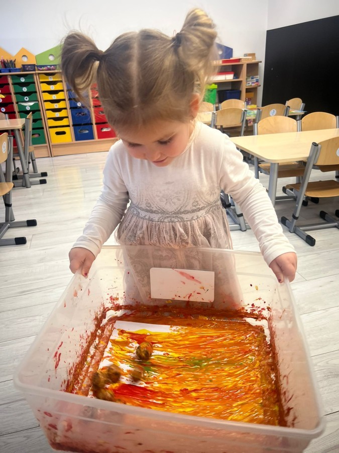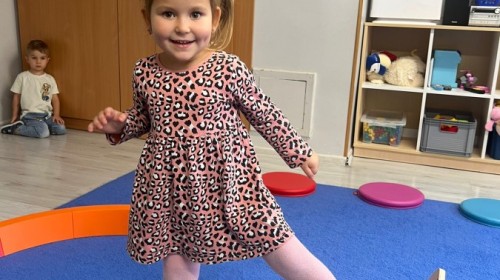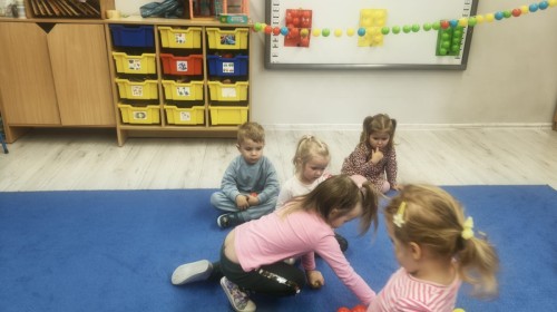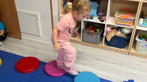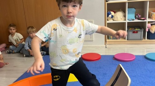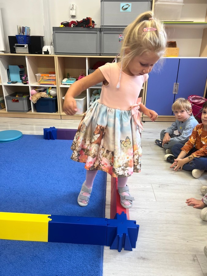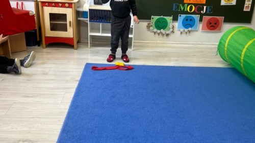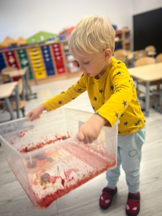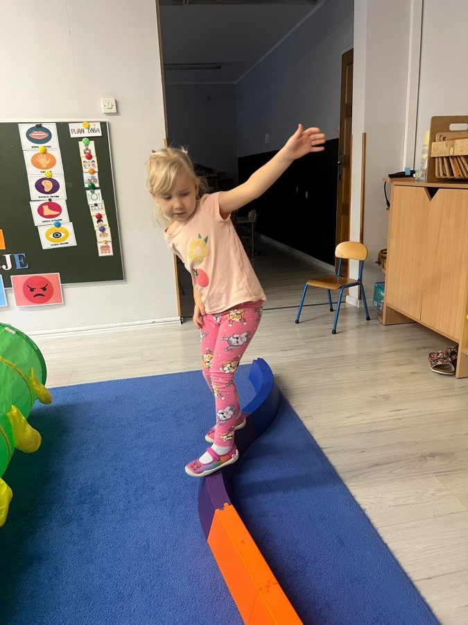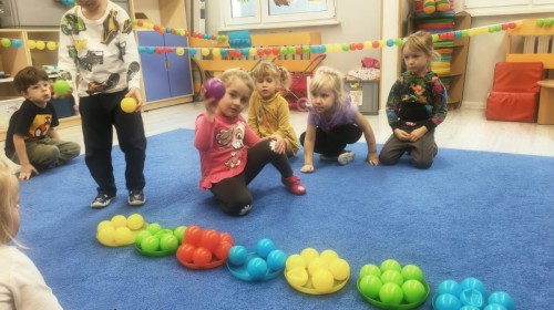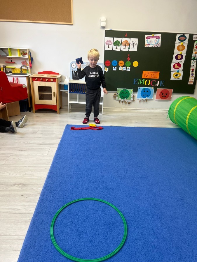 W dwóch ostatnich tygodniach w przedszkolu w grupie "Wiewiórek" dzieci bardzo dużo poznawały lub bawiły się poprzez różne zmysły i ruch. Do zajęć wykorzystywaliśmy chustę animacyjną, mnóstwo kolorowych piłek oraz nowy tor przeszkód. Te zabawy były świetnym sposobem na wsparcie i rozwijanie motoryki dużej i małej, koordynacji oraz integracji sensorycznej. Przy okazji dzieci utrwalały sobie nazwy kolorów, doskonaliły segregację i równowagę. "Wiewiórki" bawiły się też kolorem podczas zabaw z kasztanami, którymi malowały kartki - przy świetnej zabawie darami natury powstały, tak jakby przy okazji, wspaniałe prace plastyczne. Dzieci miały też okazję zrobić samodzielnie ogórki korniszone - dzięki temu poznały jeden ze sposobów robienia przetworów na zimę, a że takie ogórki szybko się robią, to dzieci miały już możliwość degustacji. Rozmawialiśmy tez o walorach zdrowotnych jedzenia kiszonych rzeczy. Nie zabrakło również próbowania innych warzyw. A na koniec tego tygodnia dzieci uczyły się posługiwać nożyczkami, by później przez zabawę różnymi kolorami przypraw ozdabiać sylwety jabłuszek. Do gotowego obrazka wykonanego w ten sposób doklejały kolorowe liście.