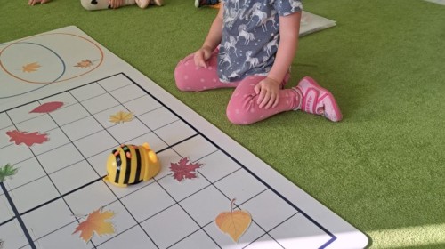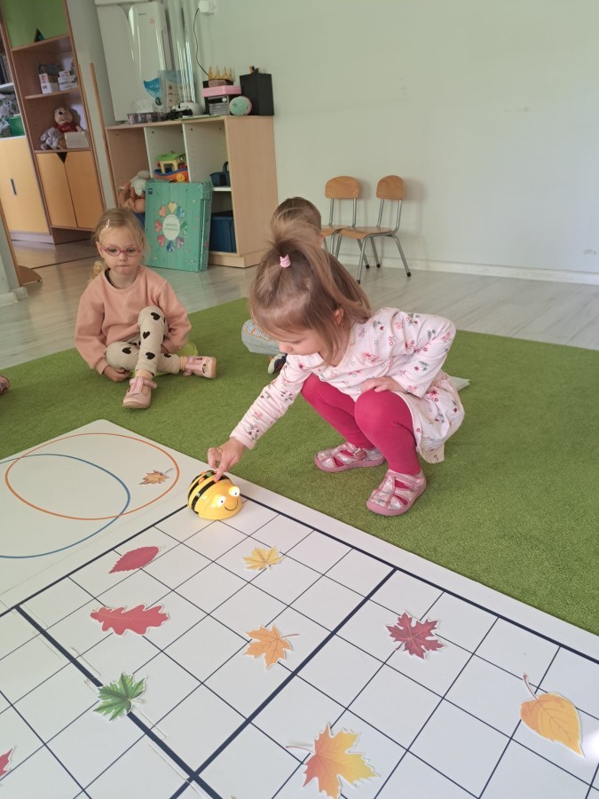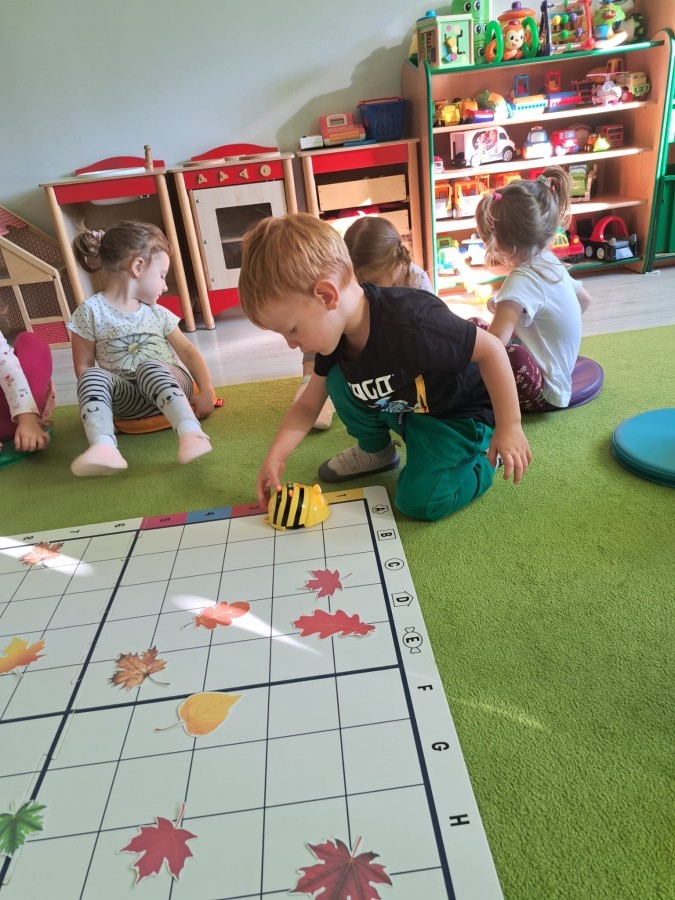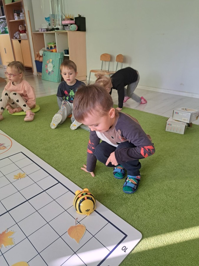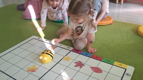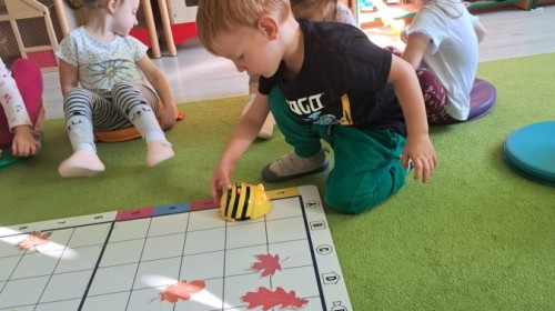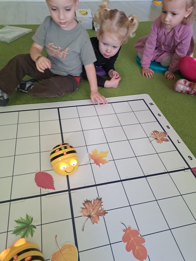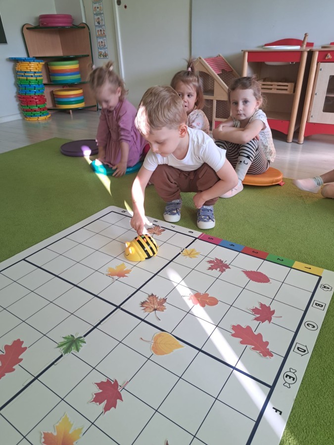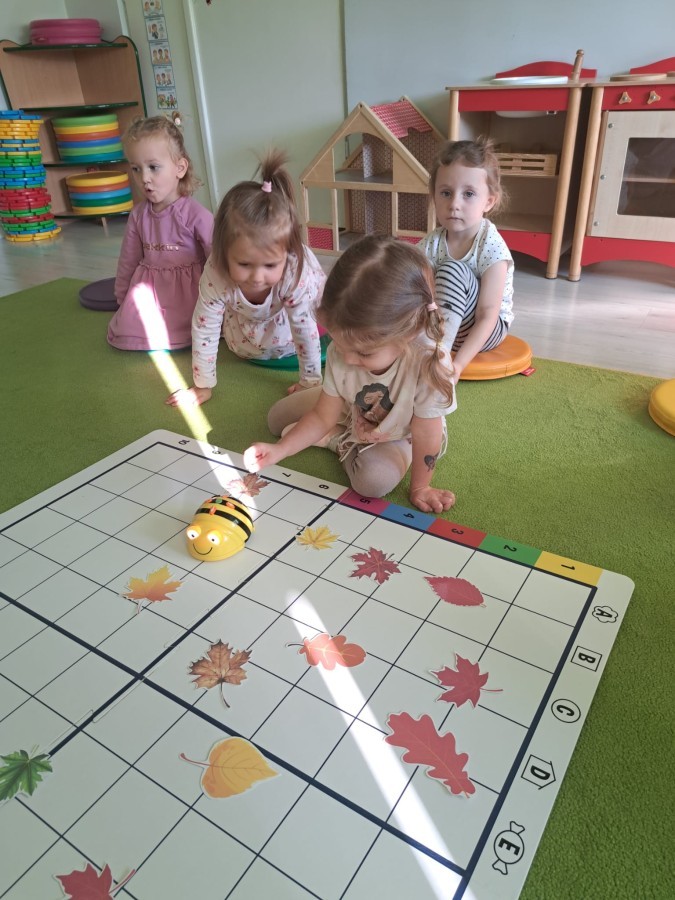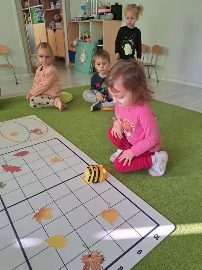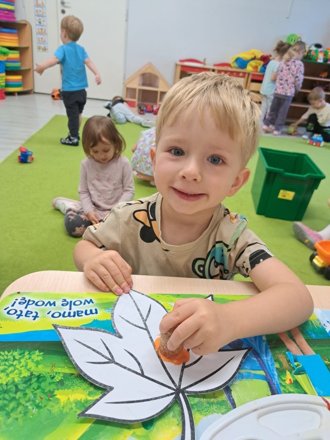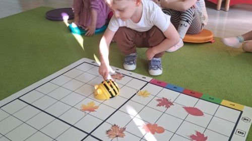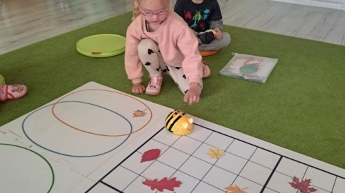 Grupa "Liski" rozpoczęła jesienne przygody od twórczej pracy plastycznej – pieczątkowania kolorowych liści. Dzieci z radością odkrywały barwy jesieni, a ich prace ozdobiły naszą galerię. Nie zabrakło też wspólnych zabaw z liśćmi i kasztanami, które dostarczyły wielu wrażeń sensorycznych i świetnej zabawy. Podczas zajęć edukacyjnych "Liski" rozwijały także swoje umiejętności logicznego myślenia, biorąc udział w kodowaniu z pomocą pszczółki Bee-Bot – ucząc się poprzez ruch, zabawę i współpracę.