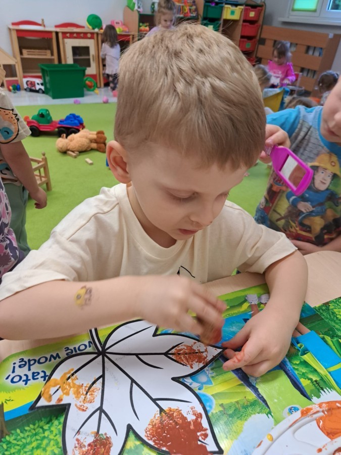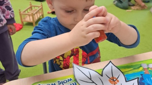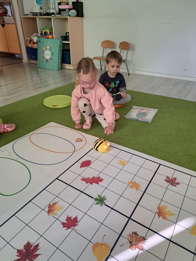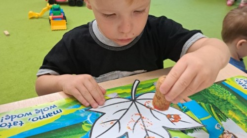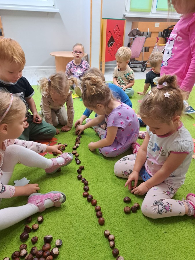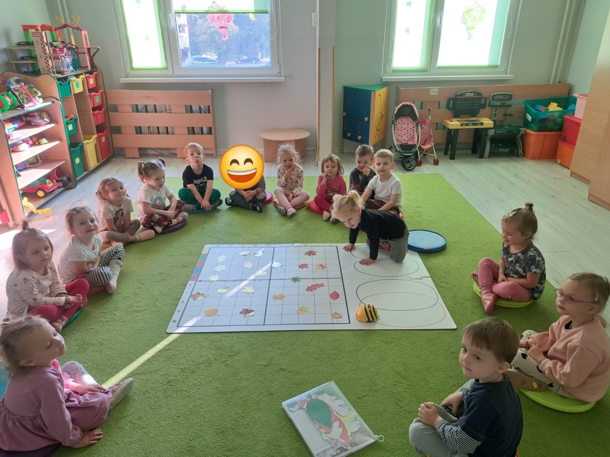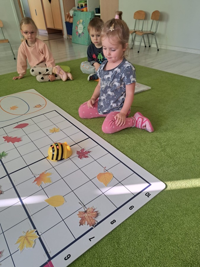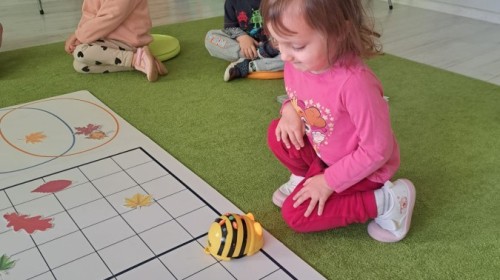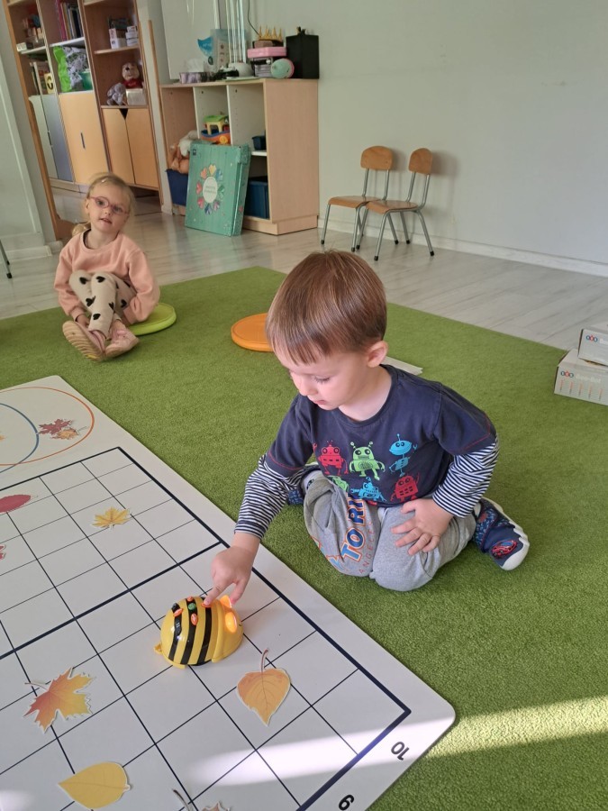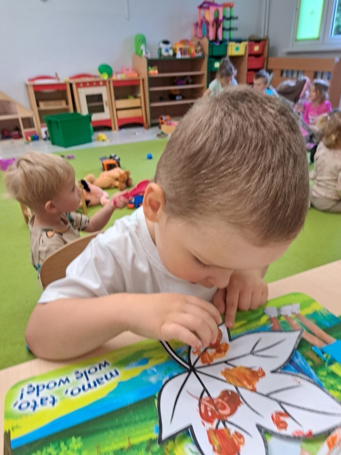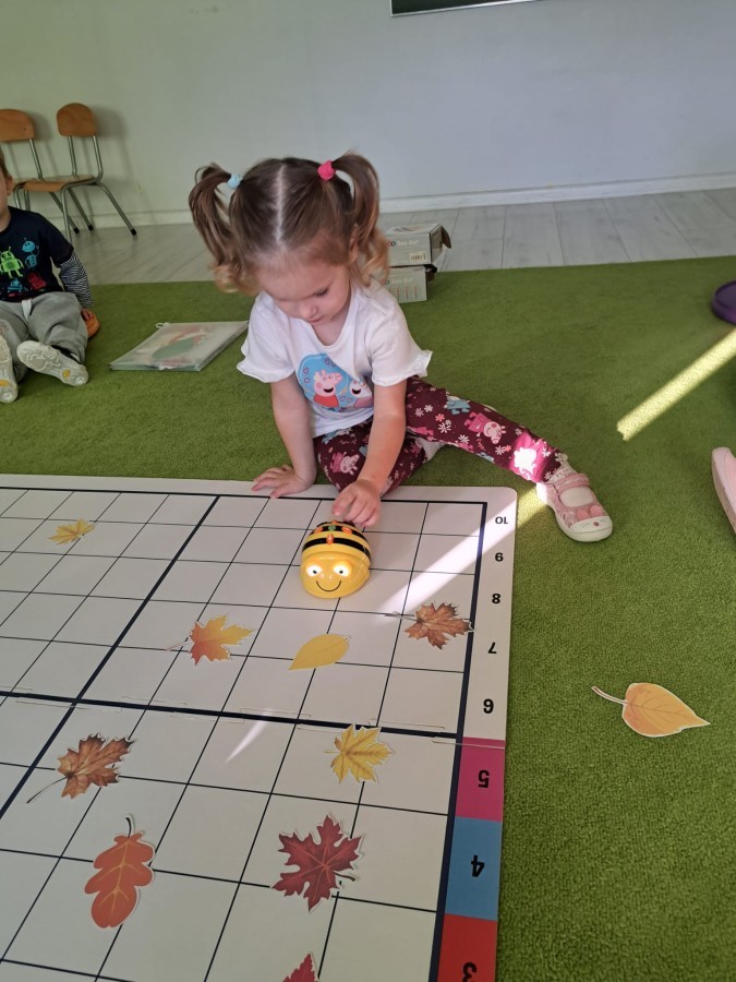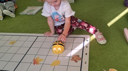 Grupa "Liski" rozpoczęła jesienne przygody od twórczej pracy plastycznej – pieczątkowania kolorowych liści. Dzieci z radością odkrywały barwy jesieni, a ich prace ozdobiły naszą galerię. Nie zabrakło też wspólnych zabaw z liśćmi i kasztanami, które dostarczyły wielu wrażeń sensorycznych i świetnej zabawy. Podczas zajęć edukacyjnych "Liski" rozwijały także swoje umiejętności logicznego myślenia, biorąc udział w kodowaniu z pomocą pszczółki Bee-Bot – ucząc się poprzez ruch, zabawę i współpracę.