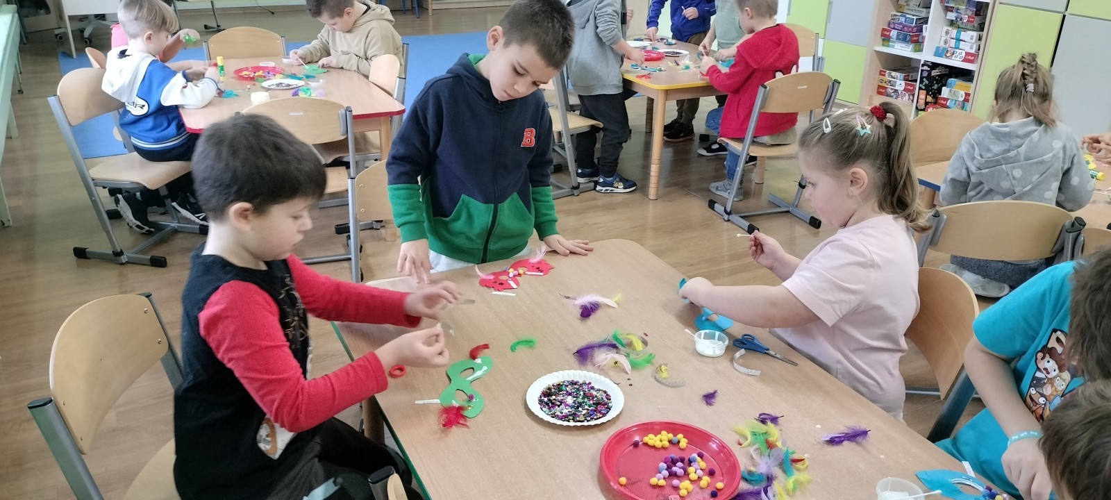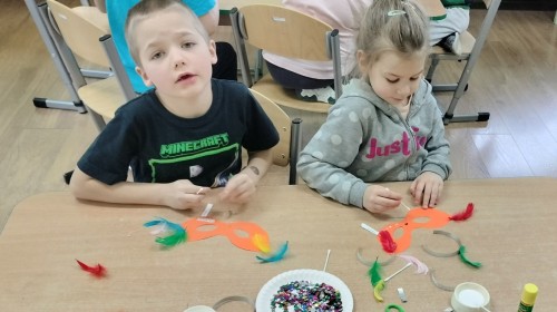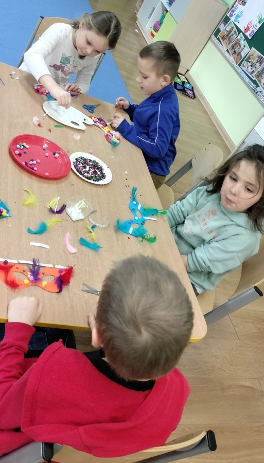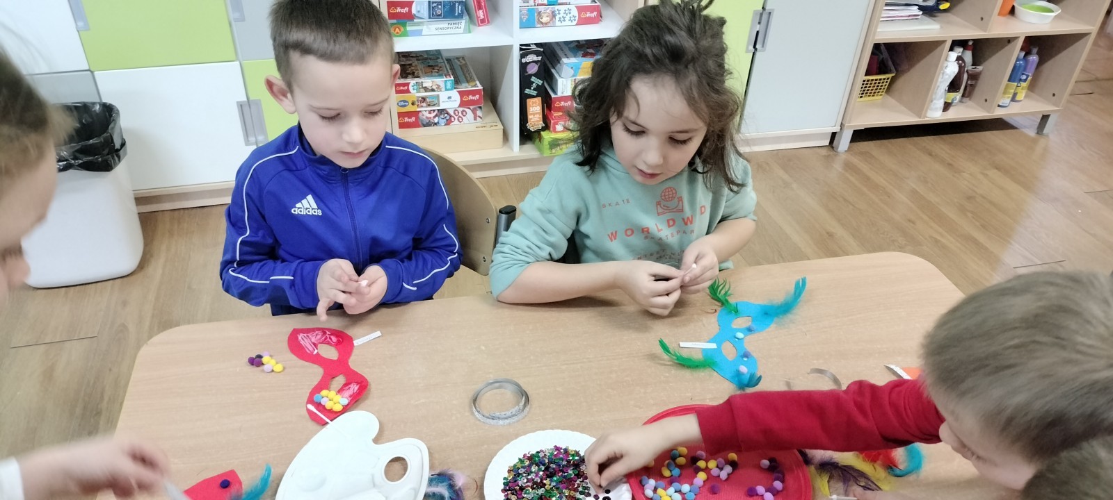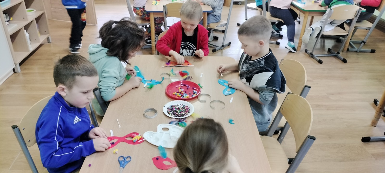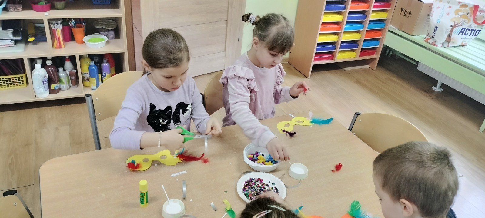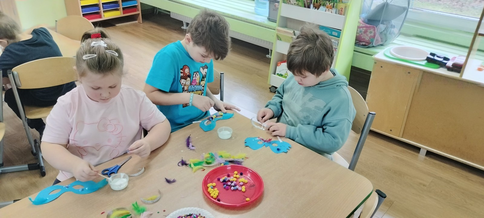 z tematyką balu, rozwijając spostrzegawczość i umiejętność czytania. Układały również historyjkę obrazkową o balu w szkole, ćwicząc logiczne myślenie oraz wypowiadanie się pełnymi zdaniami. Tydzień zakończył się pracą plastyczną – dzieci wykonały własne, pomysłowe maski karnawałowe, wykazując się kreatywnością i wyobraźnią.