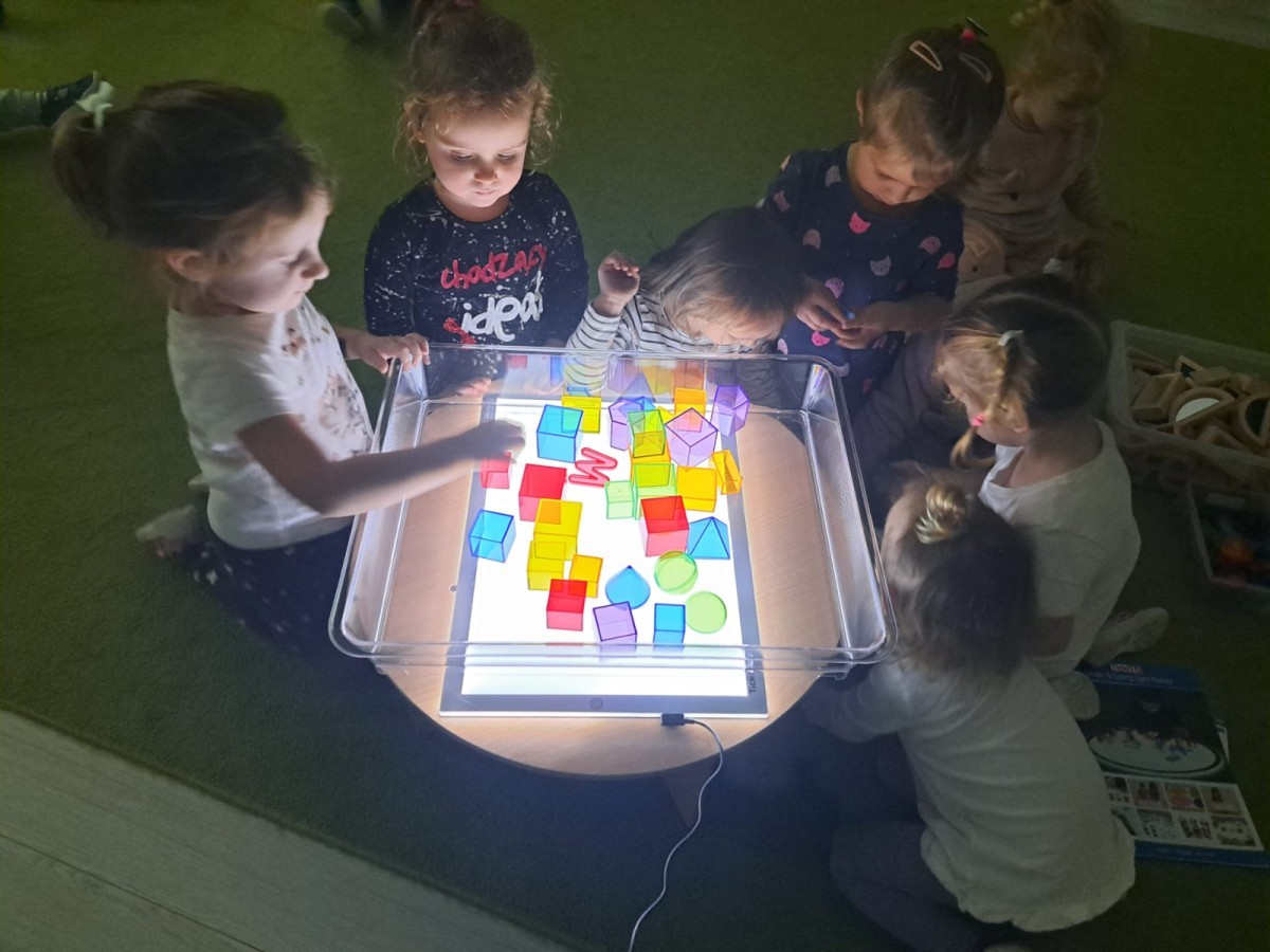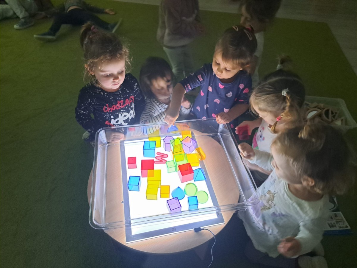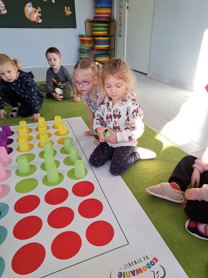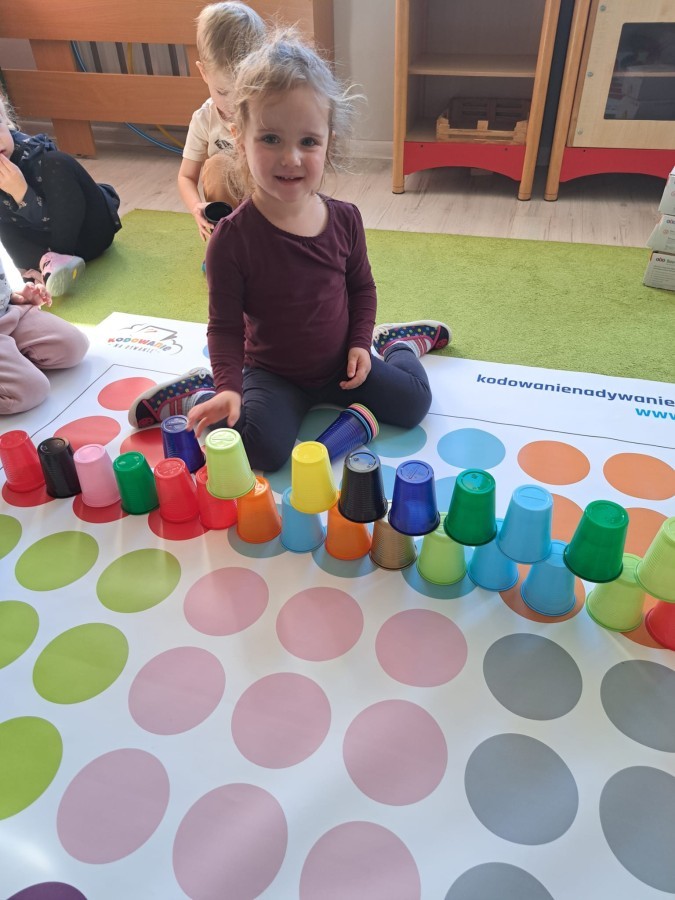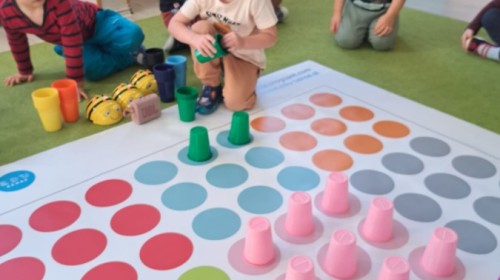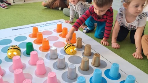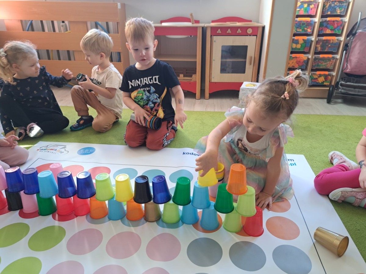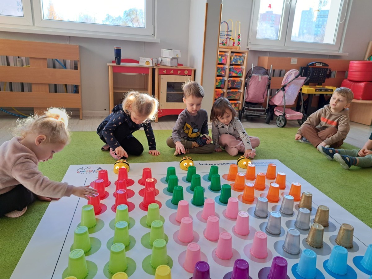 Grupa Lisków brała udział w zajęciach łączących kodowanie kubeczkami, programowanie robota Bee-Bot oraz zabawę na panelu podświetlanym. Dzieci układały proste sekwencje z kubeczków, programowały pszczółkę, aby dotarła do wyznaczonego celu, oraz eksperymentowały z kolorami i kształtami na podświetlanej powierzchni. Aktywności te wspierały ich logiczne myślenie, kreatywność i koncentrację.