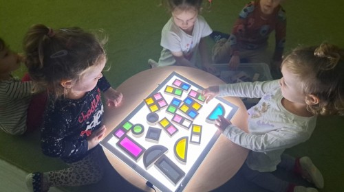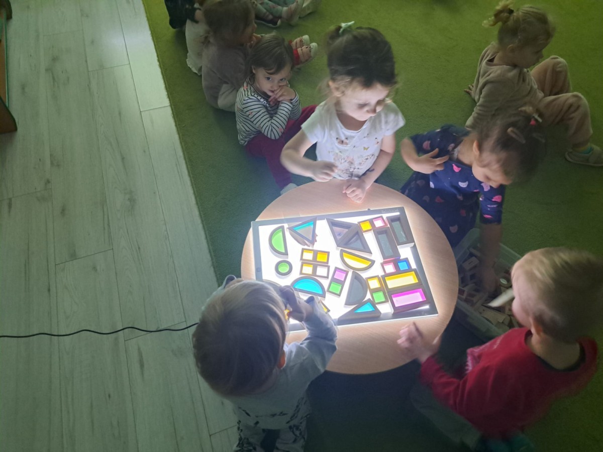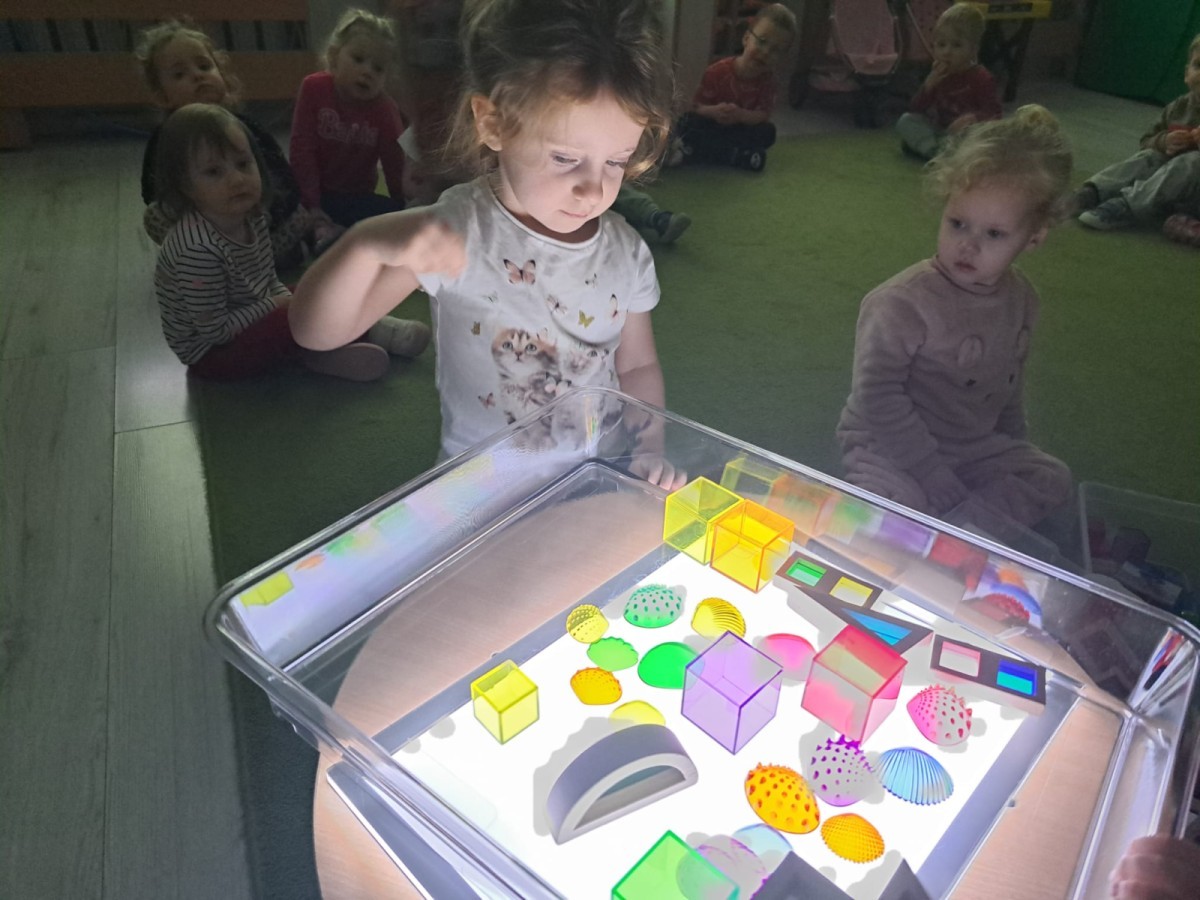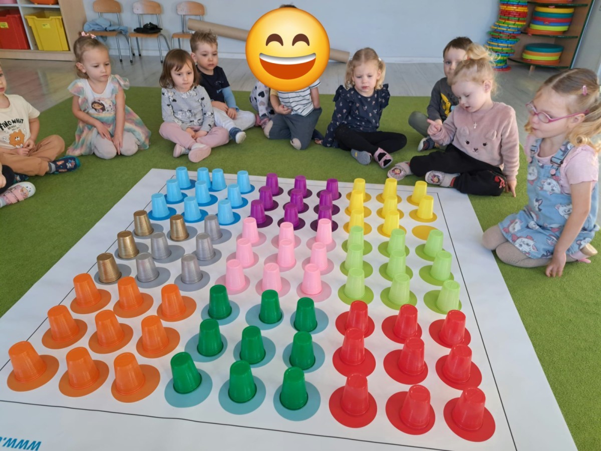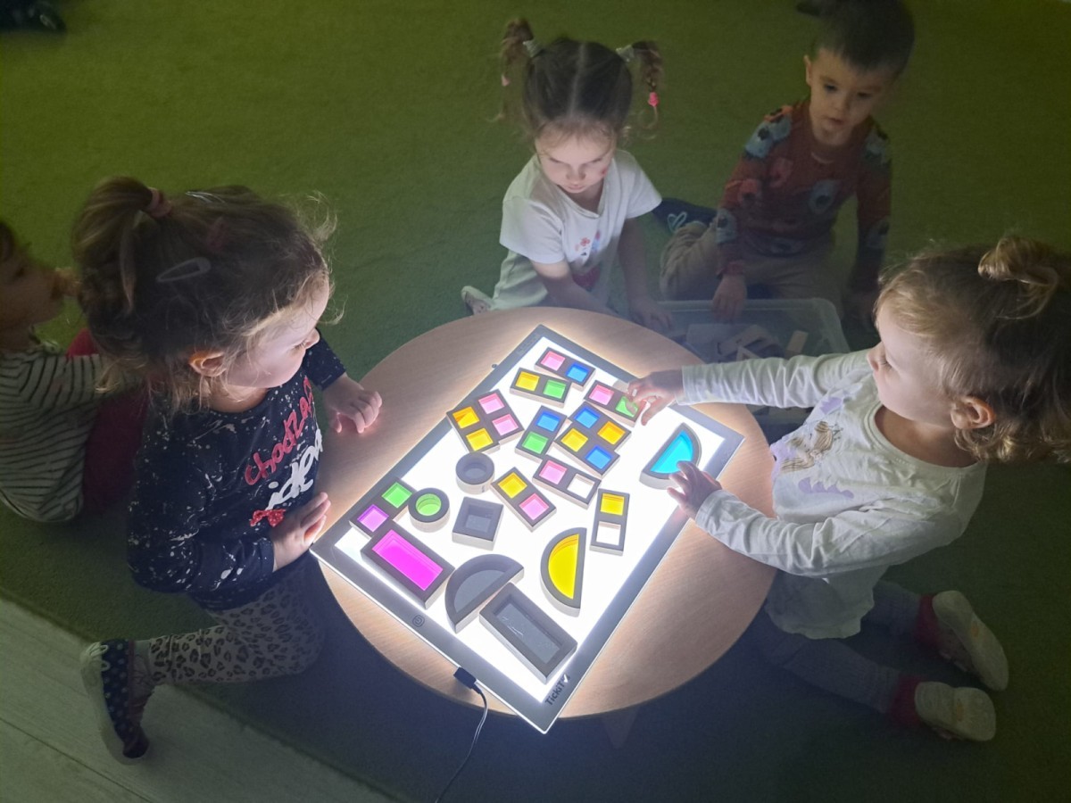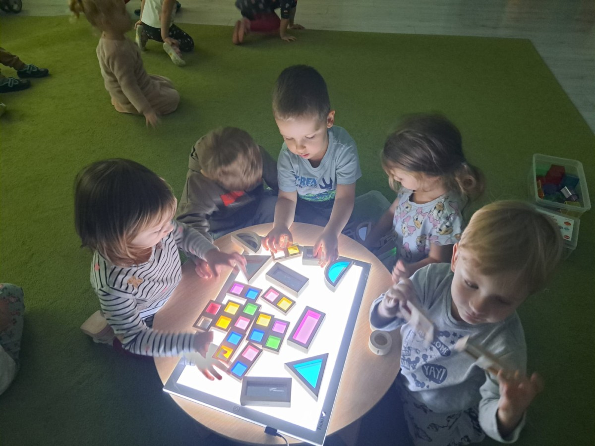 Grupa Lisków brała udział w zajęciach łączących kodowanie kubeczkami, programowanie robota Bee-Bot oraz zabawę na panelu podświetlanym. Dzieci układały proste sekwencje z kubeczków, programowały pszczółkę, aby dotarła do wyznaczonego celu, oraz eksperymentowały z kolorami i kształtami na podświetlanej powierzchni. Aktywności te wspierały ich logiczne myślenie, kreatywność i koncentrację.