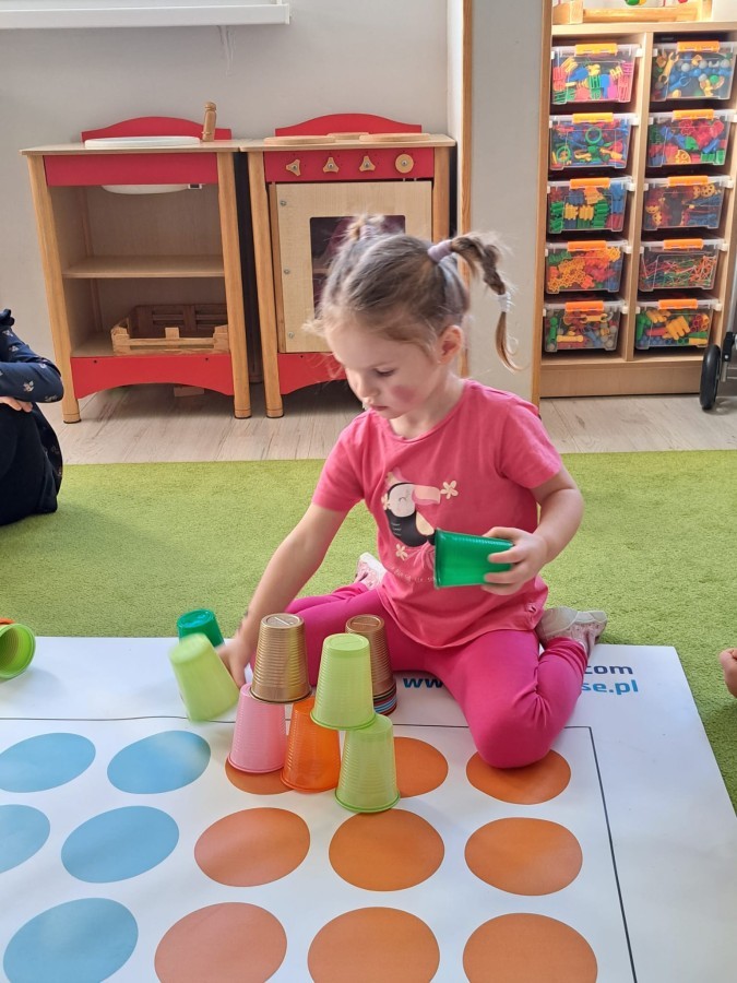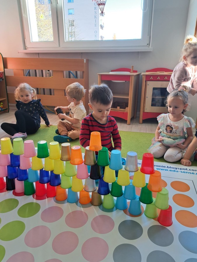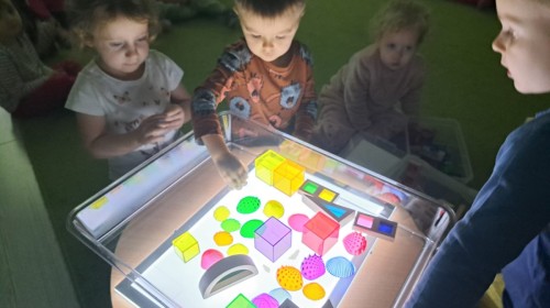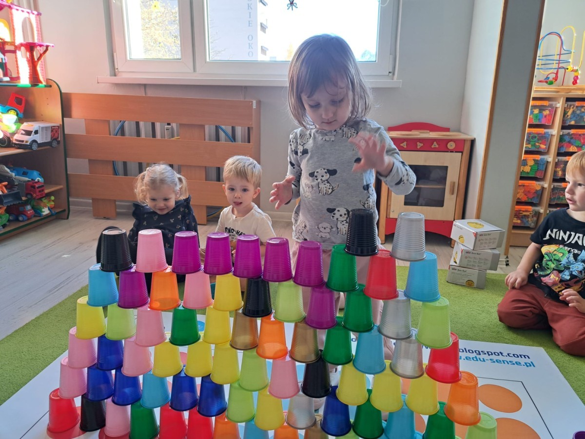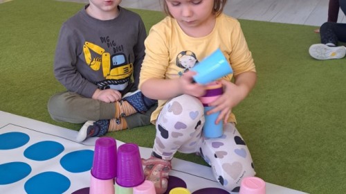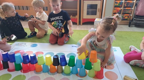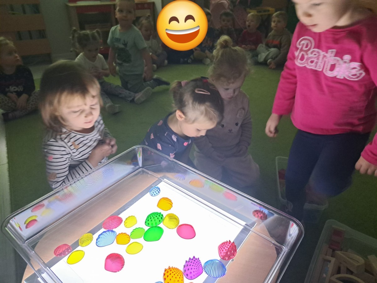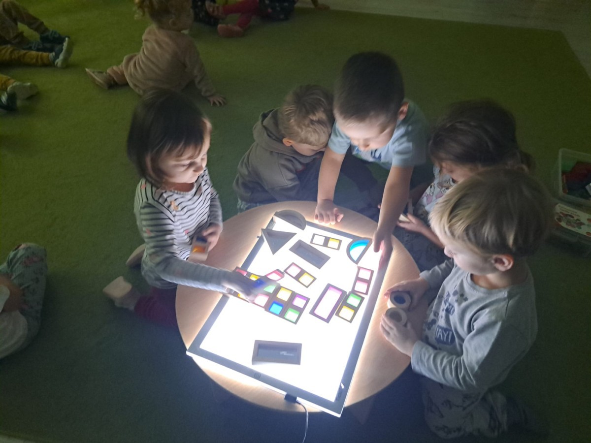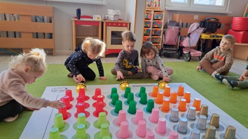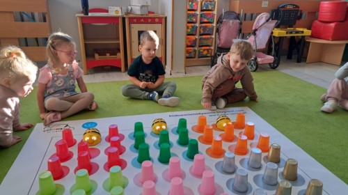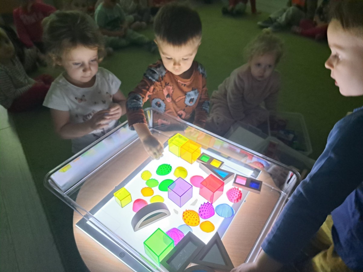 Grupa Lisków brała udział w zajęciach łączących kodowanie kubeczkami, programowanie robota Bee-Bot oraz zabawę na panelu podświetlanym. Dzieci układały proste sekwencje z kubeczków, programowały pszczółkę, aby dotarła do wyznaczonego celu, oraz eksperymentowały z kolorami i kształtami na podświetlanej powierzchni. Aktywności te wspierały ich logiczne myślenie, kreatywność i koncentrację.