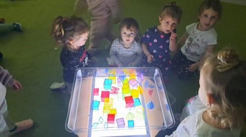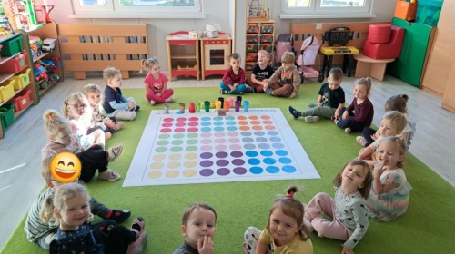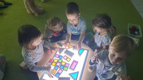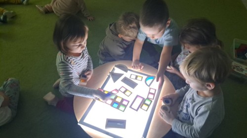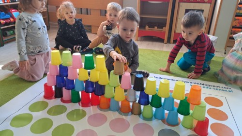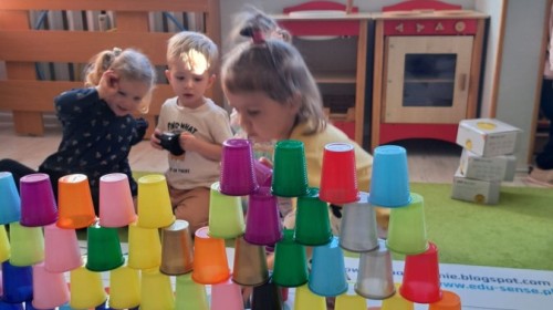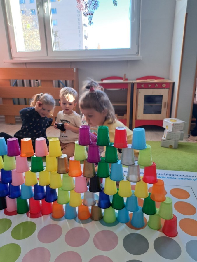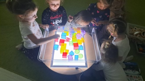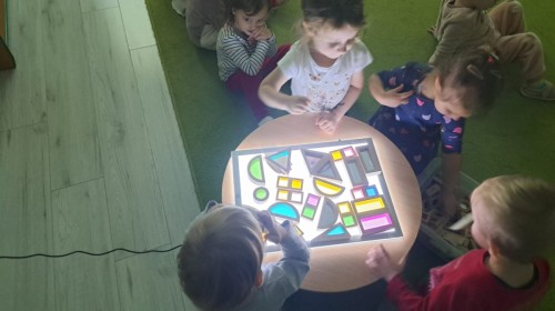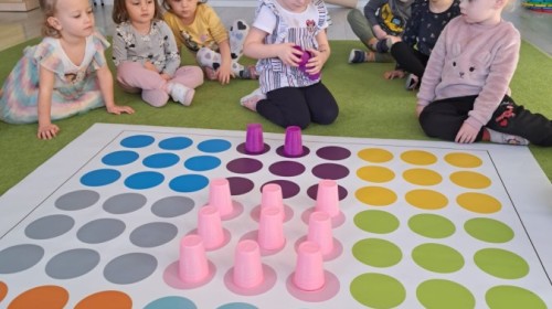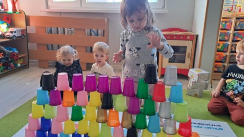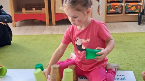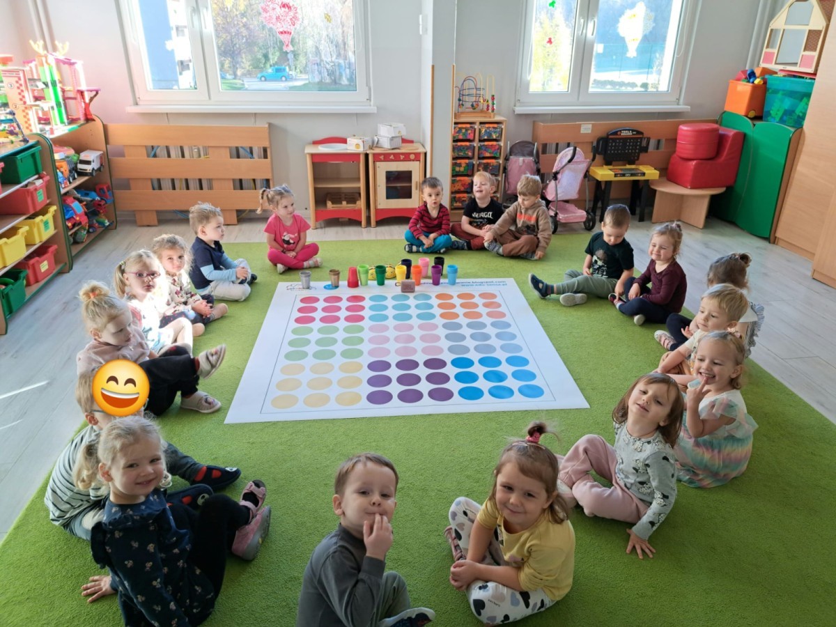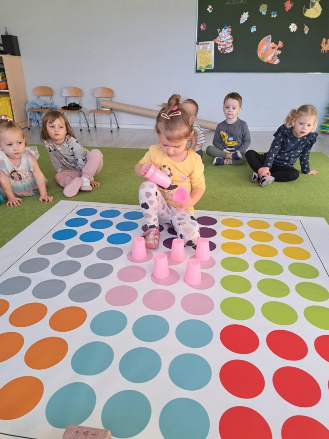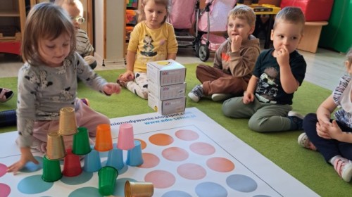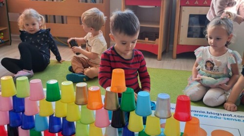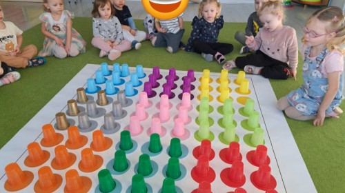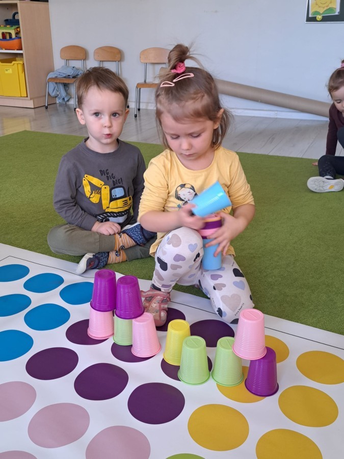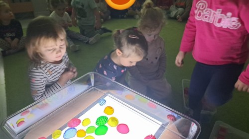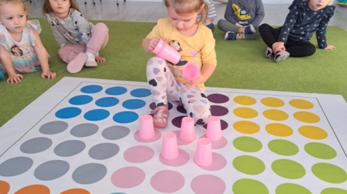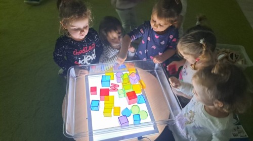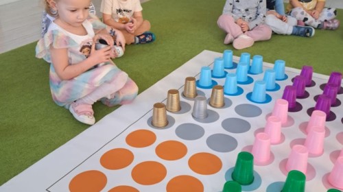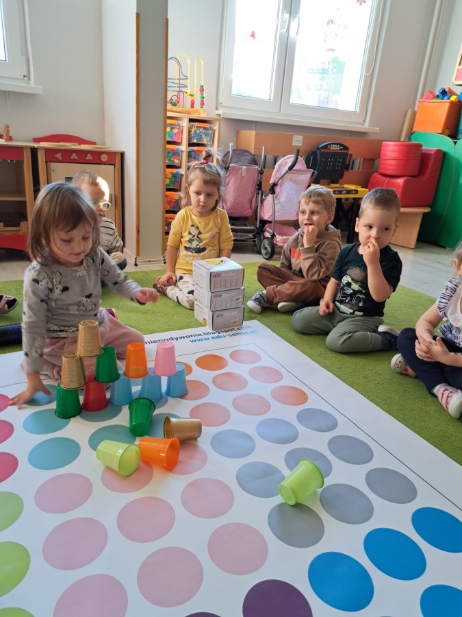 Grupa Lisków brała udział w zajęciach łączących kodowanie kubeczkami, programowanie robota Bee-Bot oraz zabawę na panelu podświetlanym. Dzieci układały proste sekwencje z kubeczków, programowały pszczółkę, aby dotarła do wyznaczonego celu, oraz eksperymentowały z kolorami i kształtami na podświetlanej powierzchni. Aktywności te wspierały ich logiczne myślenie, kreatywność i koncentrację.