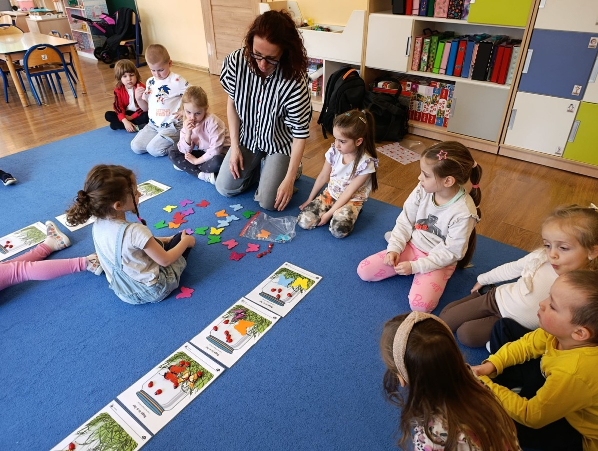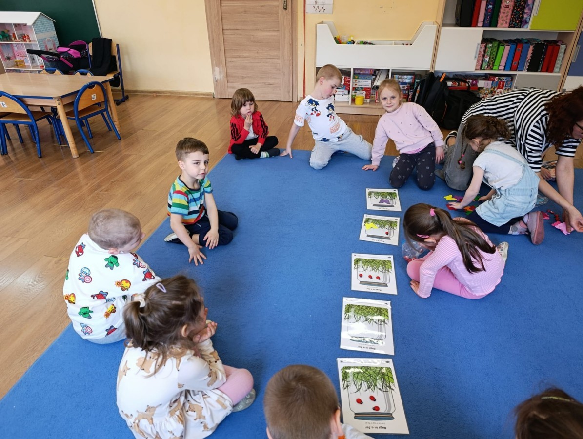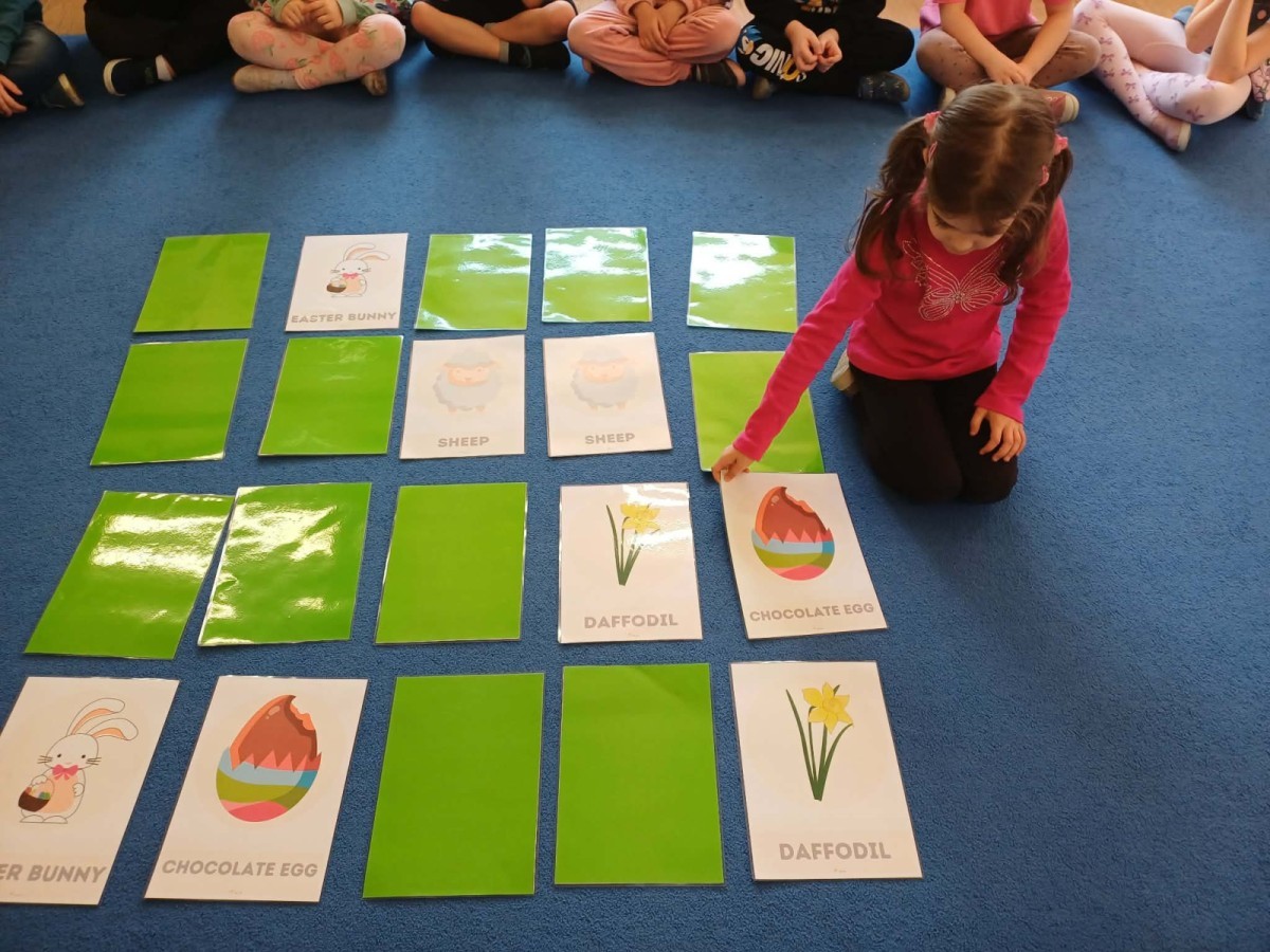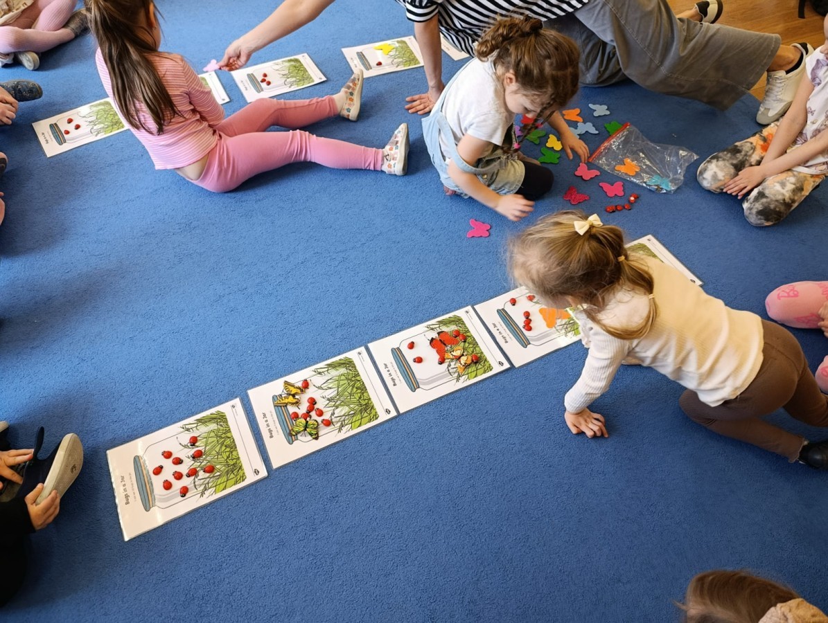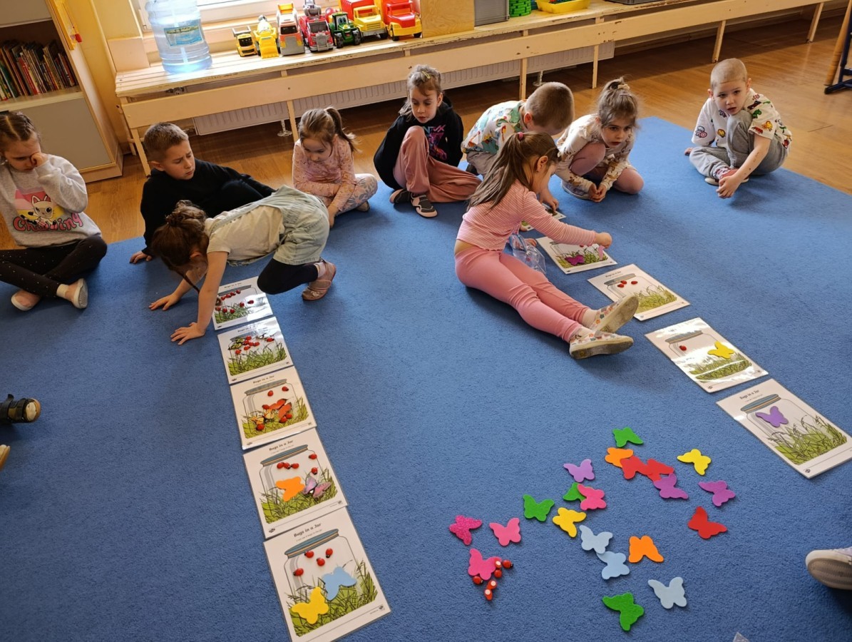 i zaśpiewały piosenkę „Bunny Hop”. Podczas kolejnych aktywności dzieci zagrały w memory, utrwalając poznane słownictwo wielkanocne. Ćwiczyły również liczebniki oraz słownictwo związane z wiosenną przyrodą – dopasowywały odpowiednią liczbę biedronek i motylków do słoiczków. Co więcej, same wybierały ilość elementów, dzięki czemu przy okazji rozwijały umiejętność liczenia i dodawania. To były pełne uśmiechu i nauki zajęcia.