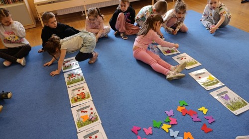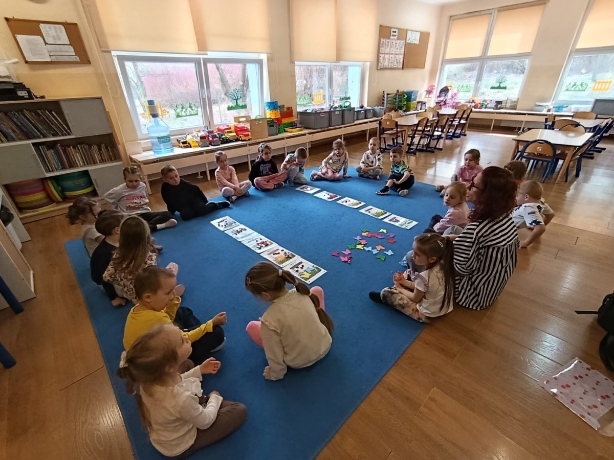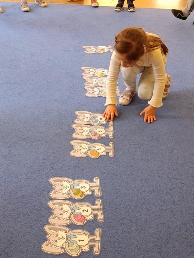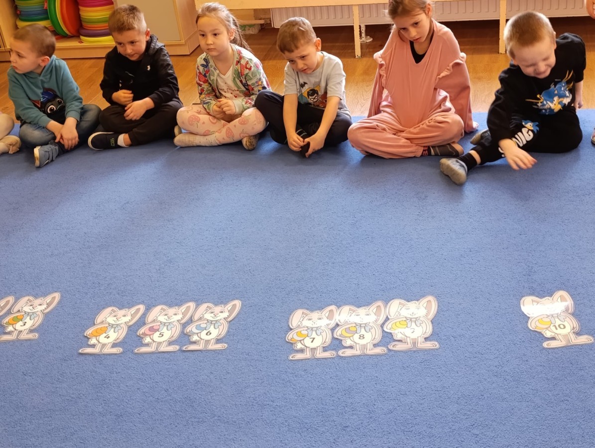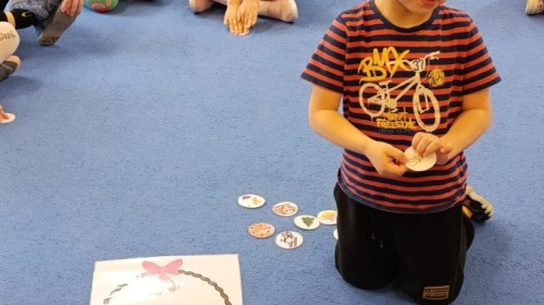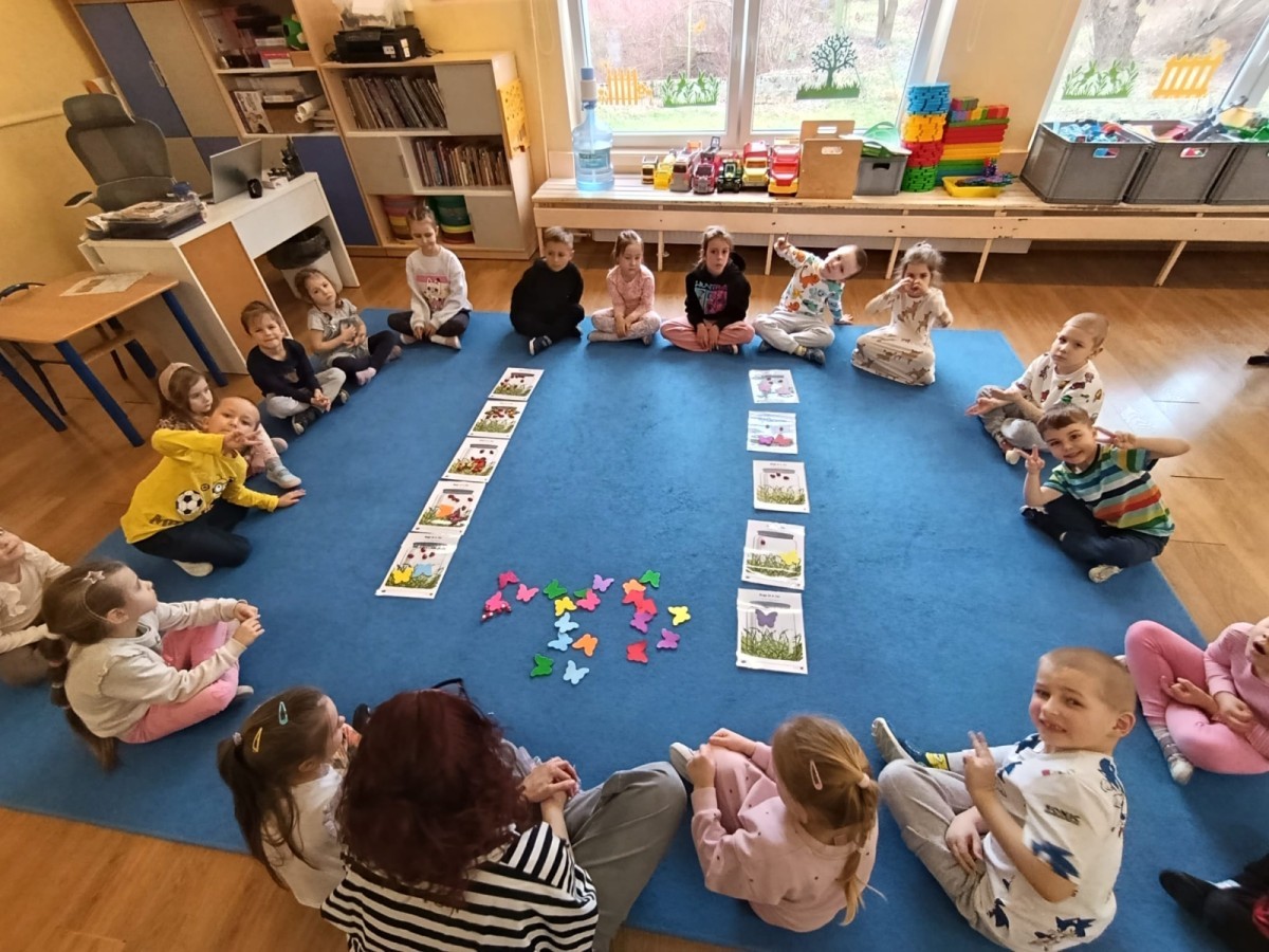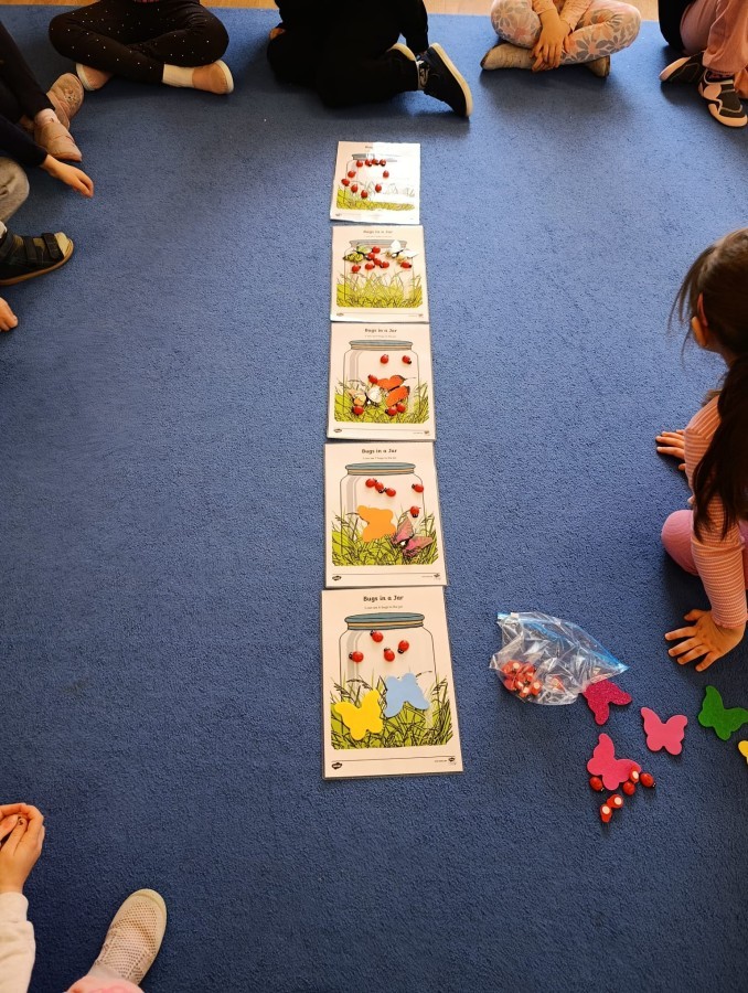 i zaśpiewały piosenkę „Bunny Hop”. Podczas kolejnych aktywności dzieci zagrały w memory, utrwalając poznane słownictwo wielkanocne. Ćwiczyły również liczebniki oraz słownictwo związane z wiosenną przyrodą – dopasowywały odpowiednią liczbę biedronek i motylków do słoiczków. Co więcej, same wybierały ilość elementów, dzięki czemu przy okazji rozwijały umiejętność liczenia i dodawania. To były pełne uśmiechu i nauki zajęcia.