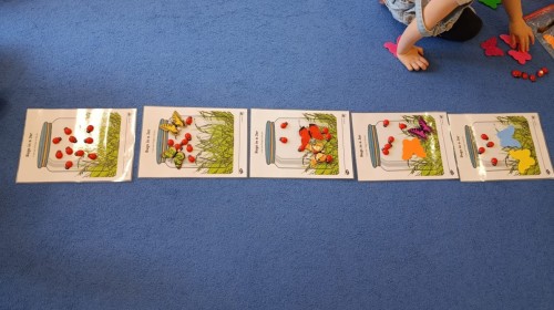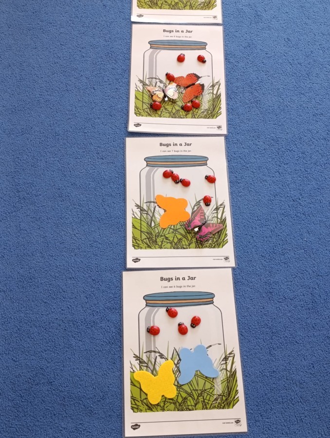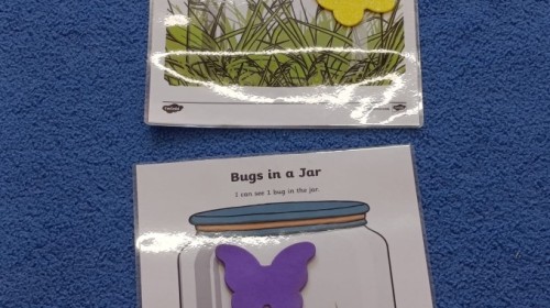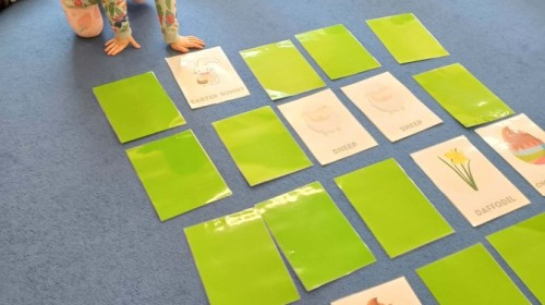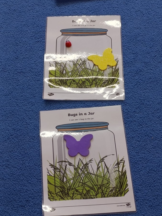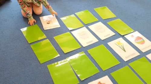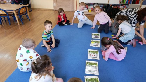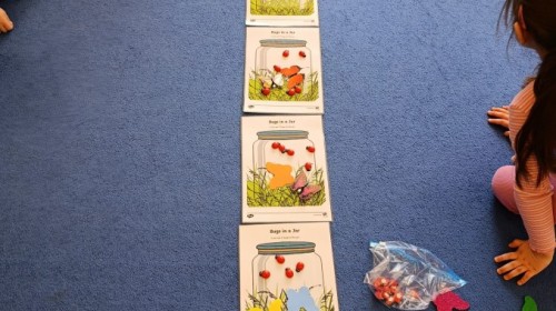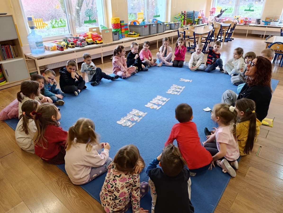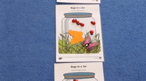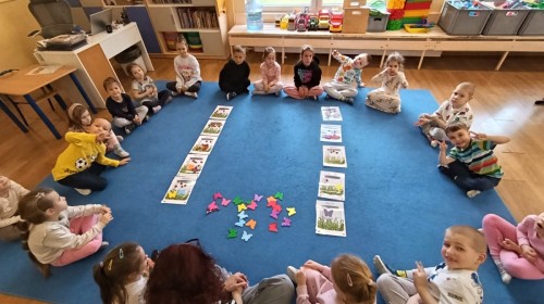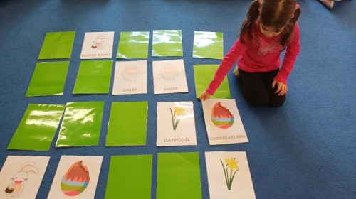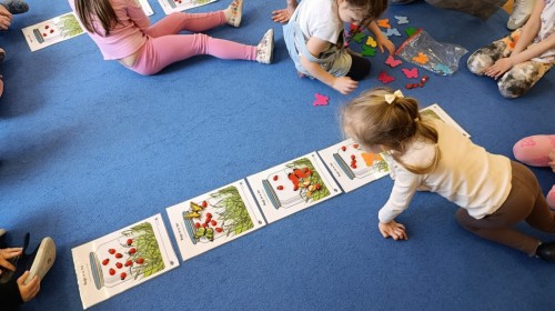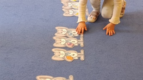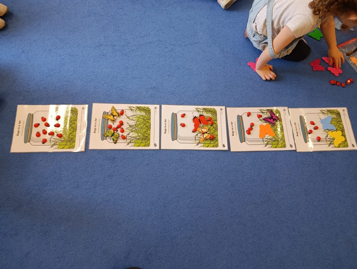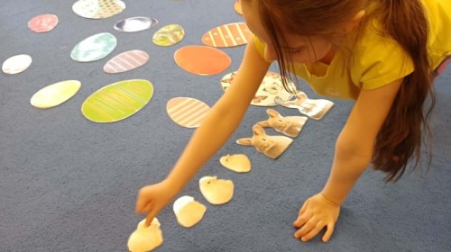 i zaśpiewały piosenkę „Bunny Hop”. Podczas kolejnych aktywności dzieci zagrały w memory, utrwalając poznane słownictwo wielkanocne. Ćwiczyły również liczebniki oraz słownictwo związane z wiosenną przyrodą – dopasowywały odpowiednią liczbę biedronek i motylków do słoiczków. Co więcej, same wybierały ilość elementów, dzięki czemu przy okazji rozwijały umiejętność liczenia i dodawania. To były pełne uśmiechu i nauki zajęcia.