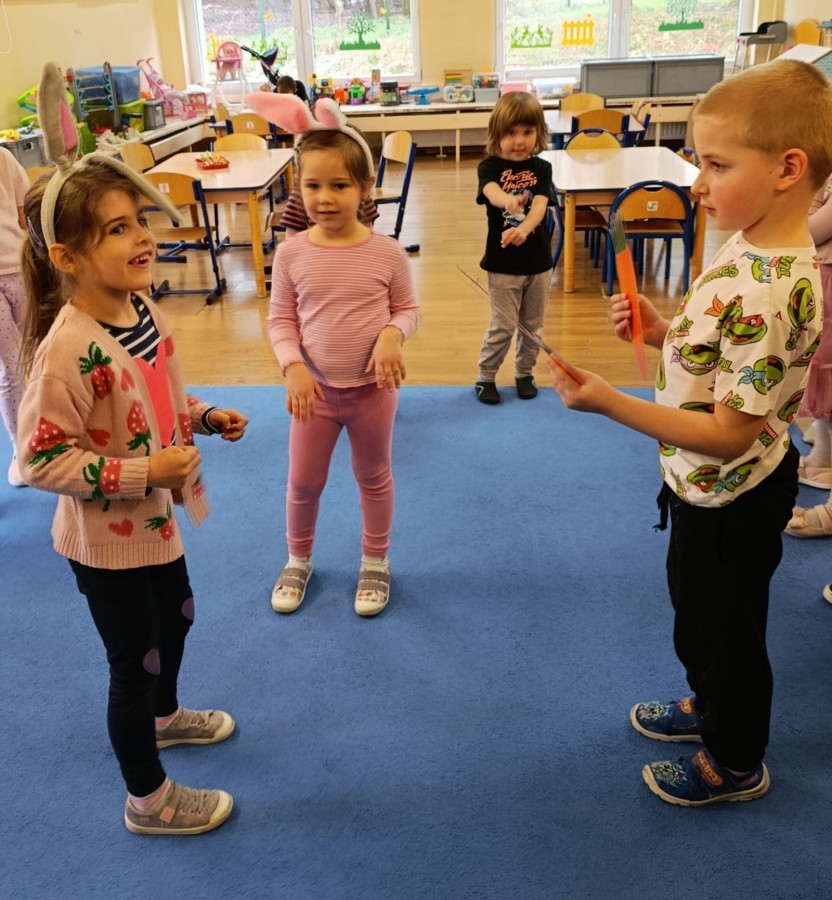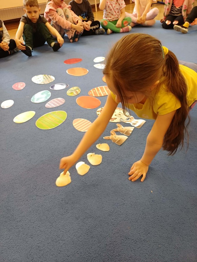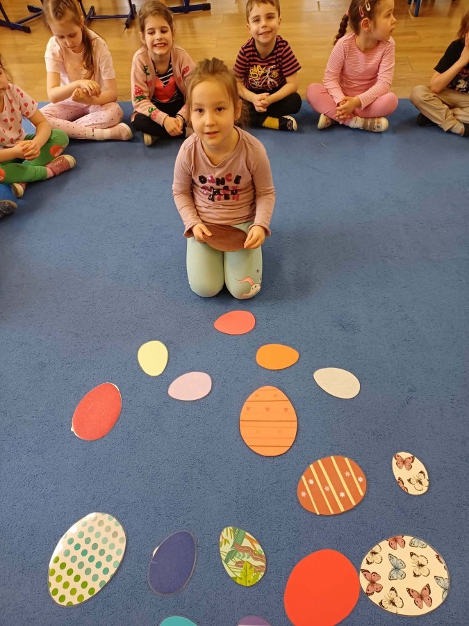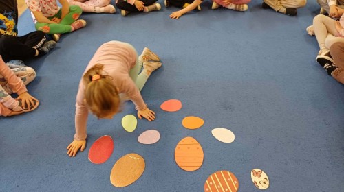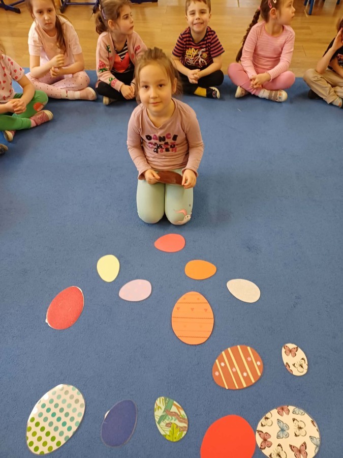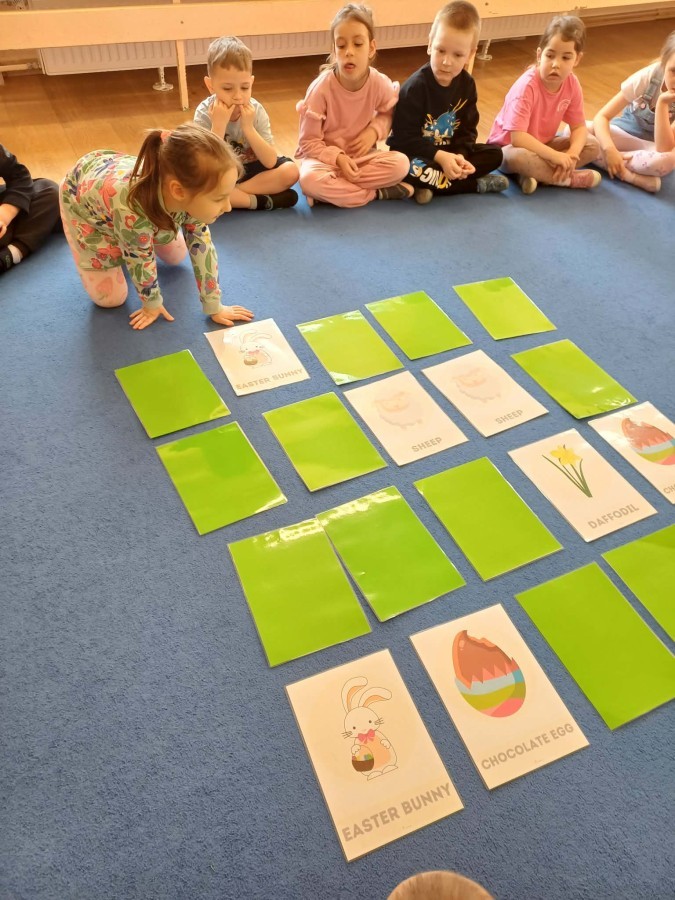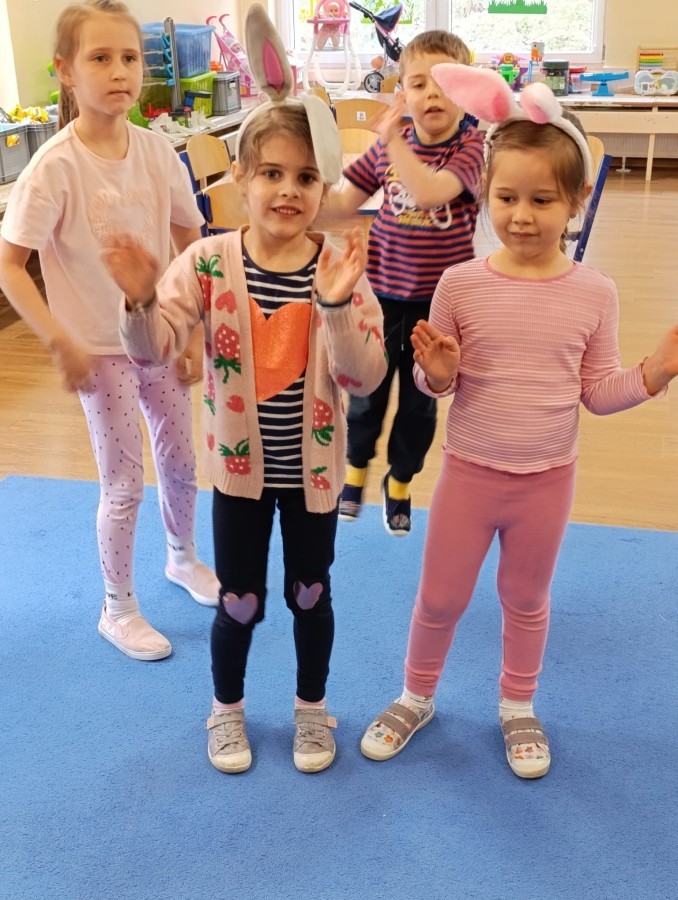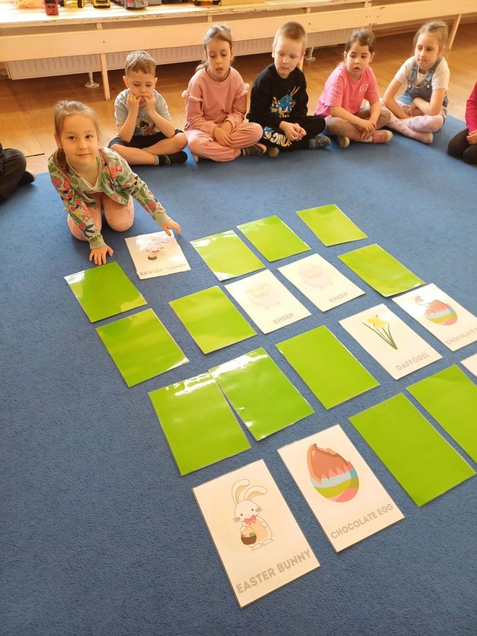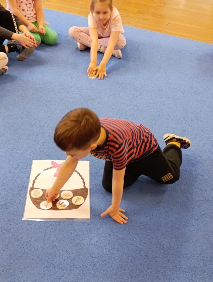 Marcowe zajęcia języka angielskiego w grupie "Jeżyków" upłynęły w radosnej, wielkanocno-wiosennej atmosferze. Dzieci rozszerzały słownictwo związane z Wielkanocą – otrzymały karty z różnymi emblematami i ich zadaniem było przypiąć do koszyczka wielkanocnego tylko te, które są związane ze świętami. Następnie, powtarzając krótką rymowankę, szukały ukrytych pod papierowymi pisankami postaci pisklaczka lub zajączka. Nie zabrakło także ruchu – przedszkolaki z zaangażowaniem naśladowały gesty