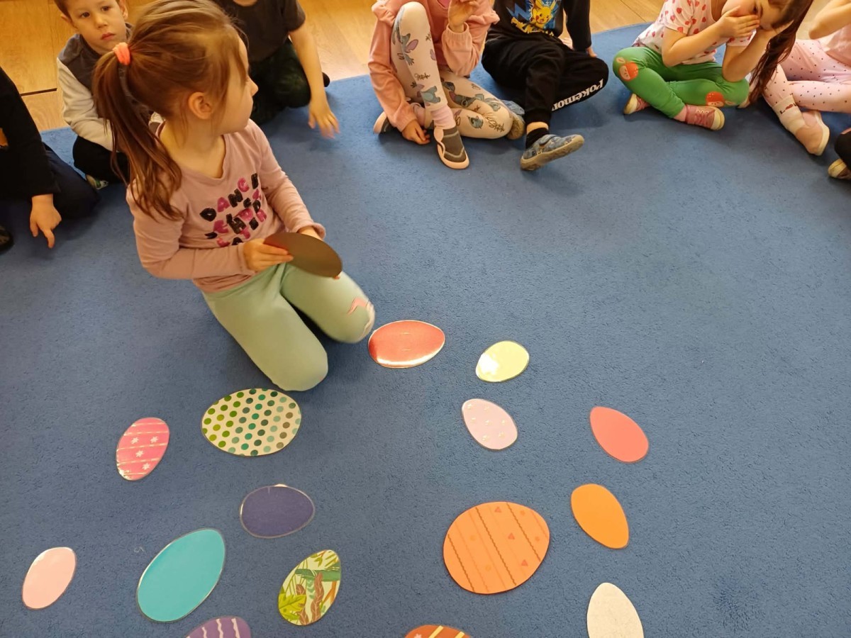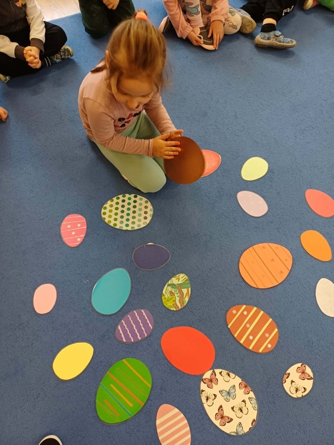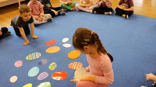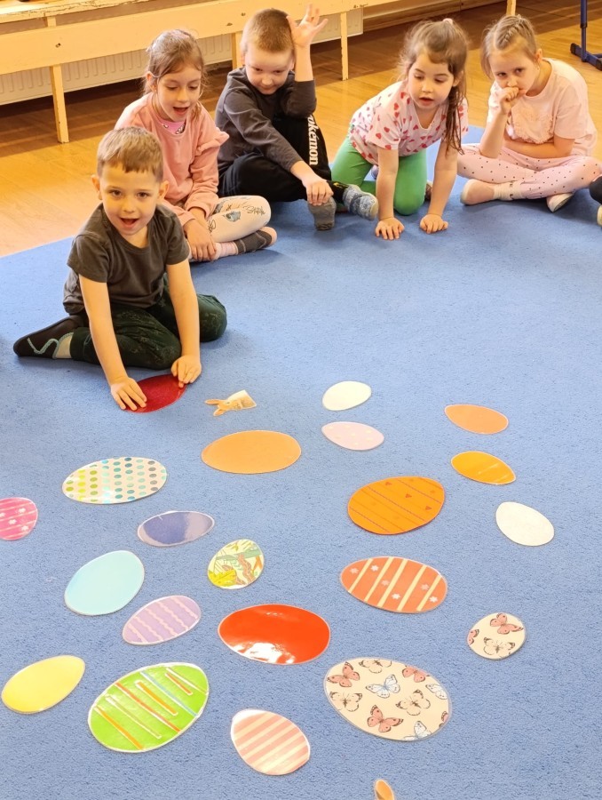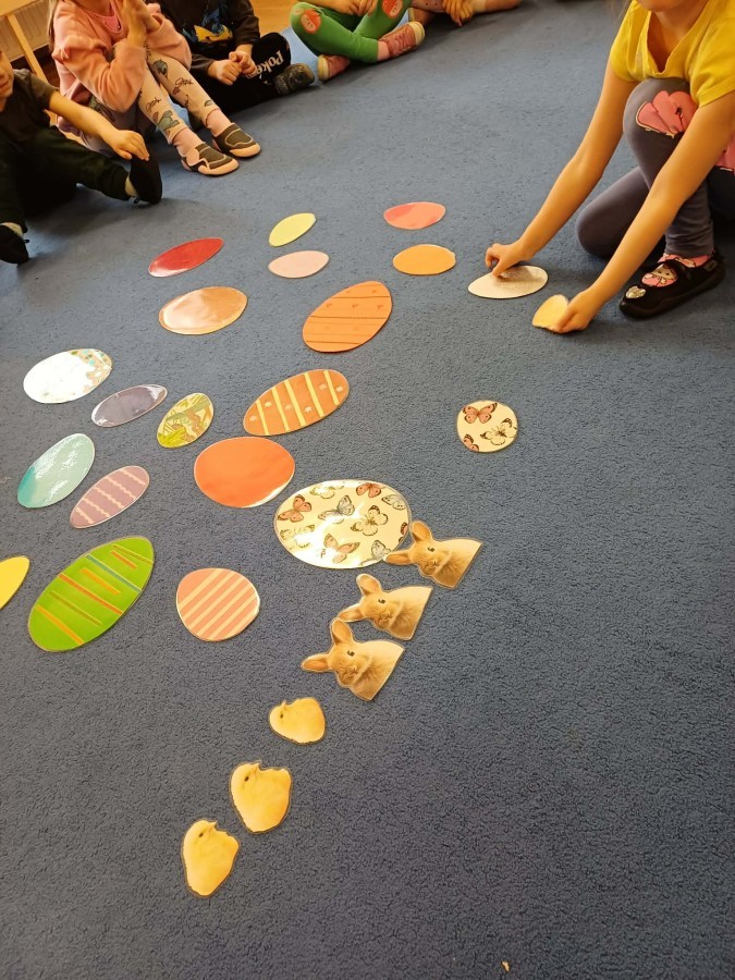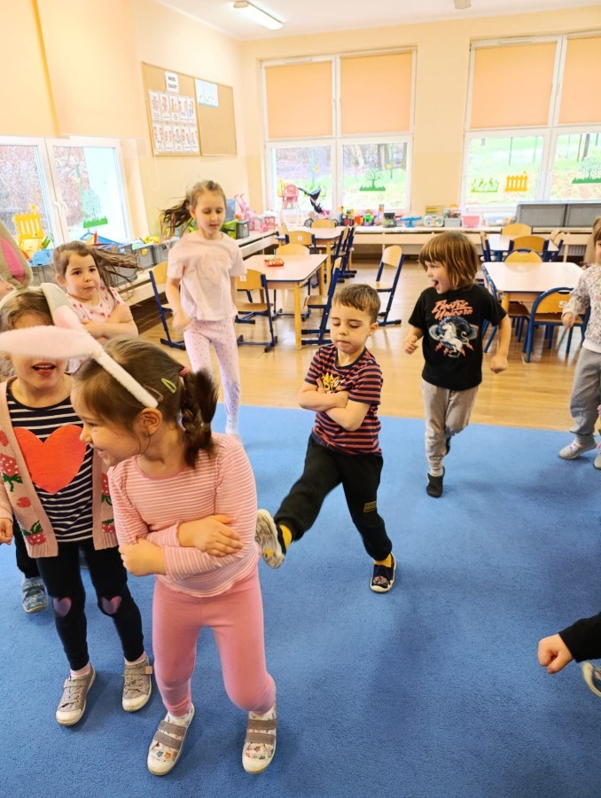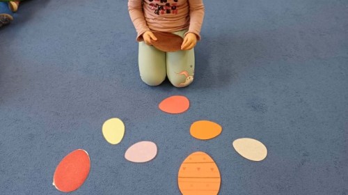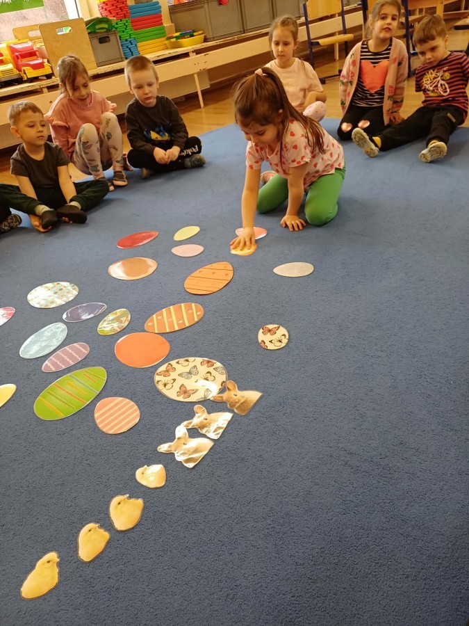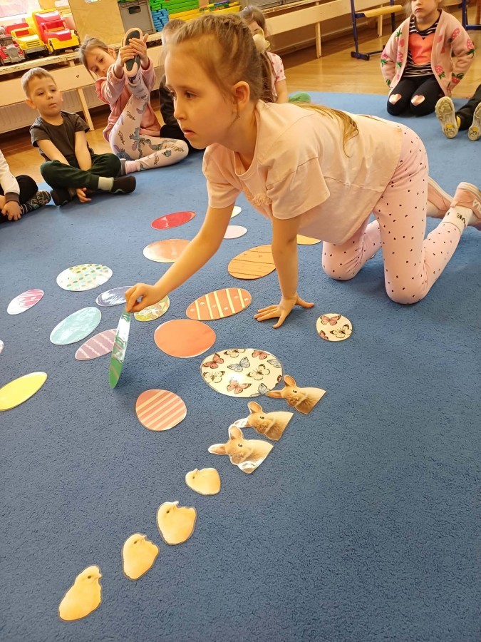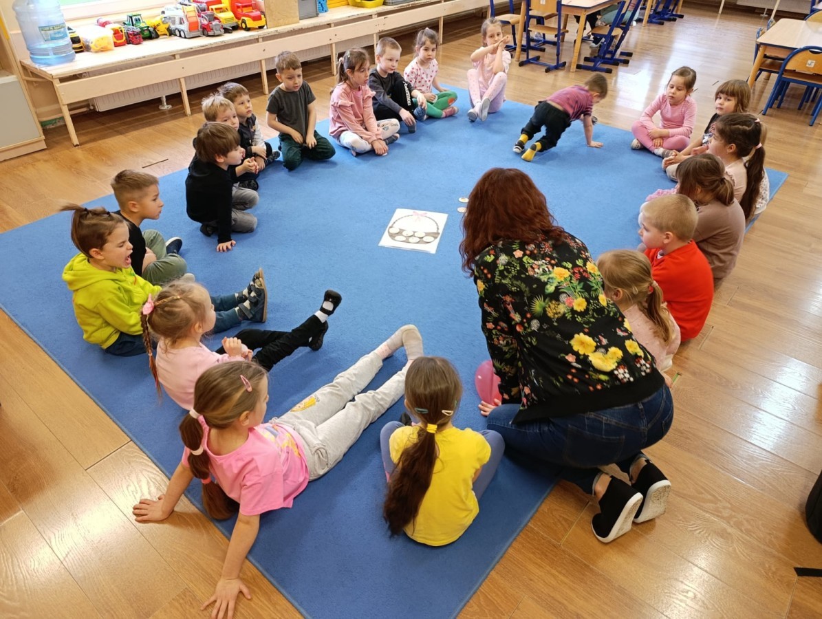 Marcowe zajęcia języka angielskiego w grupie "Jeżyków" upłynęły w radosnej, wielkanocno-wiosennej atmosferze. Dzieci rozszerzały słownictwo związane z Wielkanocą – otrzymały karty z różnymi emblematami i ich zadaniem było przypiąć do koszyczka wielkanocnego tylko te, które są związane ze świętami. Następnie, powtarzając krótką rymowankę, szukały ukrytych pod papierowymi pisankami postaci pisklaczka lub zajączka. Nie zabrakło także ruchu – przedszkolaki z zaangażowaniem naśladowały gesty