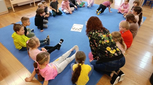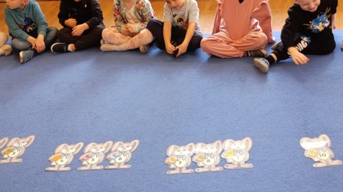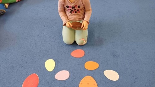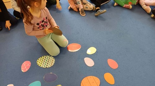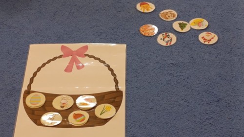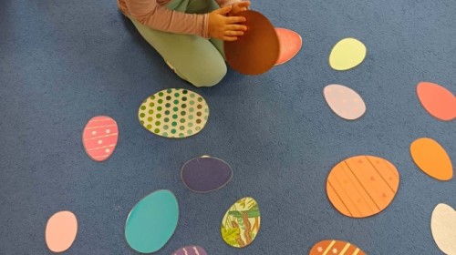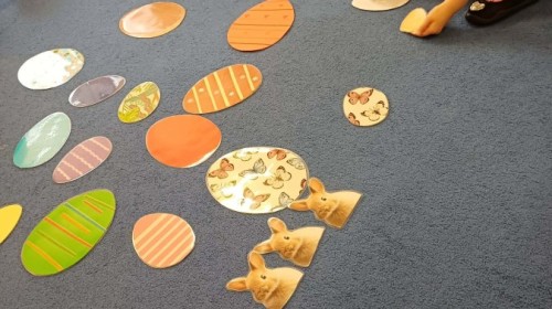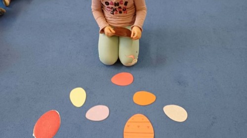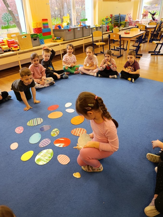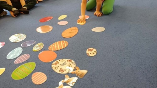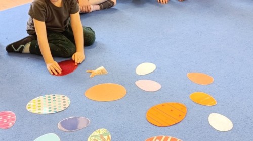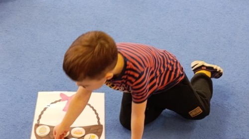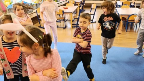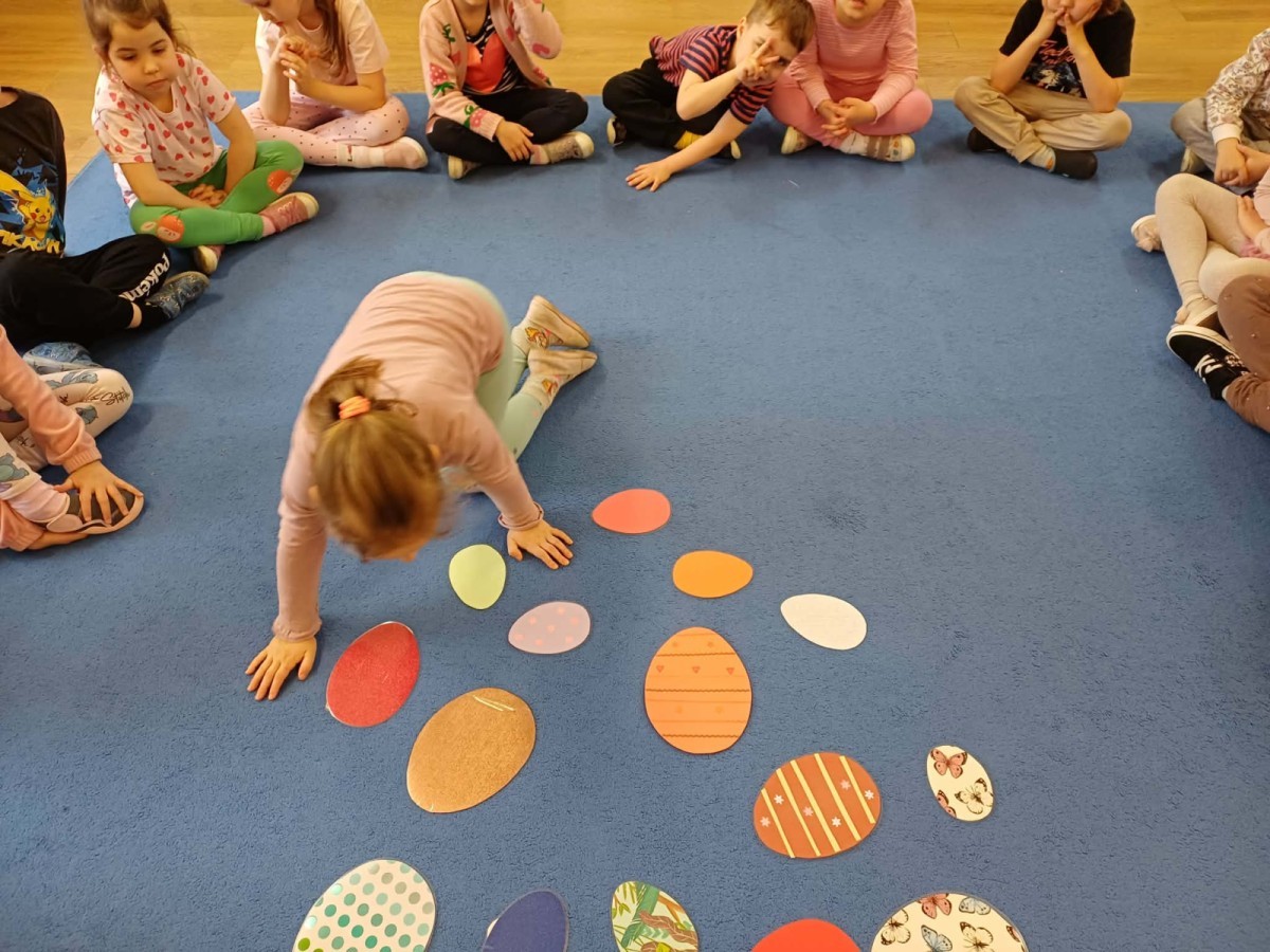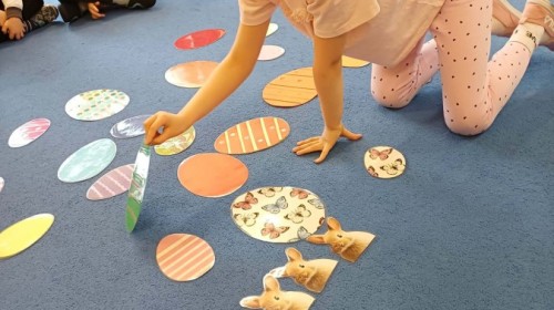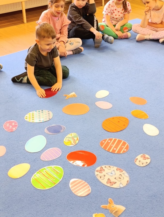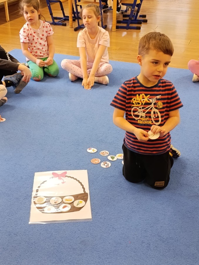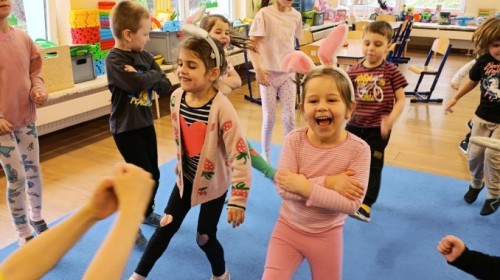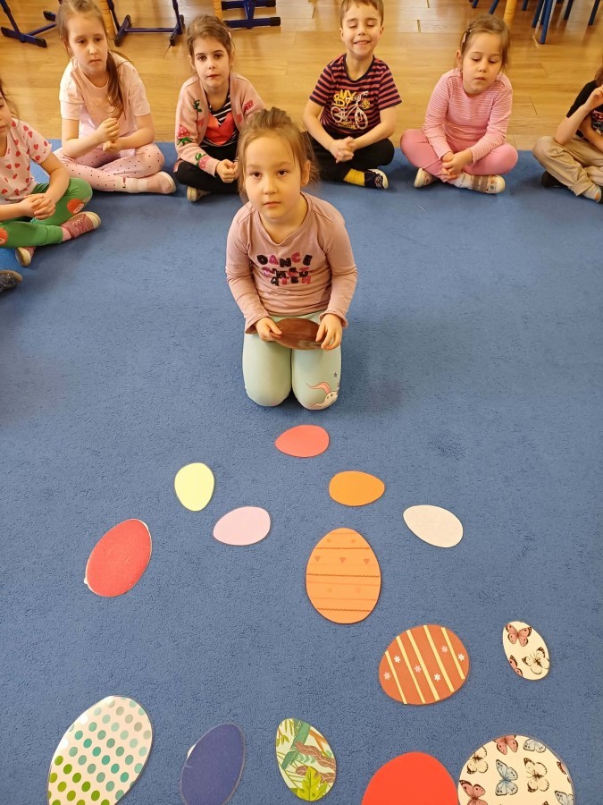 Marcowe zajęcia języka angielskiego w grupie "Jeżyków" upłynęły w radosnej, wielkanocno-wiosennej atmosferze. Dzieci rozszerzały słownictwo związane z Wielkanocą – otrzymały karty z różnymi emblematami i ich zadaniem było przypiąć do koszyczka wielkanocnego tylko te, które są związane ze świętami. Następnie, powtarzając krótką rymowankę, szukały ukrytych pod papierowymi pisankami postaci pisklaczka lub zajączka. Nie zabrakło także ruchu – przedszkolaki z zaangażowaniem naśladowały gesty