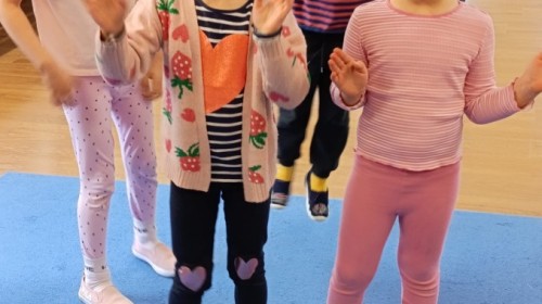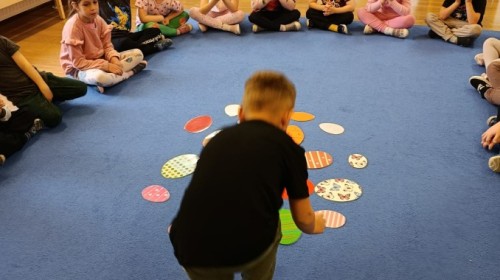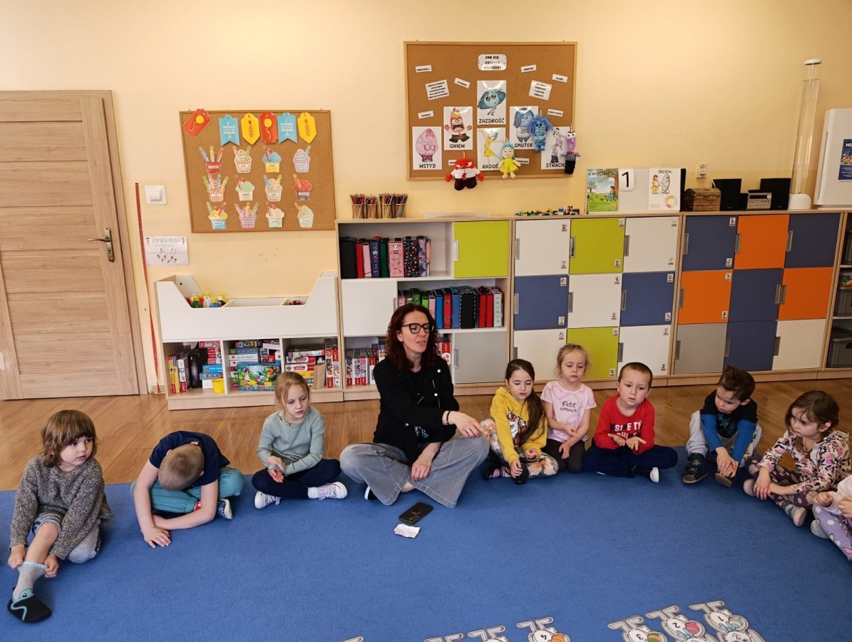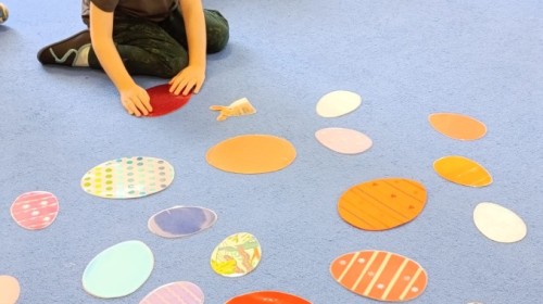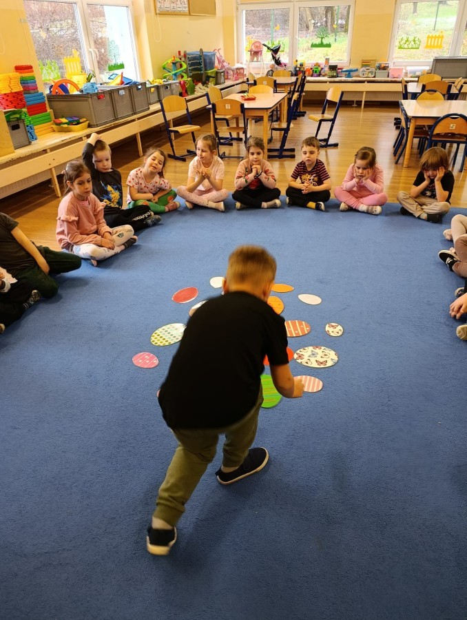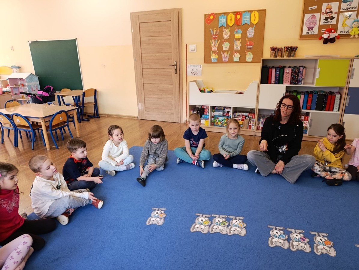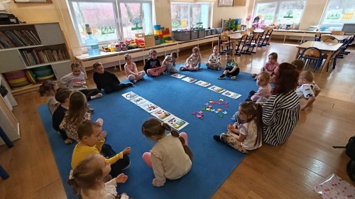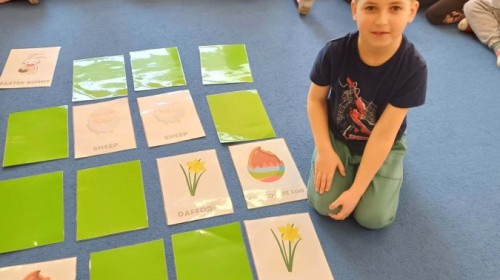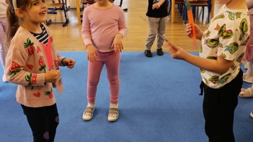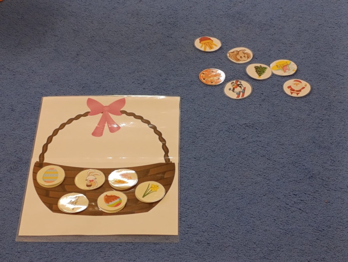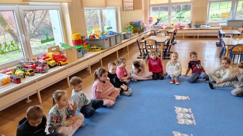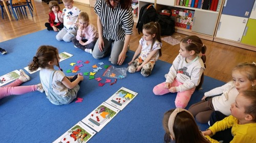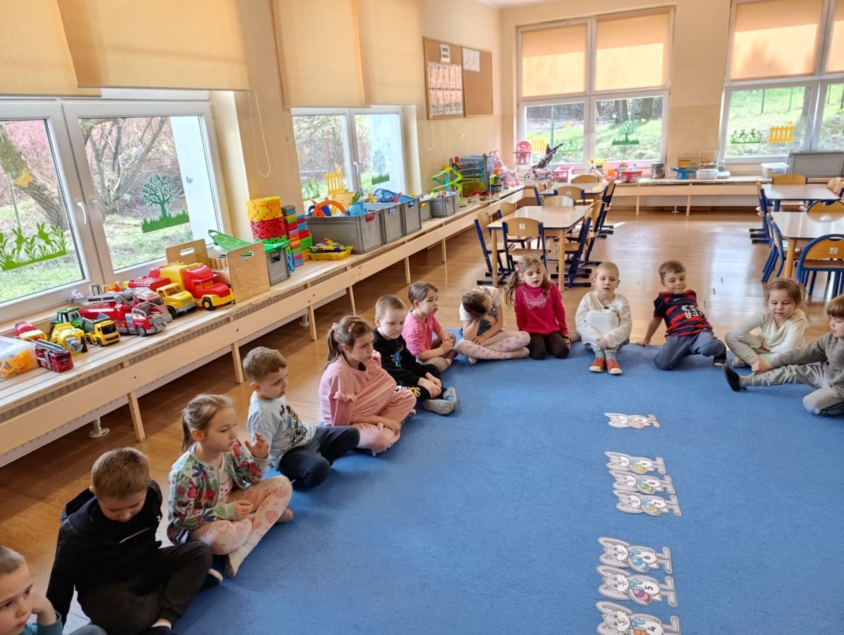 Marcowe zajęcia języka angielskiego w grupie "Jeżyków" upłynęły w radosnej, wielkanocno-wiosennej atmosferze. Dzieci rozszerzały słownictwo związane z Wielkanocą – otrzymały karty z różnymi emblematami i ich zadaniem było przypiąć do koszyczka wielkanocnego tylko te, które są związane ze świętami. Następnie, powtarzając krótką rymowankę, szukały ukrytych pod papierowymi pisankami postaci pisklaczka lub zajączka. Nie zabrakło także ruchu – przedszkolaki z zaangażowaniem naśladowały gesty