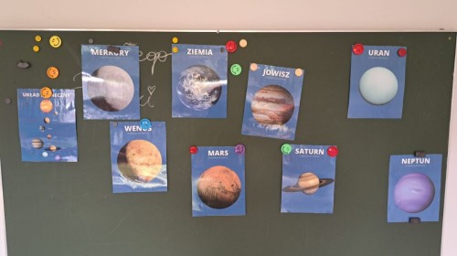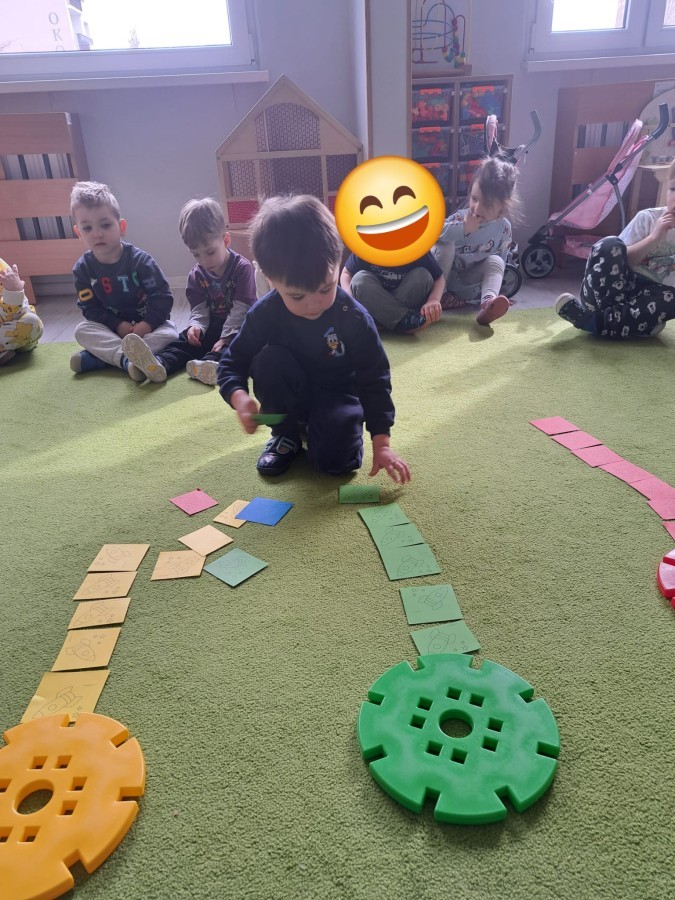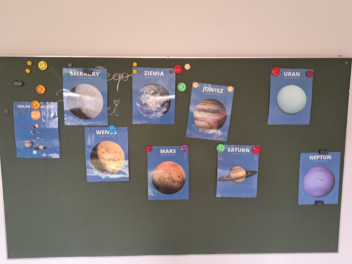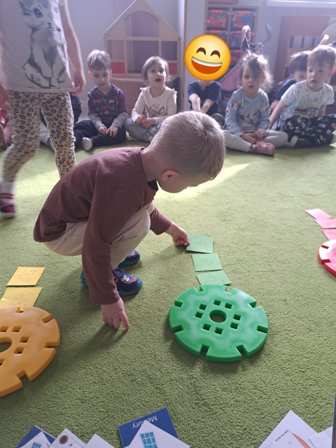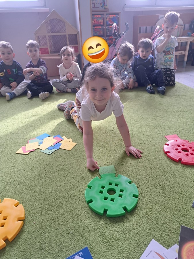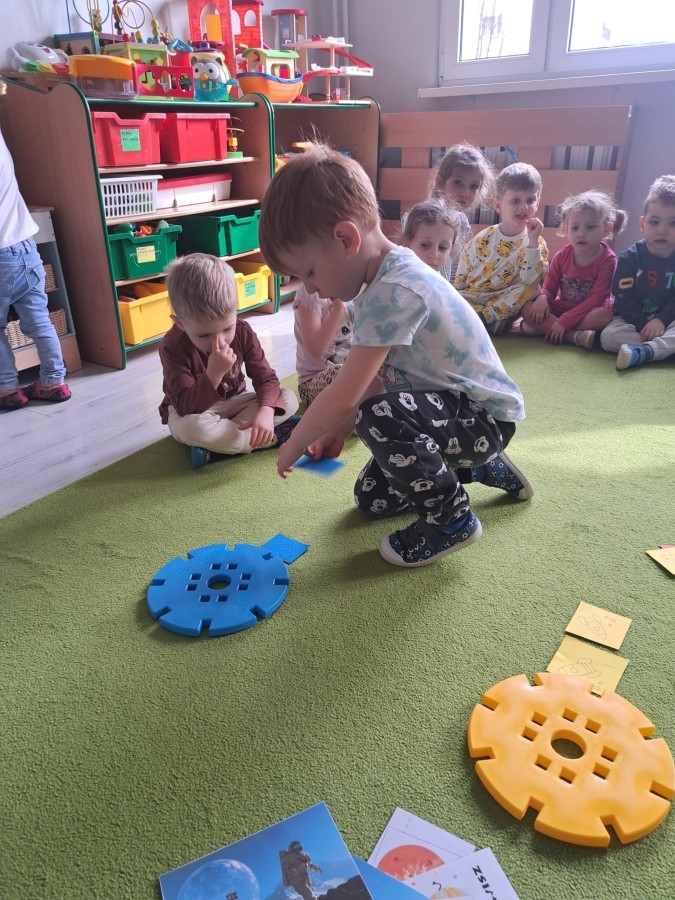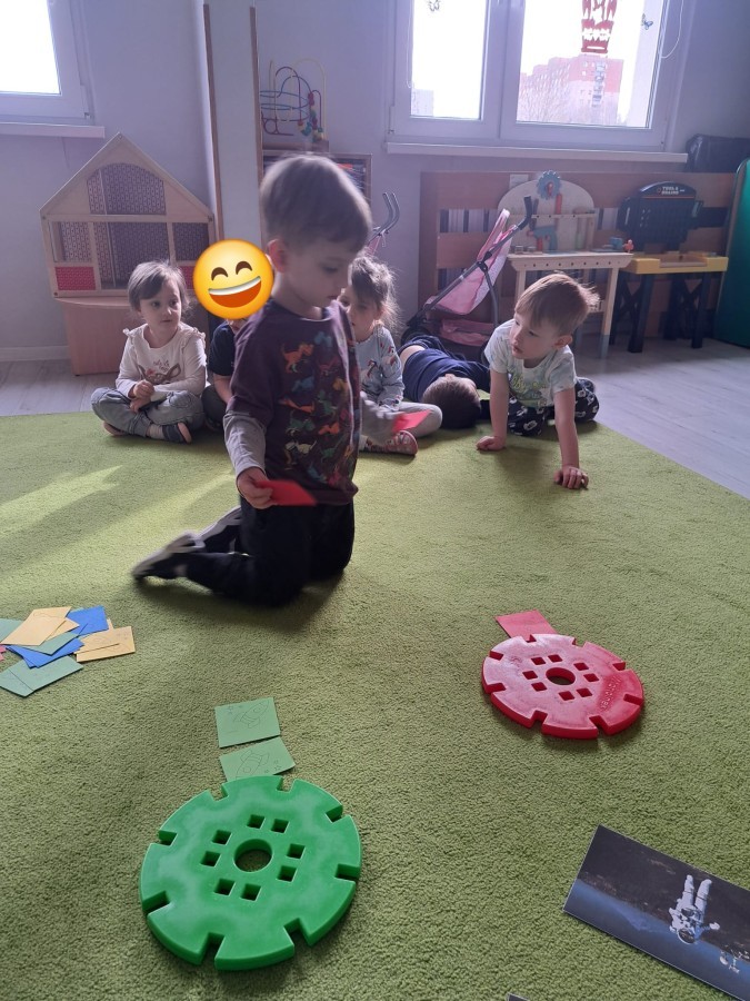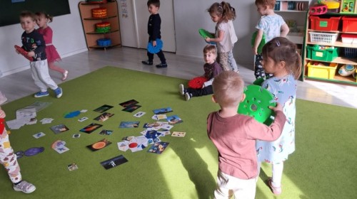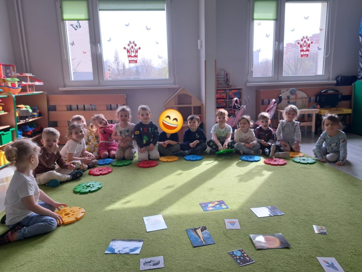 Grupa "Liski" podczas wspólnych zajęć poznawała planety, odsłuchaliśmy również dźwięki, jakie wydają poszczególne planety. Utrwalaliśmy kolory oraz przeliczaliśmy poszczególne kartoniki z kolorami porównując ich ilości. Nie zabrakło także aktywności ruchowej w formie toru przeszkód, który dostarczył dzieciom wiele radości i pozytywnej energii.
