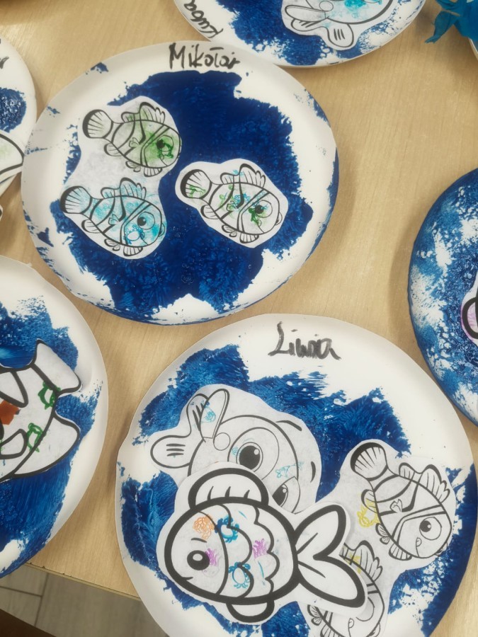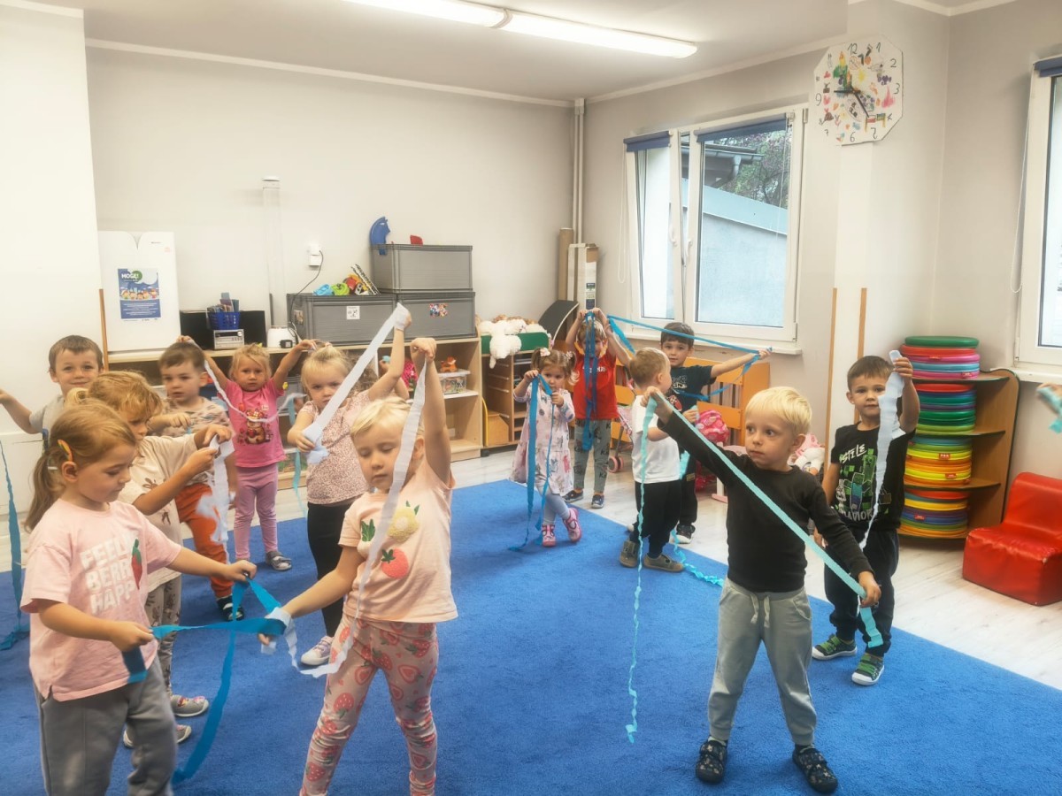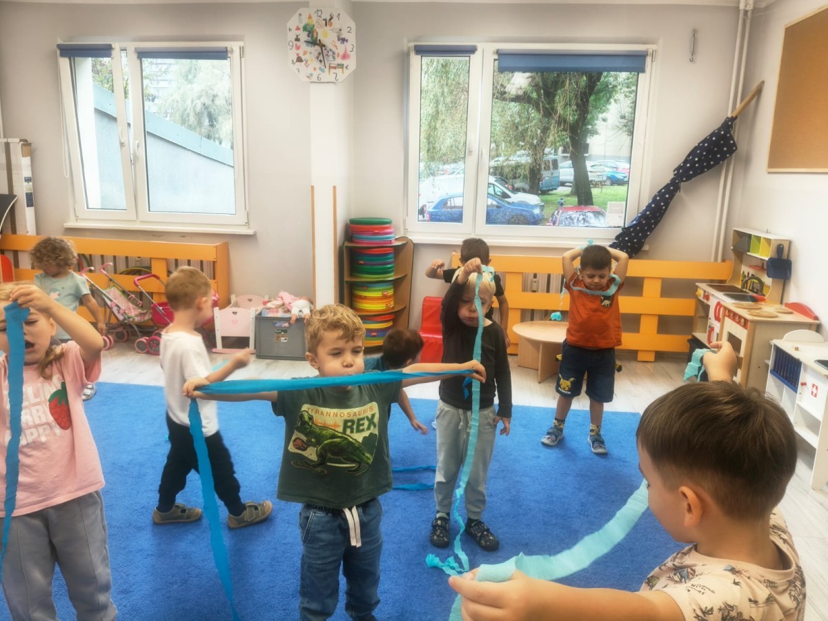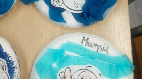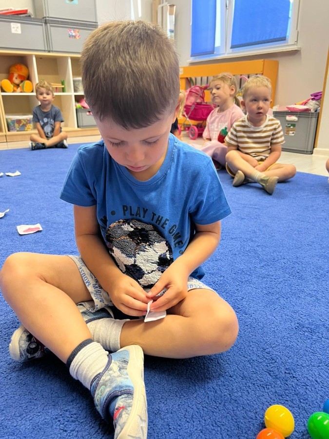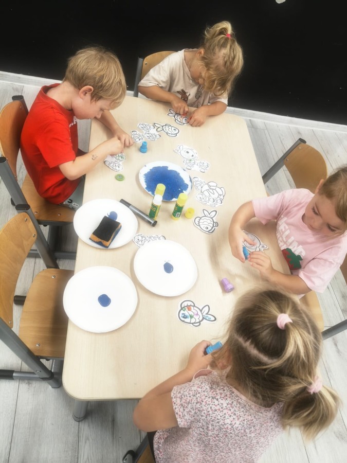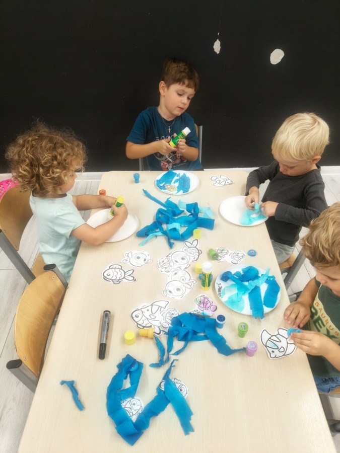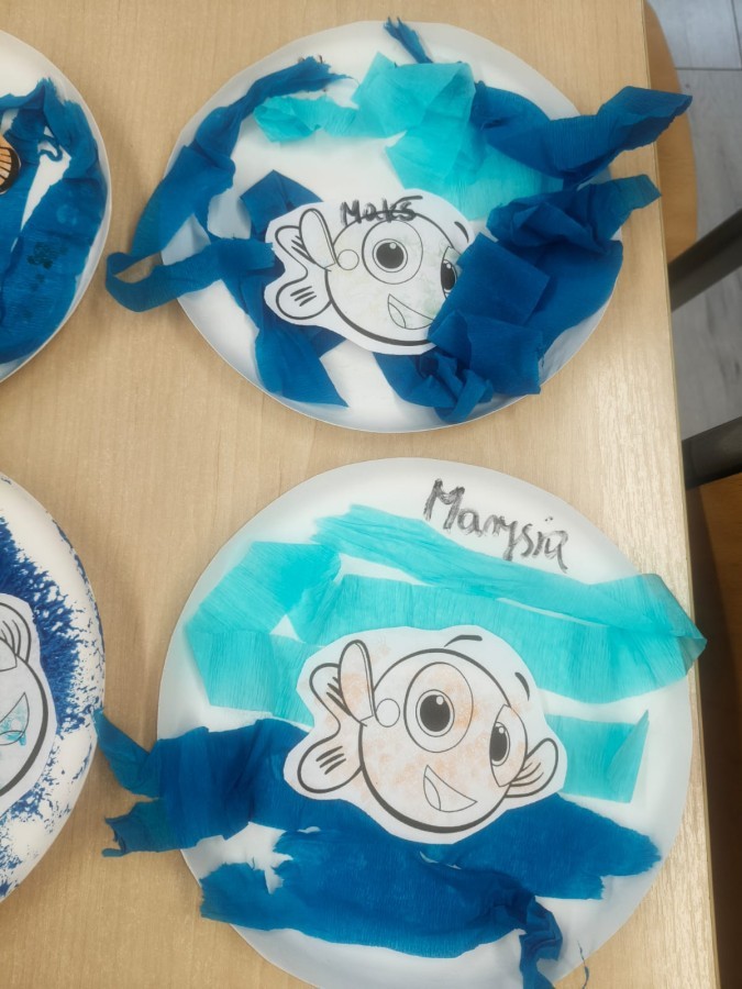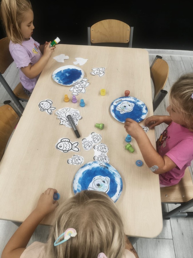 z papierowych talerzyków – tworzyły morskie krajobrazy z rybkami. Wodę malowały farbami lub wyklejały kolorową bibułą, rozwijając przy tym wyobraźnię i sprawność manualną. Kolejnym zadaniem było losowanie kuleczek z ukrytymi obrazkami. Zadaniem dzieci było dopasowanie obrazków do odpowiednich grup, a przy okazji powtórzyliśmy sobie znajomość kolorów. Ponieważ nasza grupa jest już starsza, wprowadziliśmy także kalendarz pogodowy. Dzieci codziennie uczą się rozróżniać pory roku, nazywać dni tygodnia oraz obserwować i zaznaczać, jaka jest pogoda. Pierwsze dni w przedszkolu po wakacyjnej przerwie pełne były radości, wspólnej zabawy i nauki.