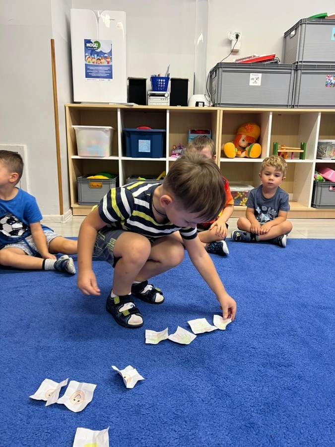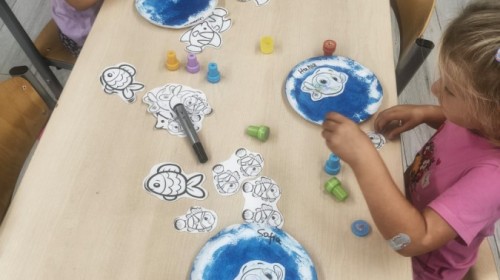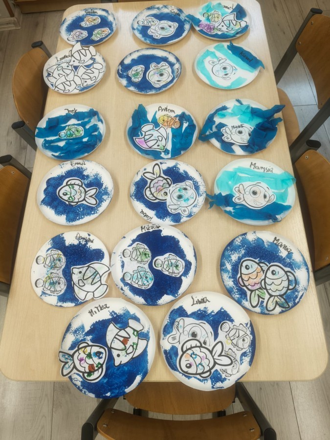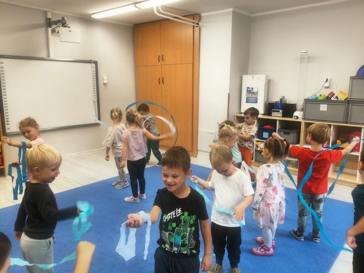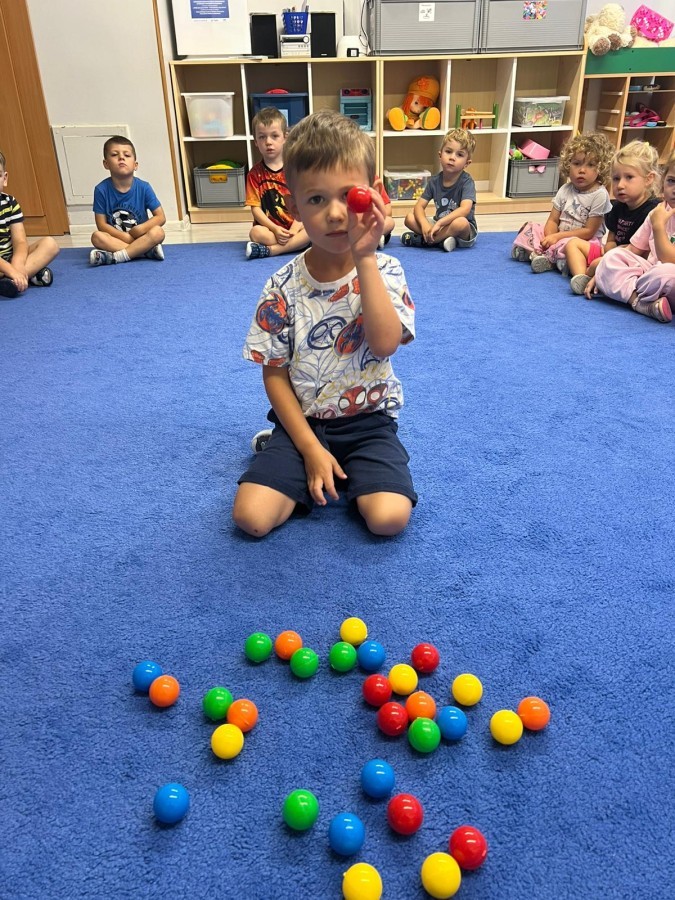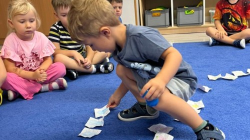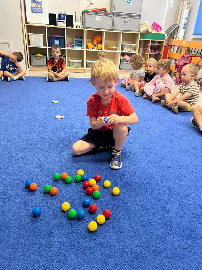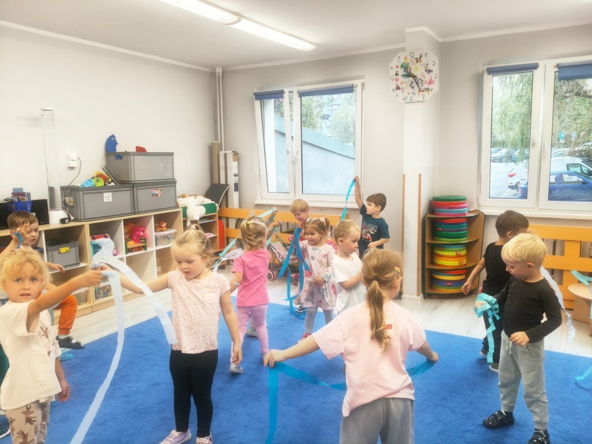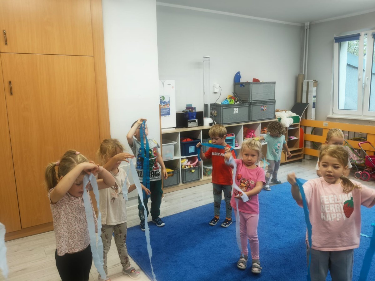 z papierowych talerzyków – tworzyły morskie krajobrazy z rybkami. Wodę malowały farbami lub wyklejały kolorową bibułą, rozwijając przy tym wyobraźnię i sprawność manualną. Kolejnym zadaniem było losowanie kuleczek z ukrytymi obrazkami. Zadaniem dzieci było dopasowanie obrazków do odpowiednich grup, a przy okazji powtórzyliśmy sobie znajomość kolorów. Ponieważ nasza grupa jest już starsza, wprowadziliśmy także kalendarz pogodowy. Dzieci codziennie uczą się rozróżniać pory roku, nazywać dni tygodnia oraz obserwować i zaznaczać, jaka jest pogoda. Pierwsze dni w przedszkolu po wakacyjnej przerwie pełne były radości, wspólnej zabawy i nauki.