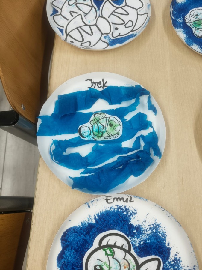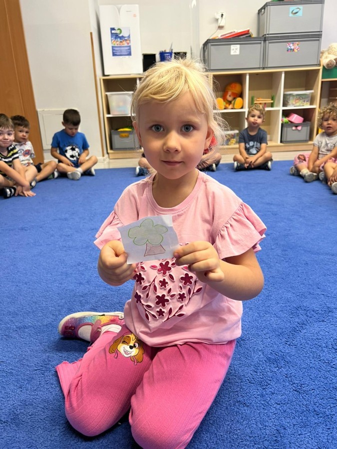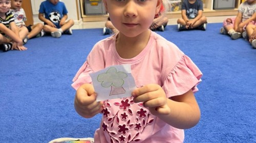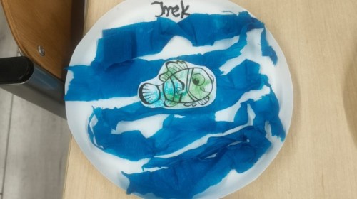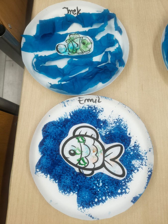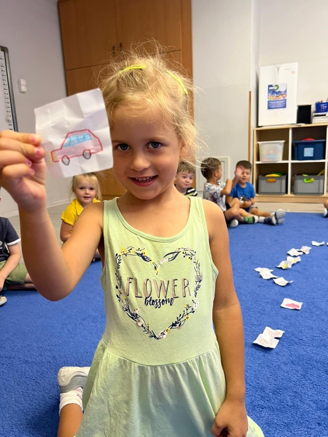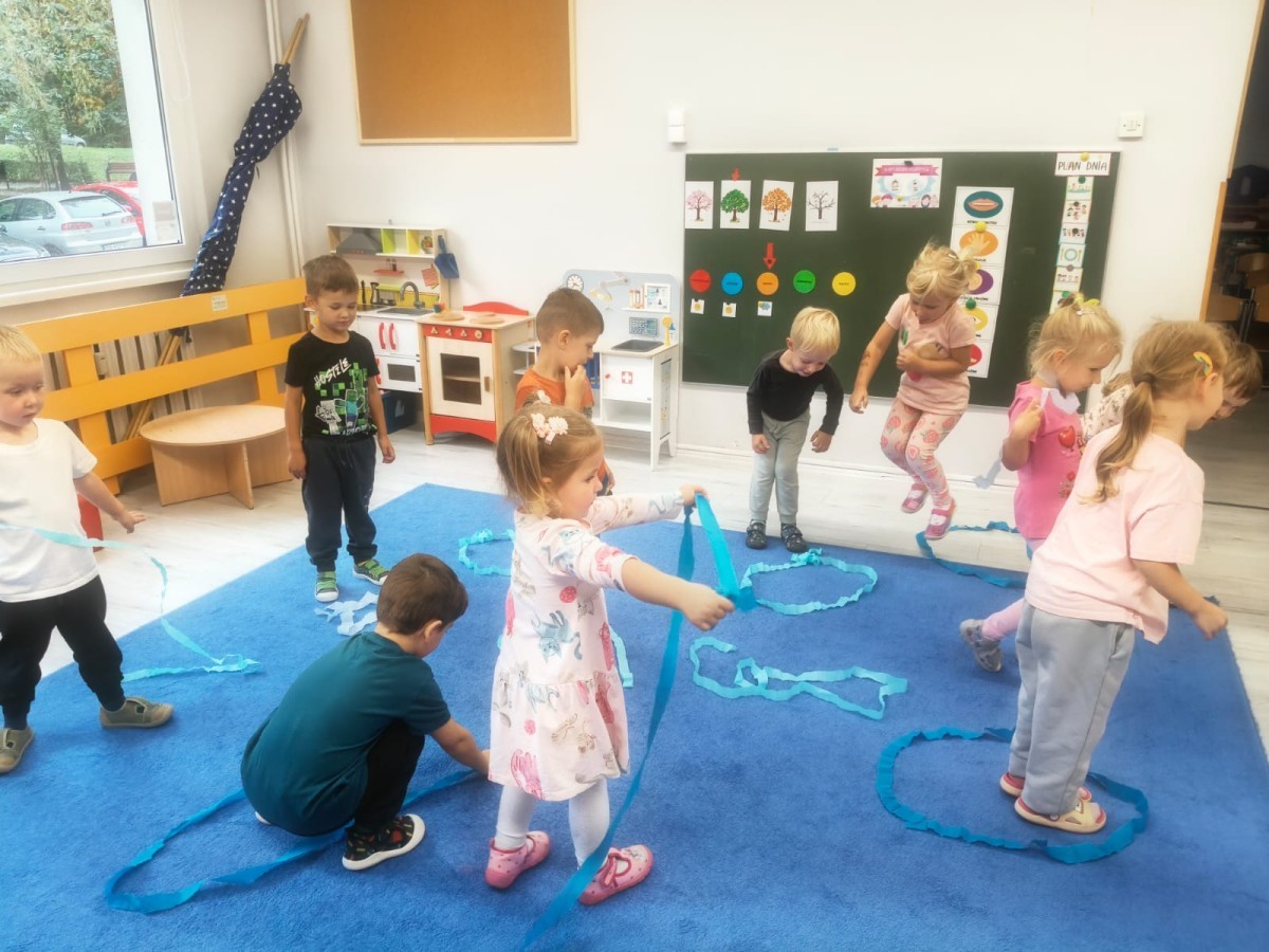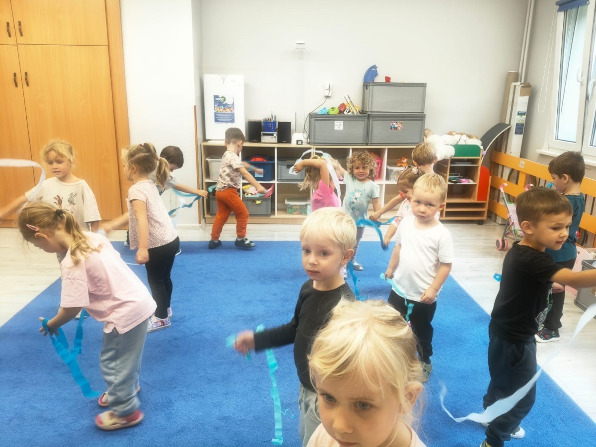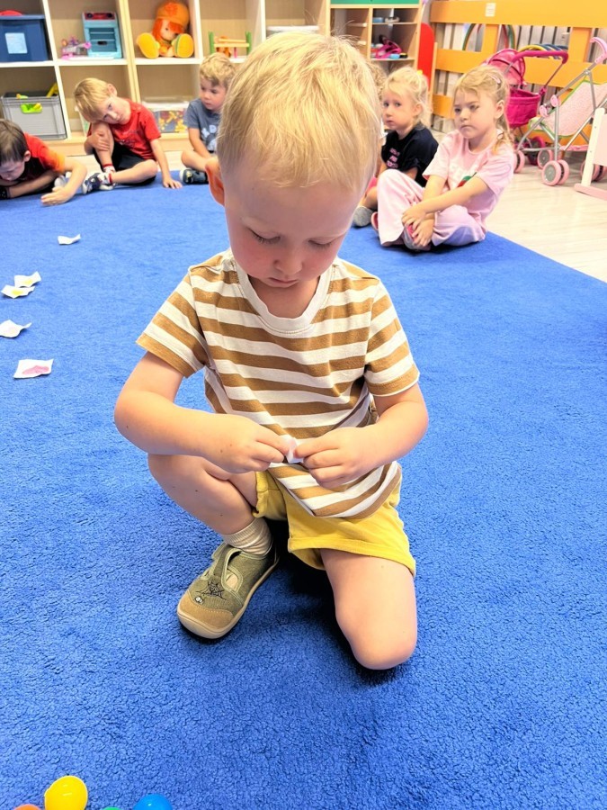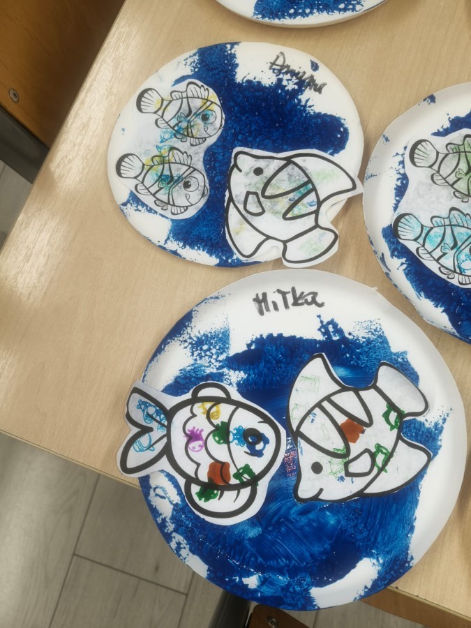 z papierowych talerzyków – tworzyły morskie krajobrazy z rybkami. Wodę malowały farbami lub wyklejały kolorową bibułą, rozwijając przy tym wyobraźnię i sprawność manualną. Kolejnym zadaniem było losowanie kuleczek z ukrytymi obrazkami. Zadaniem dzieci było dopasowanie obrazków do odpowiednich grup, a przy okazji powtórzyliśmy sobie znajomość kolorów. Ponieważ nasza grupa jest już starsza, wprowadziliśmy także kalendarz pogodowy. Dzieci codziennie uczą się rozróżniać pory roku, nazywać dni tygodnia oraz obserwować i zaznaczać, jaka jest pogoda. Pierwsze dni w przedszkolu po wakacyjnej przerwie pełne były radości, wspólnej zabawy i nauki.