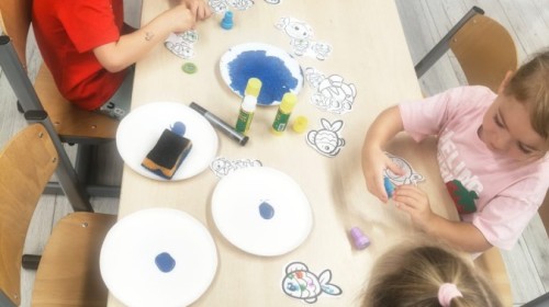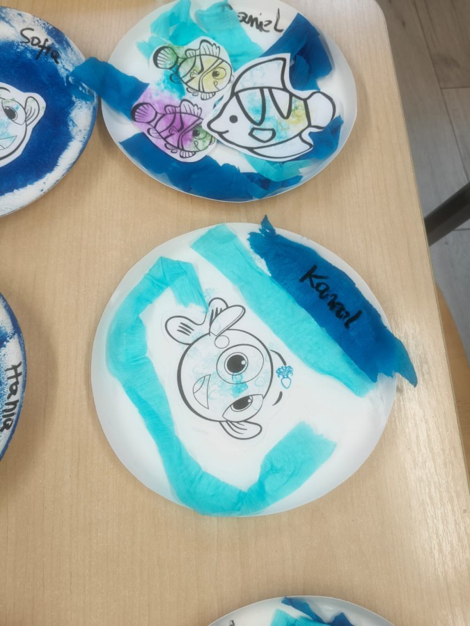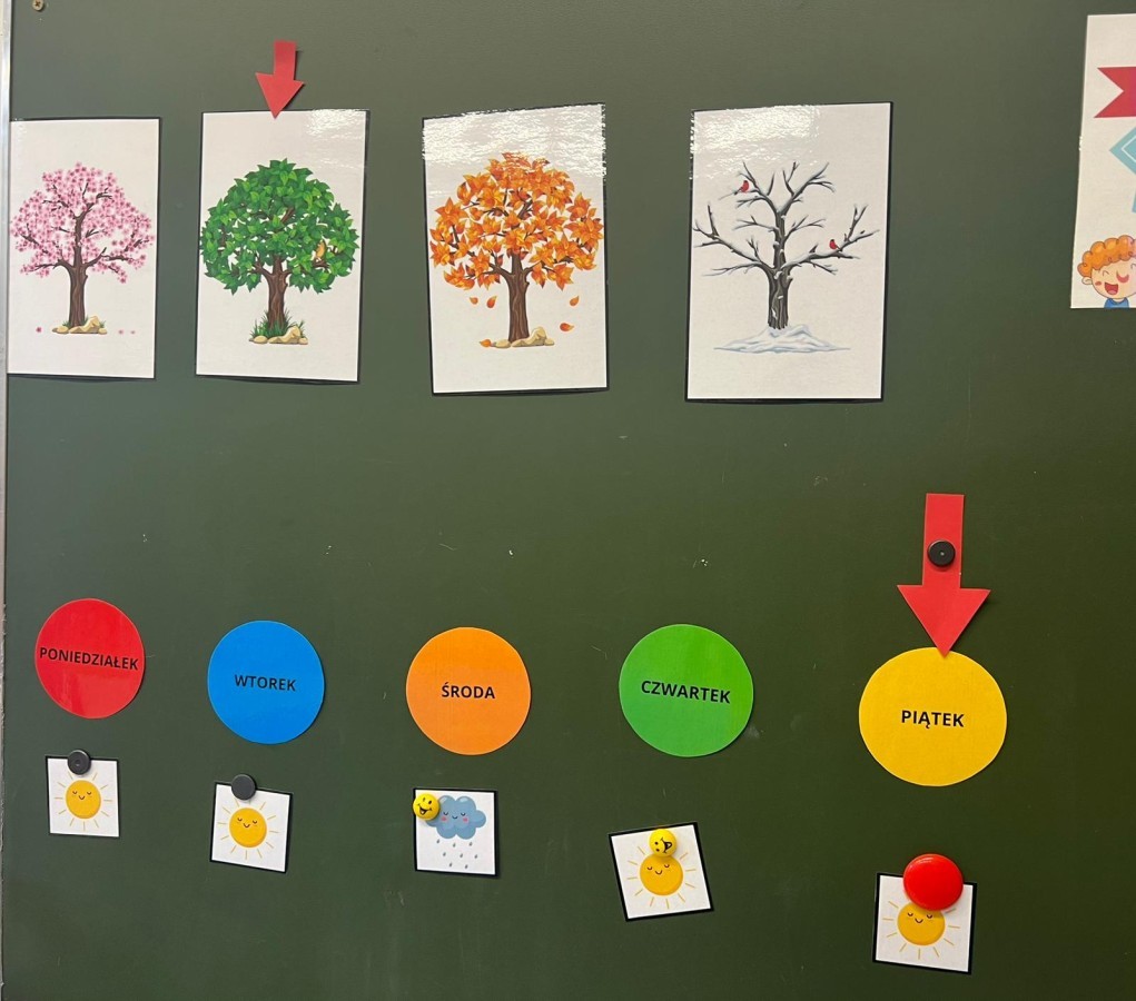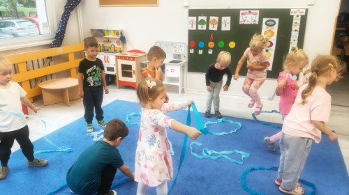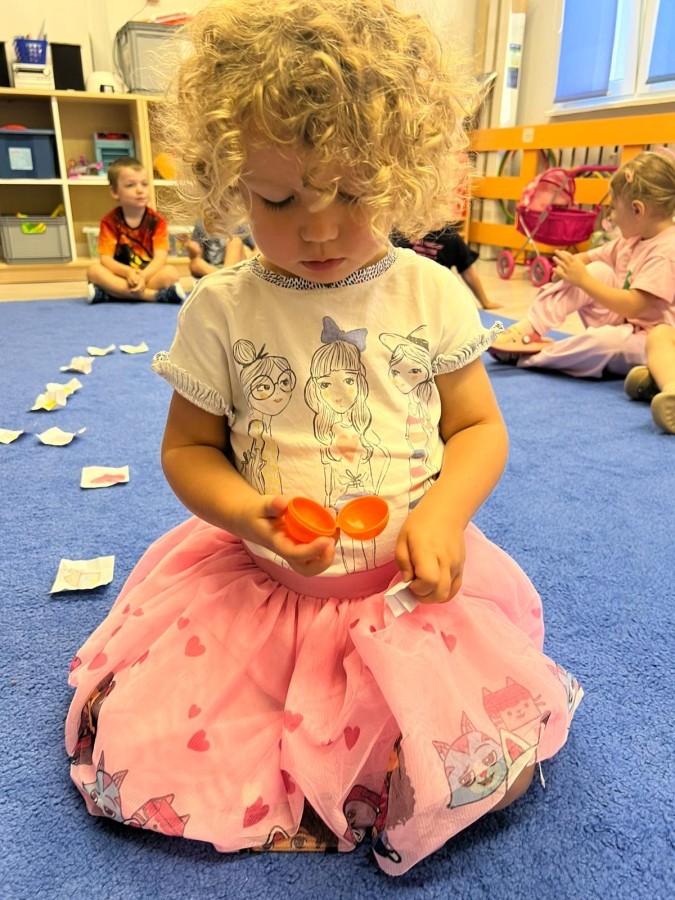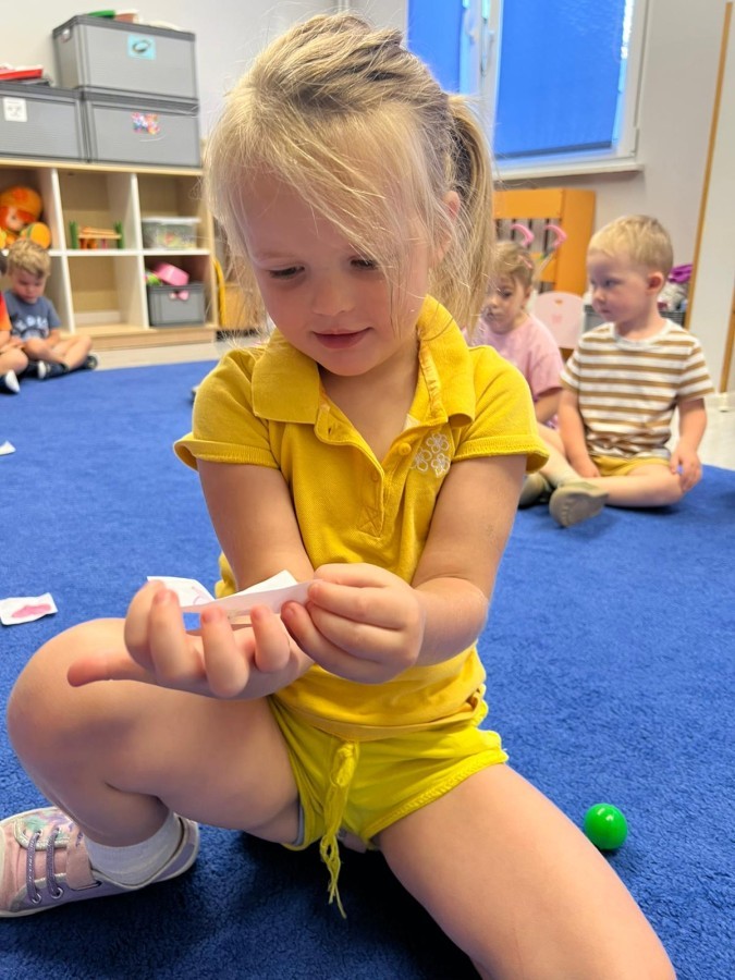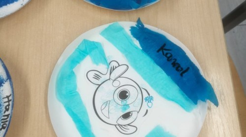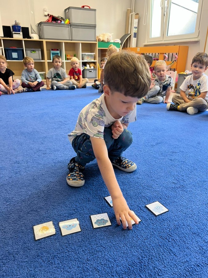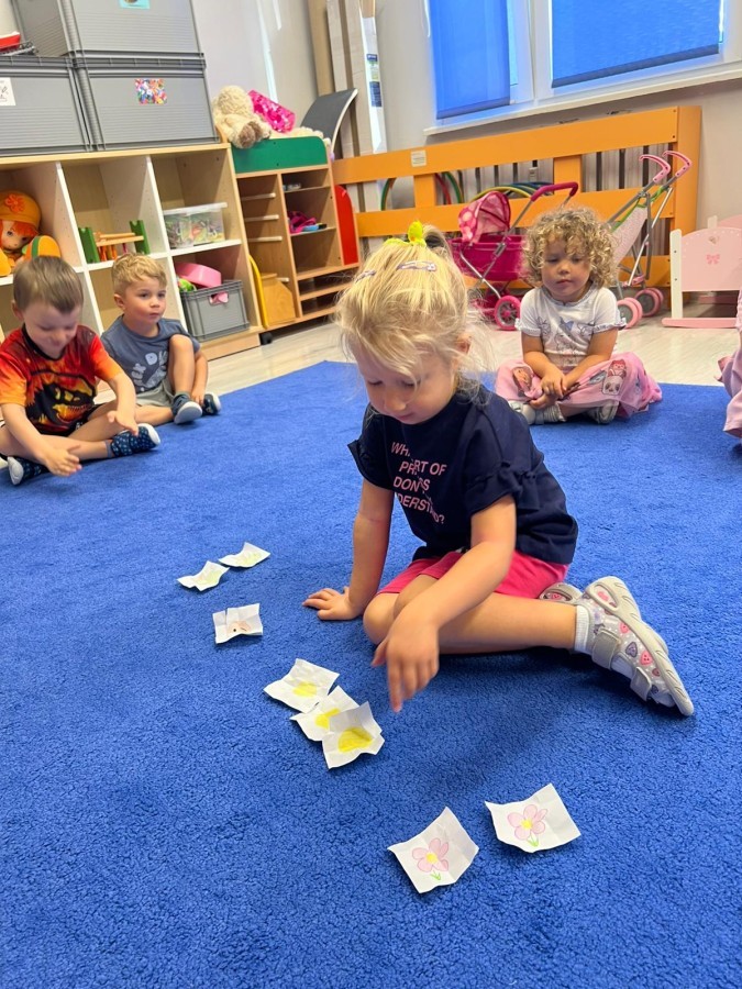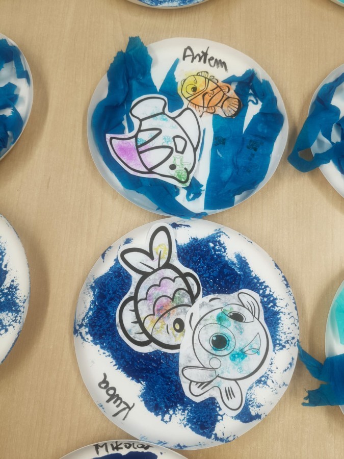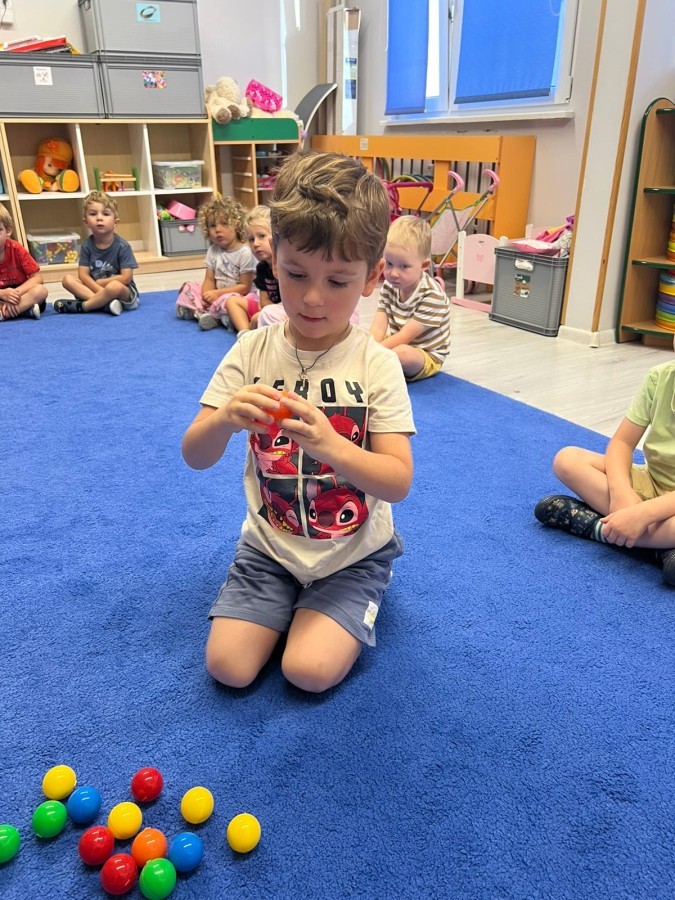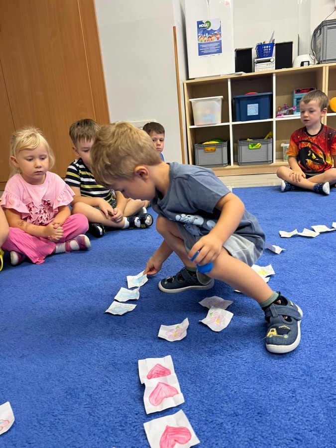 z papierowych talerzyków – tworzyły morskie krajobrazy z rybkami. Wodę malowały farbami lub wyklejały kolorową bibułą, rozwijając przy tym wyobraźnię i sprawność manualną. Kolejnym zadaniem było losowanie kuleczek z ukrytymi obrazkami. Zadaniem dzieci było dopasowanie obrazków do odpowiednich grup, a przy okazji powtórzyliśmy sobie znajomość kolorów. Ponieważ nasza grupa jest już starsza, wprowadziliśmy także kalendarz pogodowy. Dzieci codziennie uczą się rozróżniać pory roku, nazywać dni tygodnia oraz obserwować i zaznaczać, jaka jest pogoda. Pierwsze dni w przedszkolu po wakacyjnej przerwie pełne były radości, wspólnej zabawy i nauki.