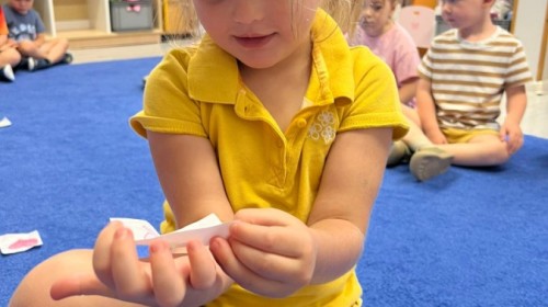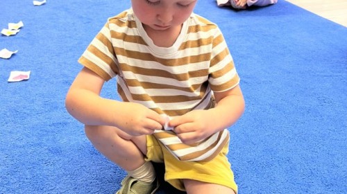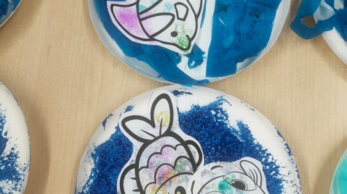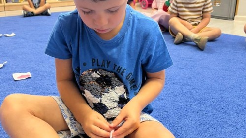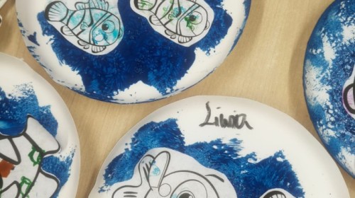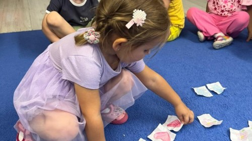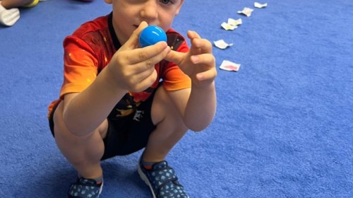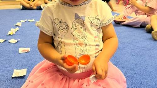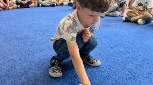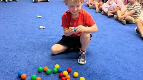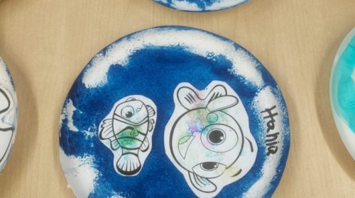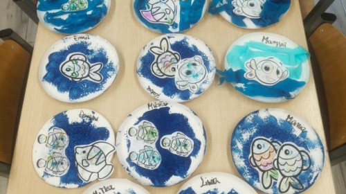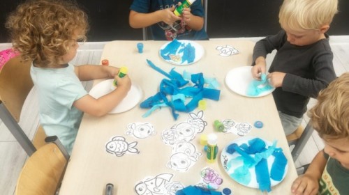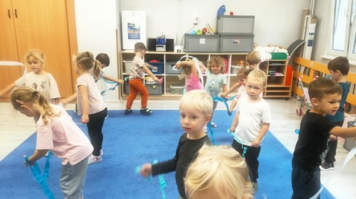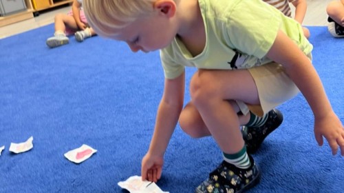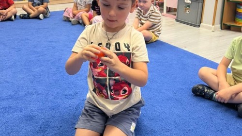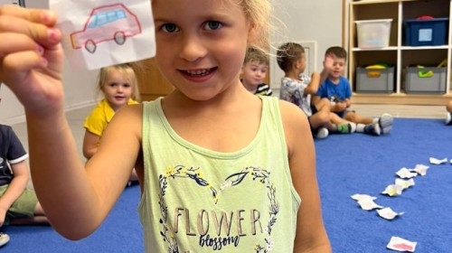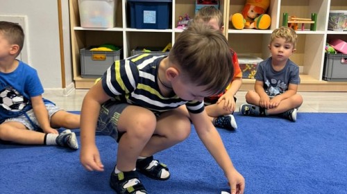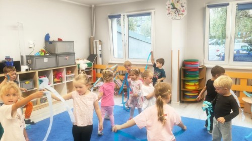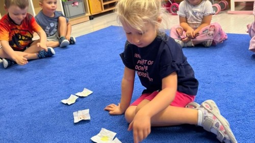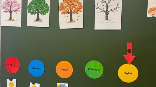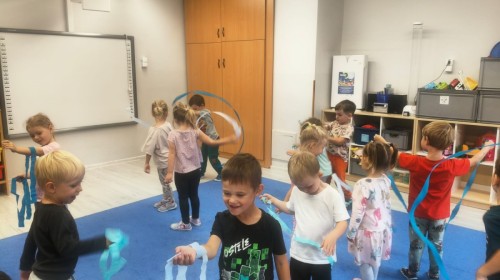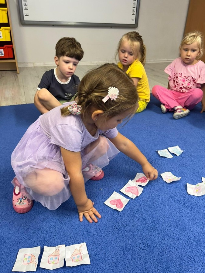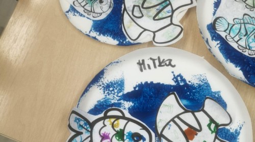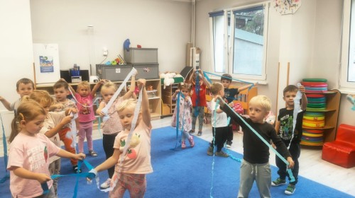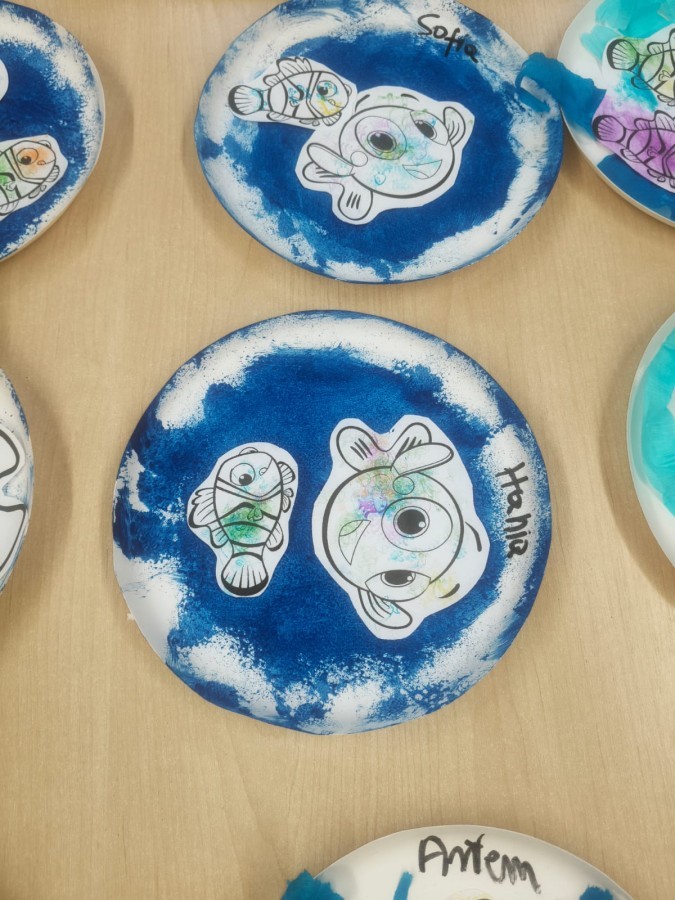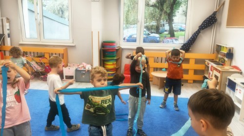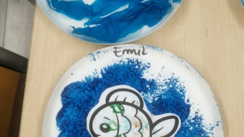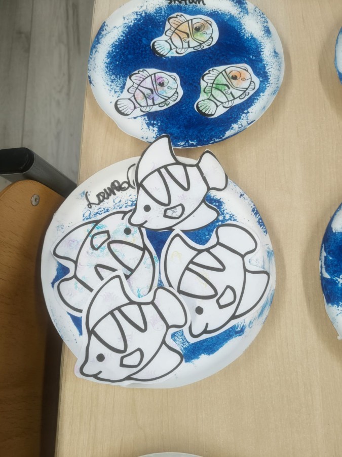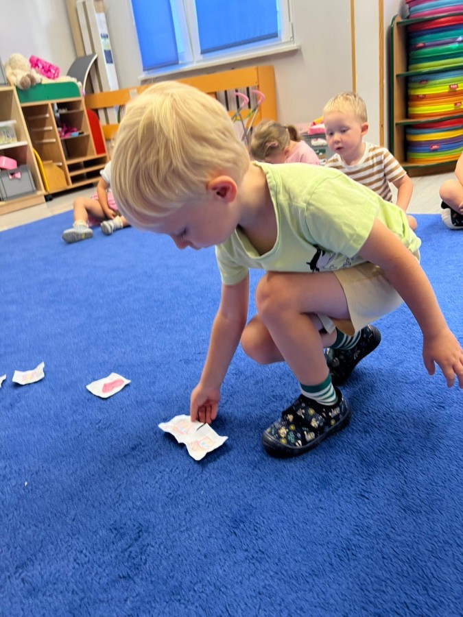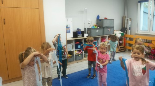 z papierowych talerzyków – tworzyły morskie krajobrazy z rybkami. Wodę malowały farbami lub wyklejały kolorową bibułą, rozwijając przy tym wyobraźnię i sprawność manualną. Kolejnym zadaniem było losowanie kuleczek z ukrytymi obrazkami. Zadaniem dzieci było dopasowanie obrazków do odpowiednich grup, a przy okazji powtórzyliśmy sobie znajomość kolorów. Ponieważ nasza grupa jest już starsza, wprowadziliśmy także kalendarz pogodowy. Dzieci codziennie uczą się rozróżniać pory roku, nazywać dni tygodnia oraz obserwować i zaznaczać, jaka jest pogoda. Pierwsze dni w przedszkolu po wakacyjnej przerwie pełne były radości, wspólnej zabawy i nauki.