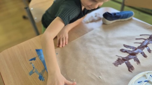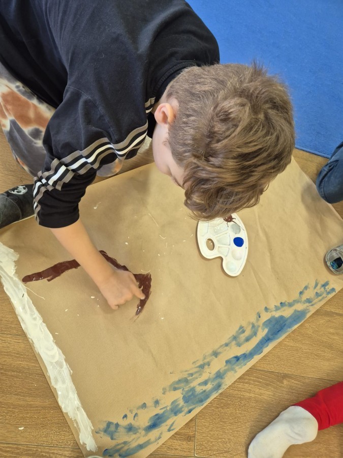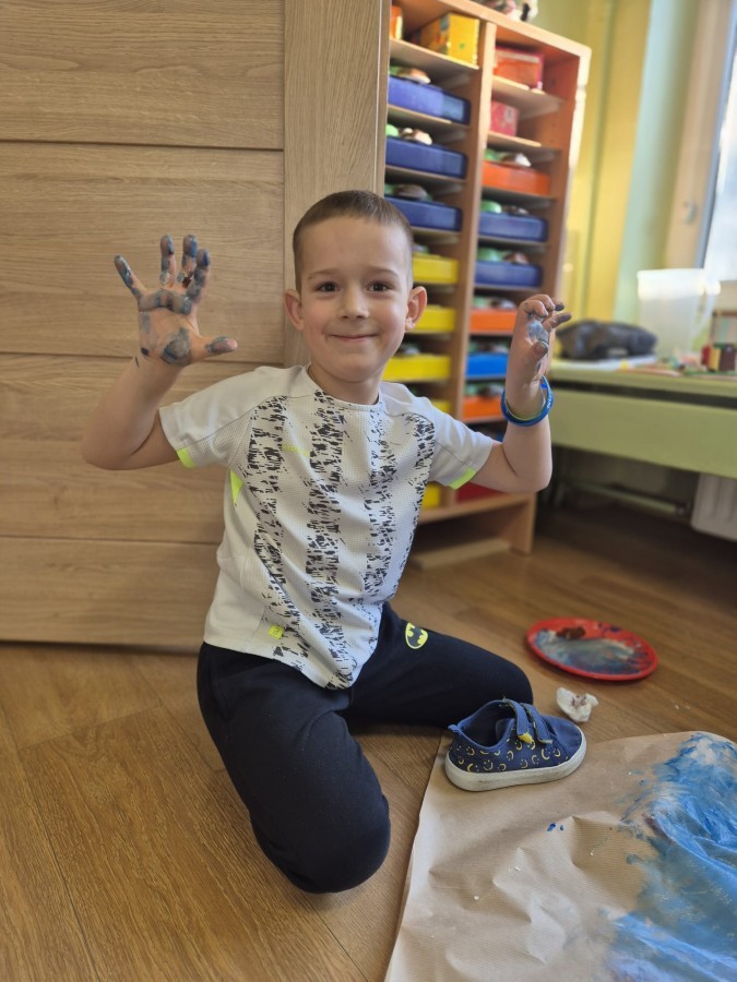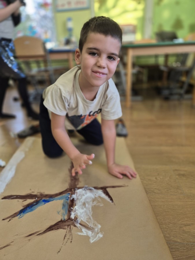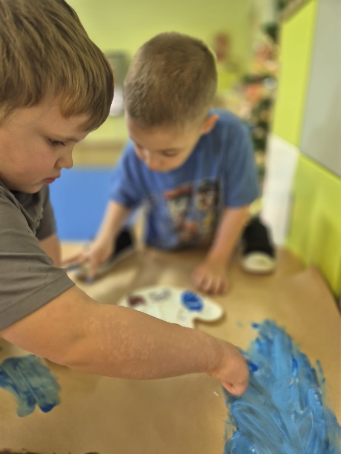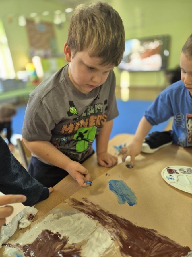 z nich malował do muzyki własną, zimową interpretację utworu „Zima” Vivaldiego. Powstały niezwykle różnorodne i kreatywne prace, pełne barw, ruchu i emocji. Zajęcia były doskonałą okazją do rozwijania wrażliwości artystycznej, kreatywności oraz umiejętności współpracy, a także do doświadczania sztuki wszystkimi zmysłami.