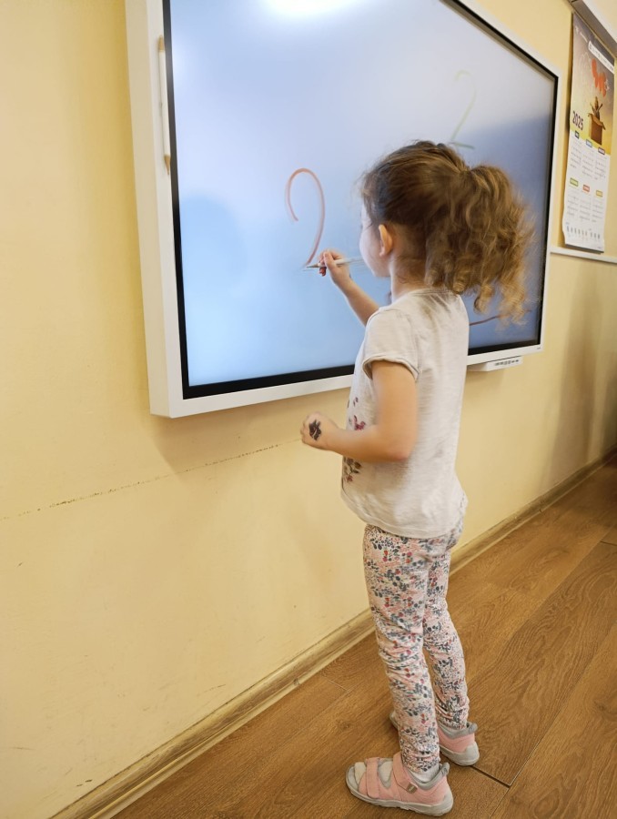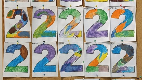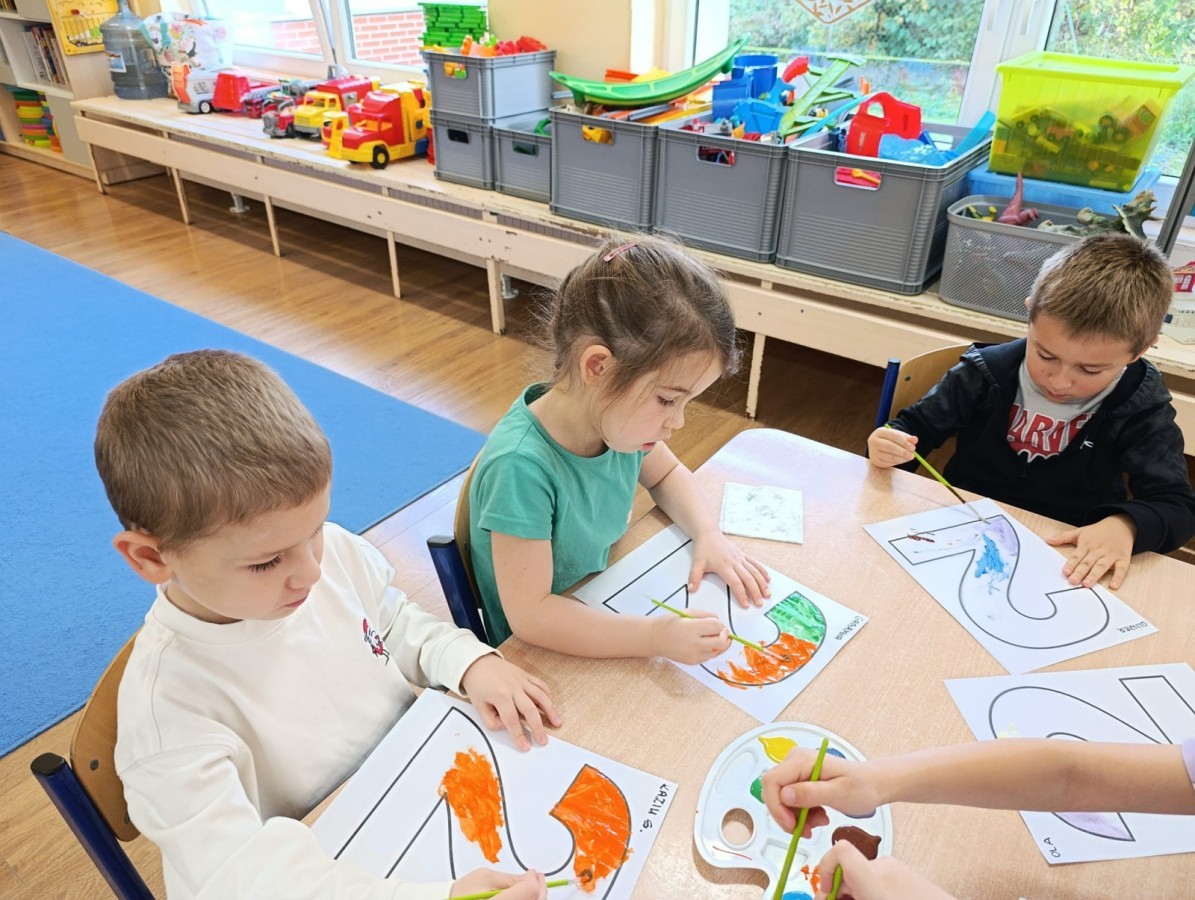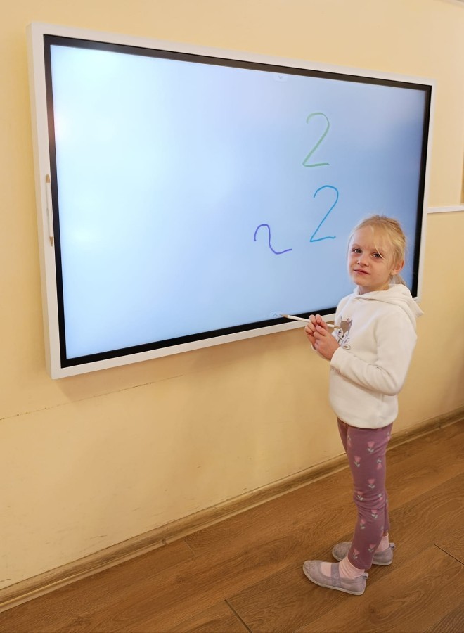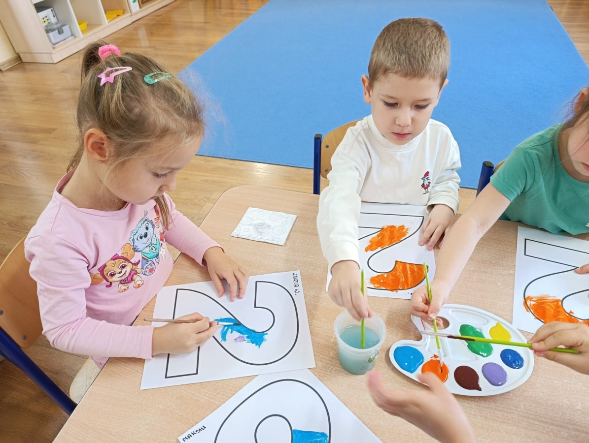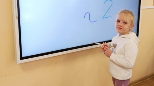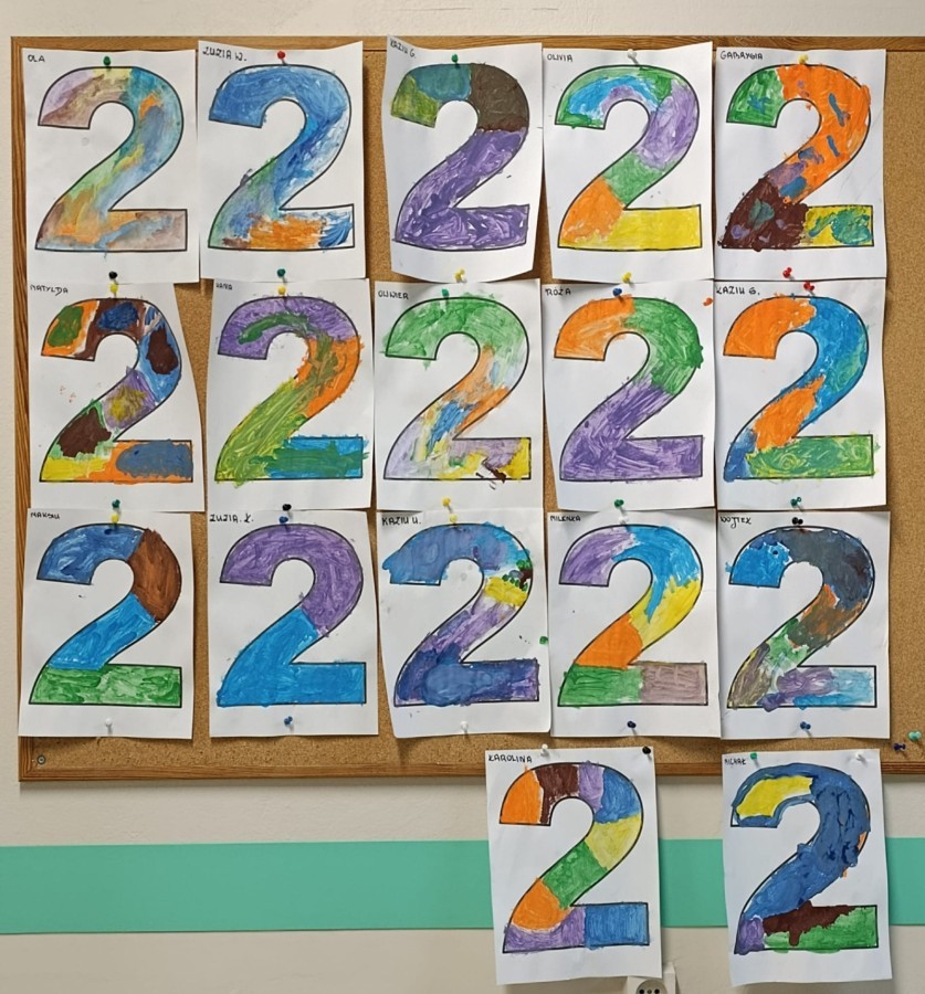 W trzecim tygodniu października w grupie "Jeżyków" poznawaliśmy cyfrę 2. Na początku wspólnie szukaliśmy przedmiotów w sali, które występują w parach – były to np. dwie ręce, dwa buty, dwie kredki czy dwa misie. Następnie "Jeżyki" ćwiczyły pisanie cyfry 2 na tablicy multimedialnej. Każde dziecko mogło spróbować własnych sił, rysując dwójkę specjalnym rysikiem. Dzieci wykonały również pracę plastyczną. Zajęcia przyniosły mnóstwo radości i satysfakcji.